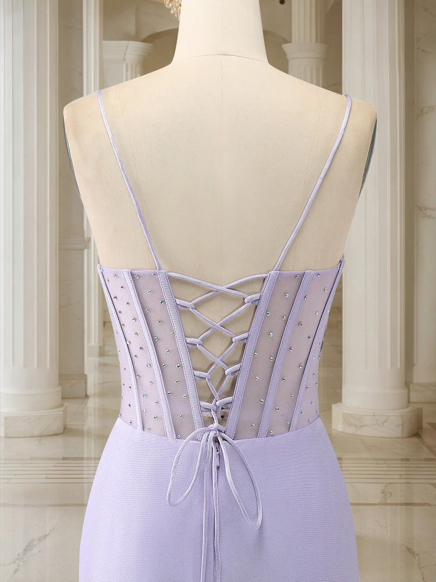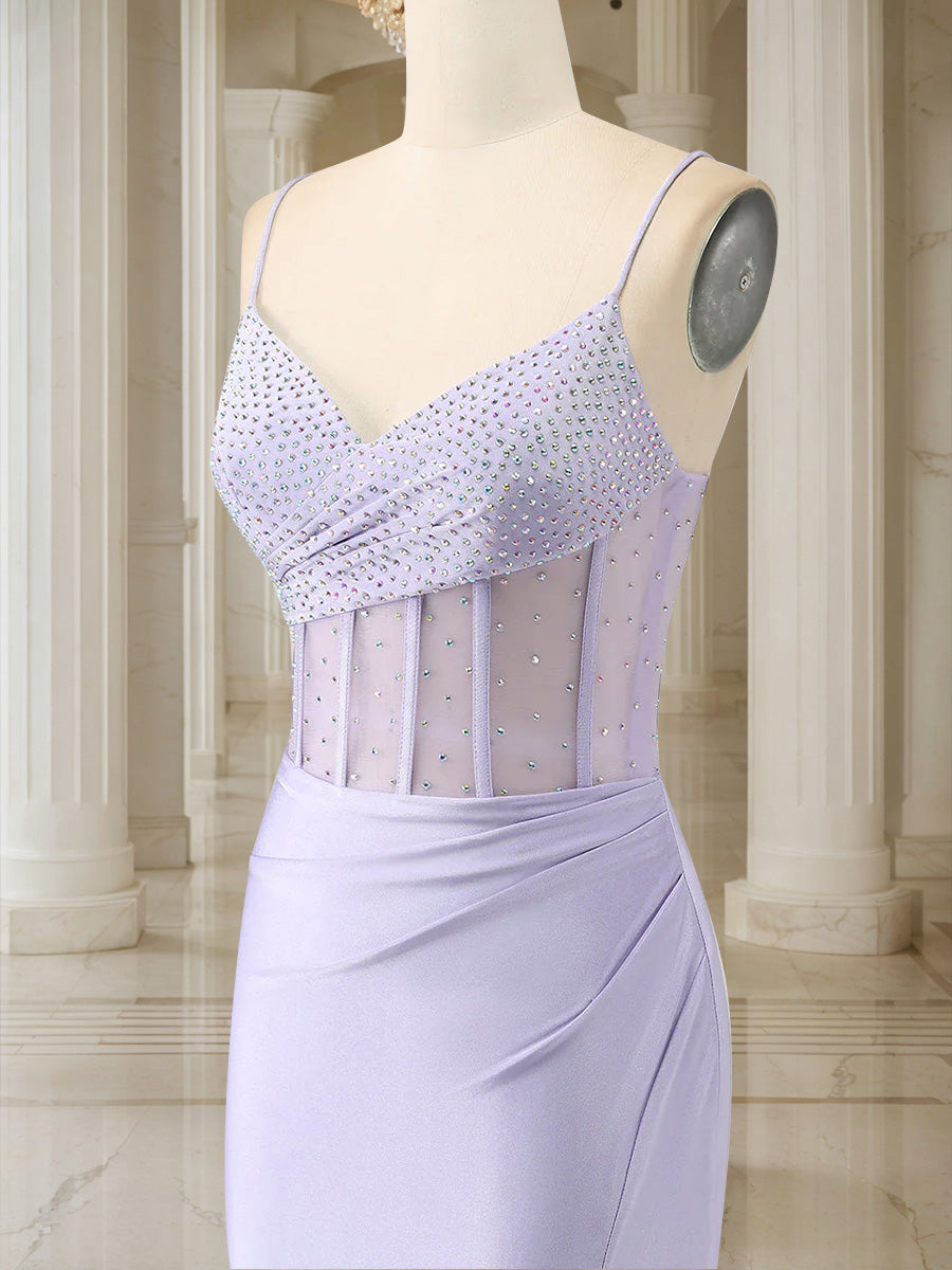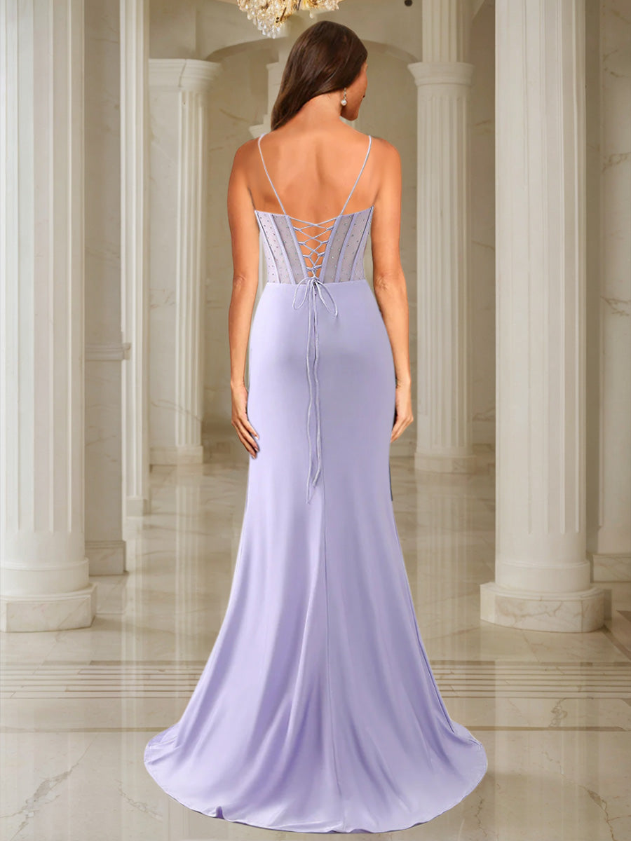 #Iyla 12010126 Trumpet/Mermaid Spaghetti Straps Pleated Satin Long Prom Dresses with Side Slit & Rhinestone