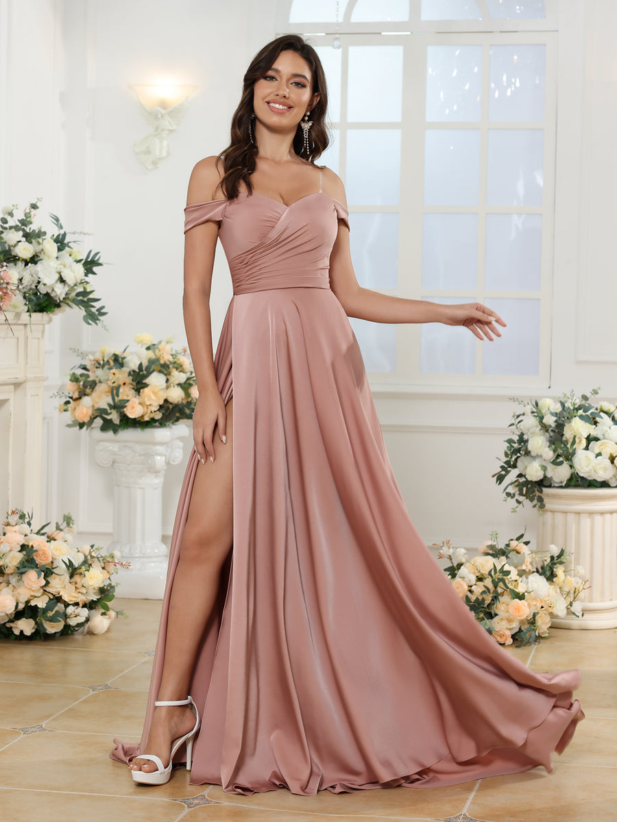 • A-Line/Princess Off-the-Shoulder Long Wedding Party Dresses with Split Side