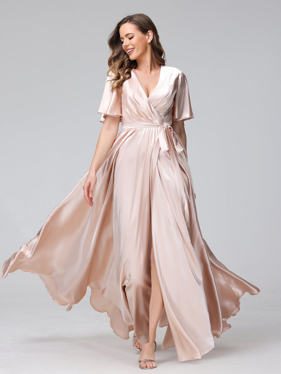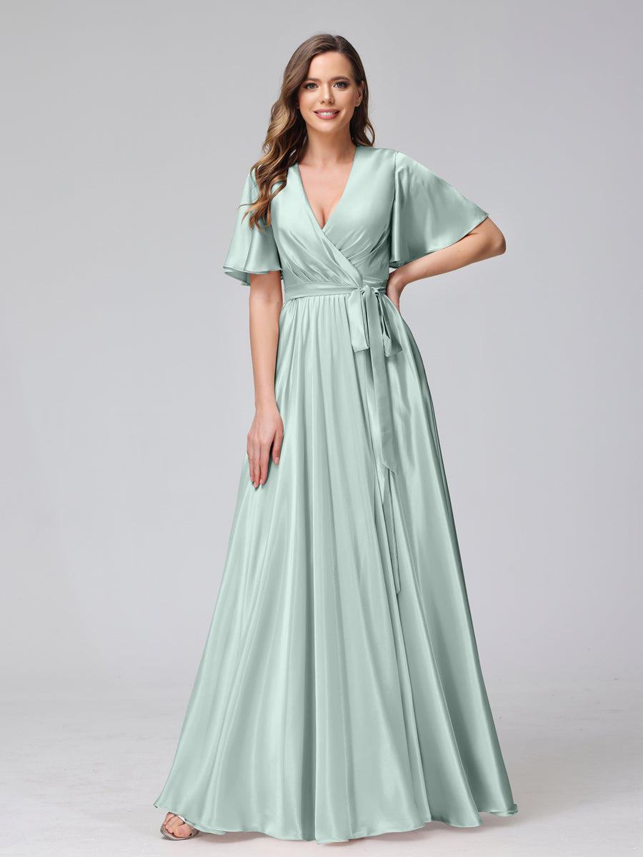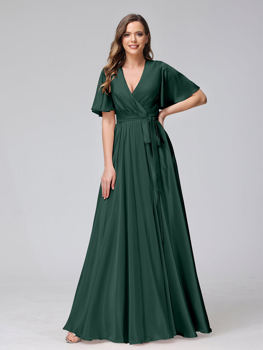 #Madelyn 9816207 A-Line V-Neck Half Sleeves Long Silk Satin Bridesmaid Dresses With Ruffles Split Side