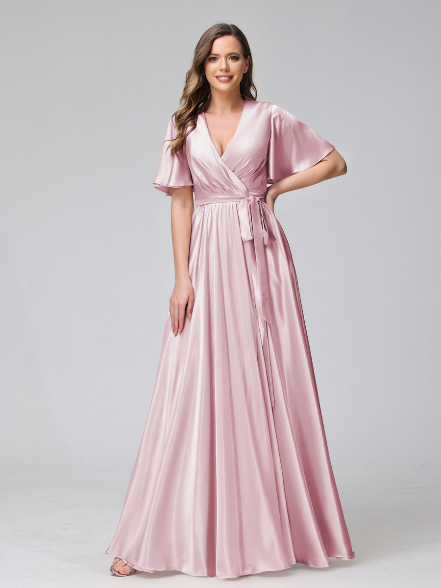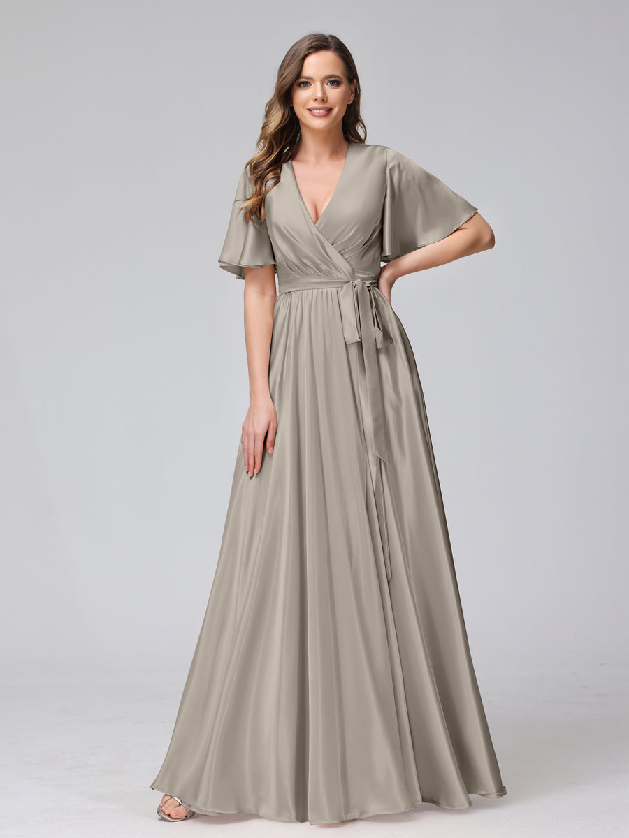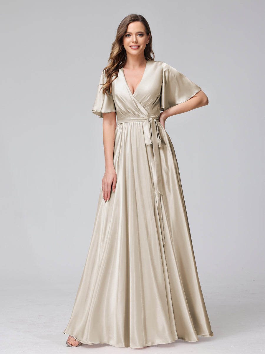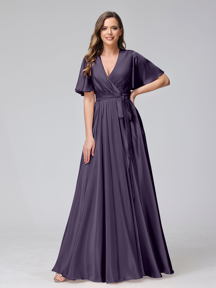 #Madelyn 9816207 A-Line V-Neck Half Sleeves Long Silk Satin Bridesmaid Dresses With Ruffles Split Side