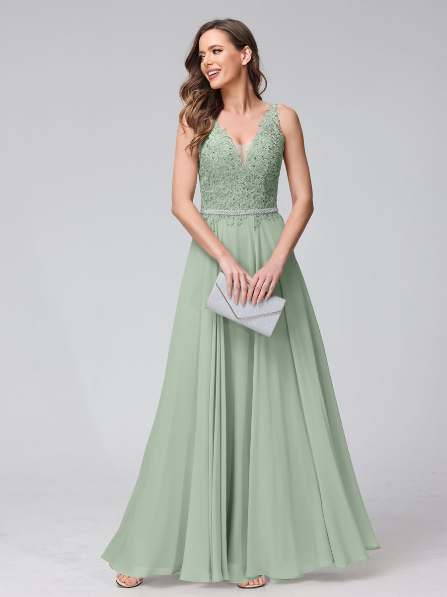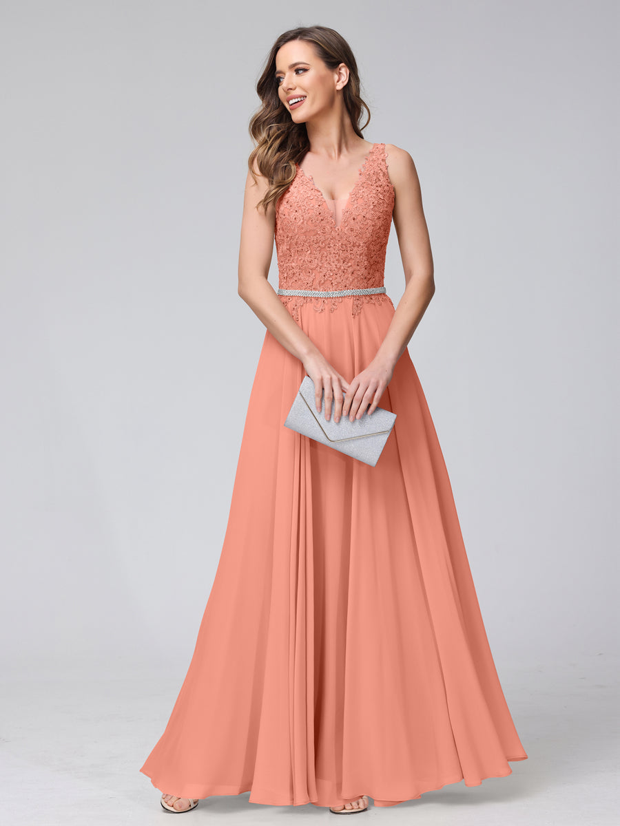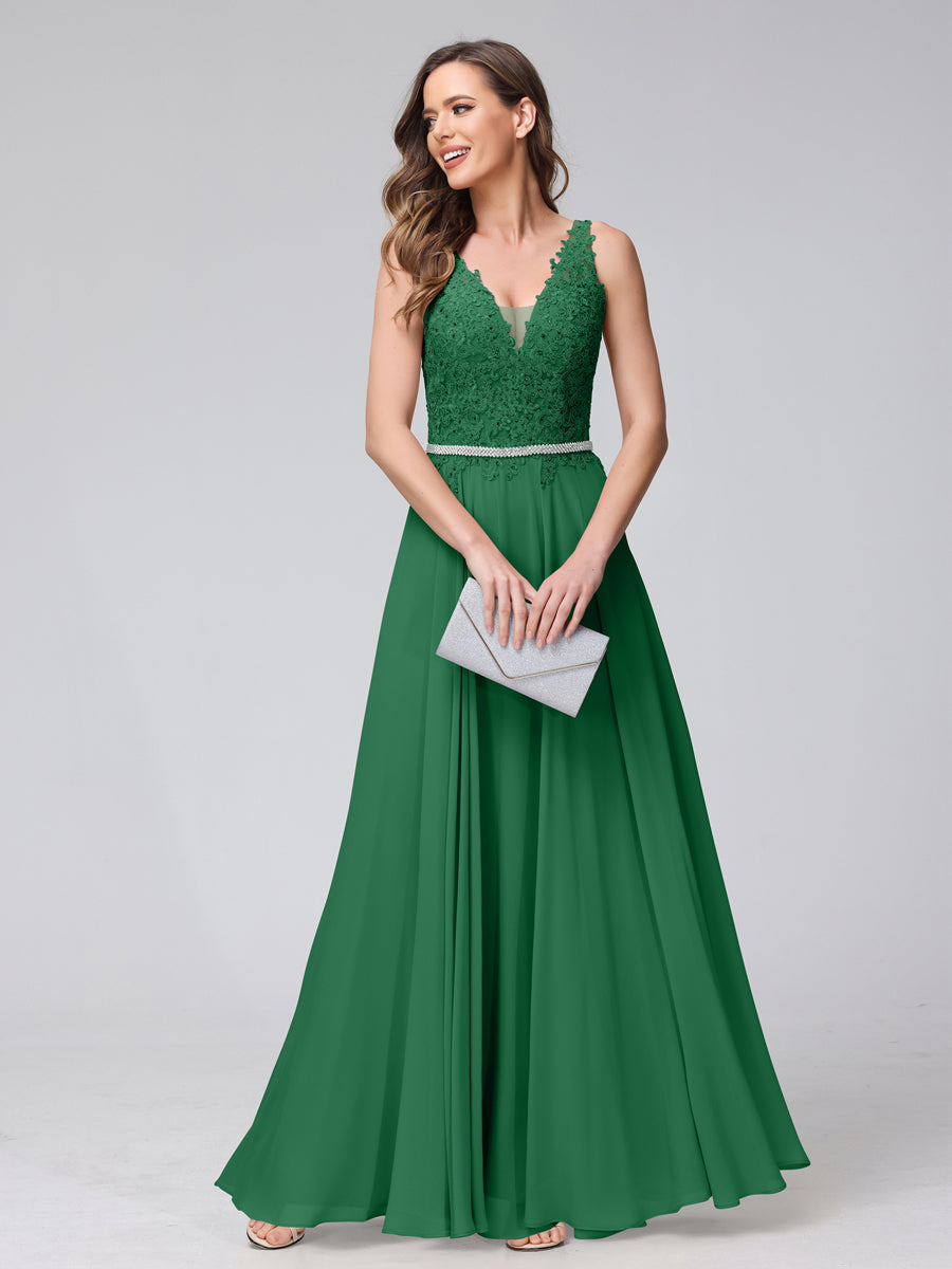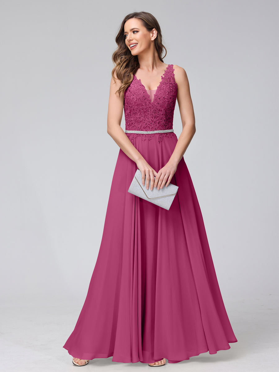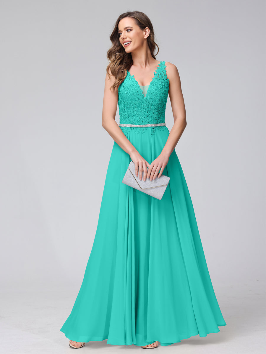 #Ruby 9816216 A-Line V-Neck Sleeveless Long Chiffon Dresses with Lace Appliques & Rhinestones