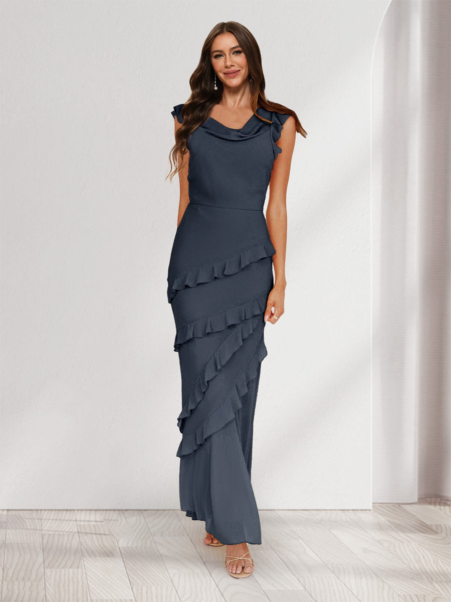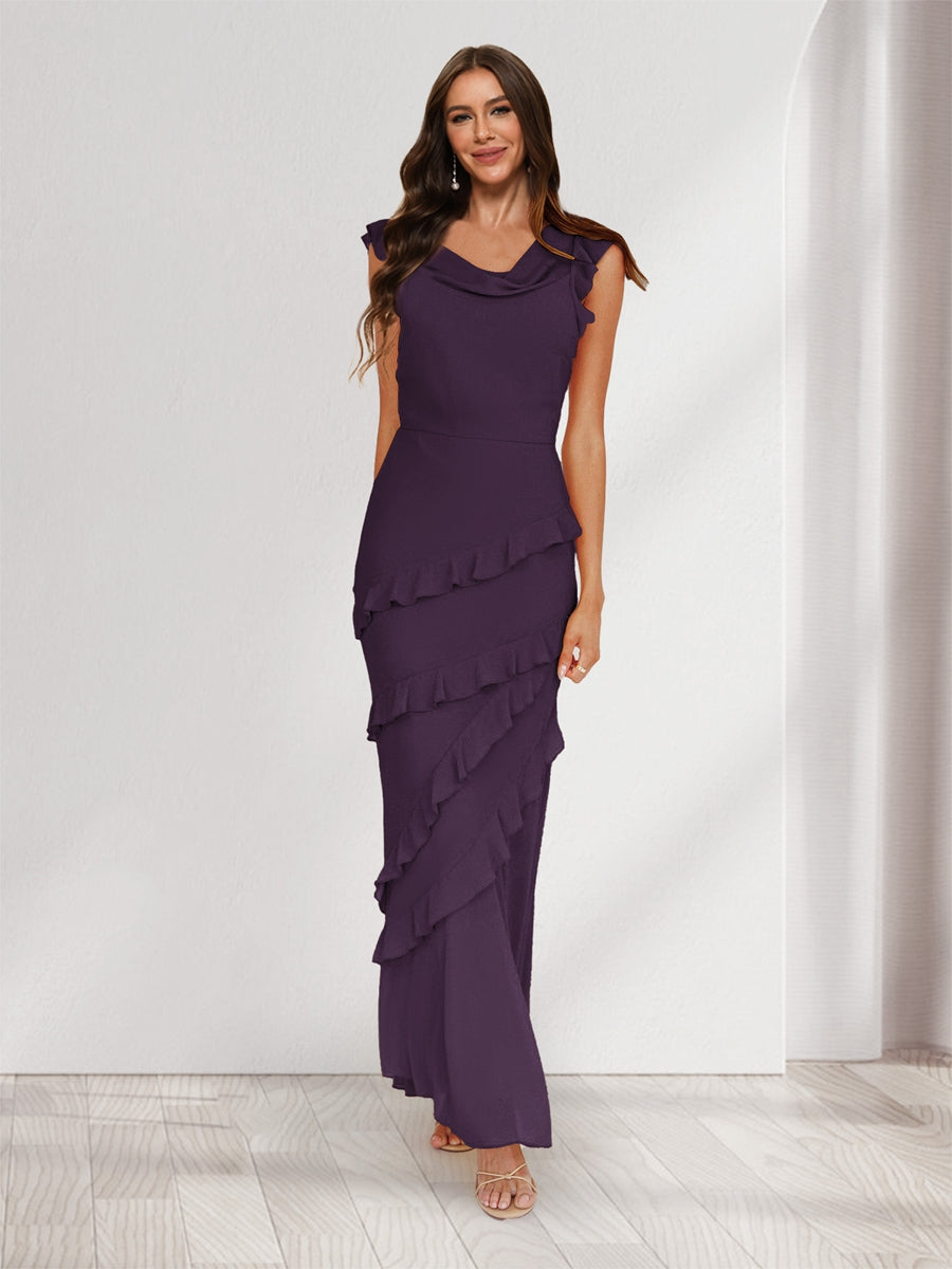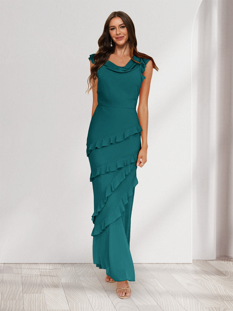 #Pitman 12011150 Sheath/Column Cowl Neck Sleeveless Ruffle Maxi Dresses Long Bridesmaid Dresses