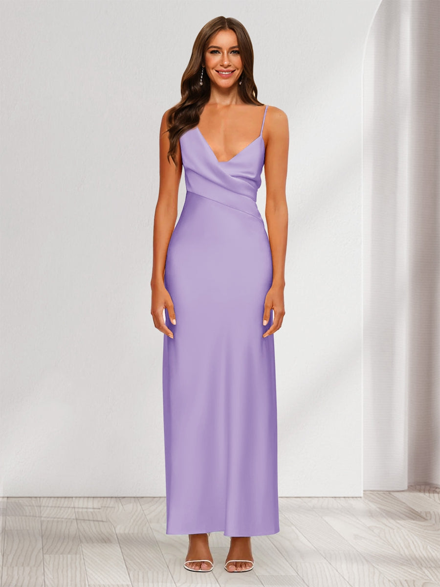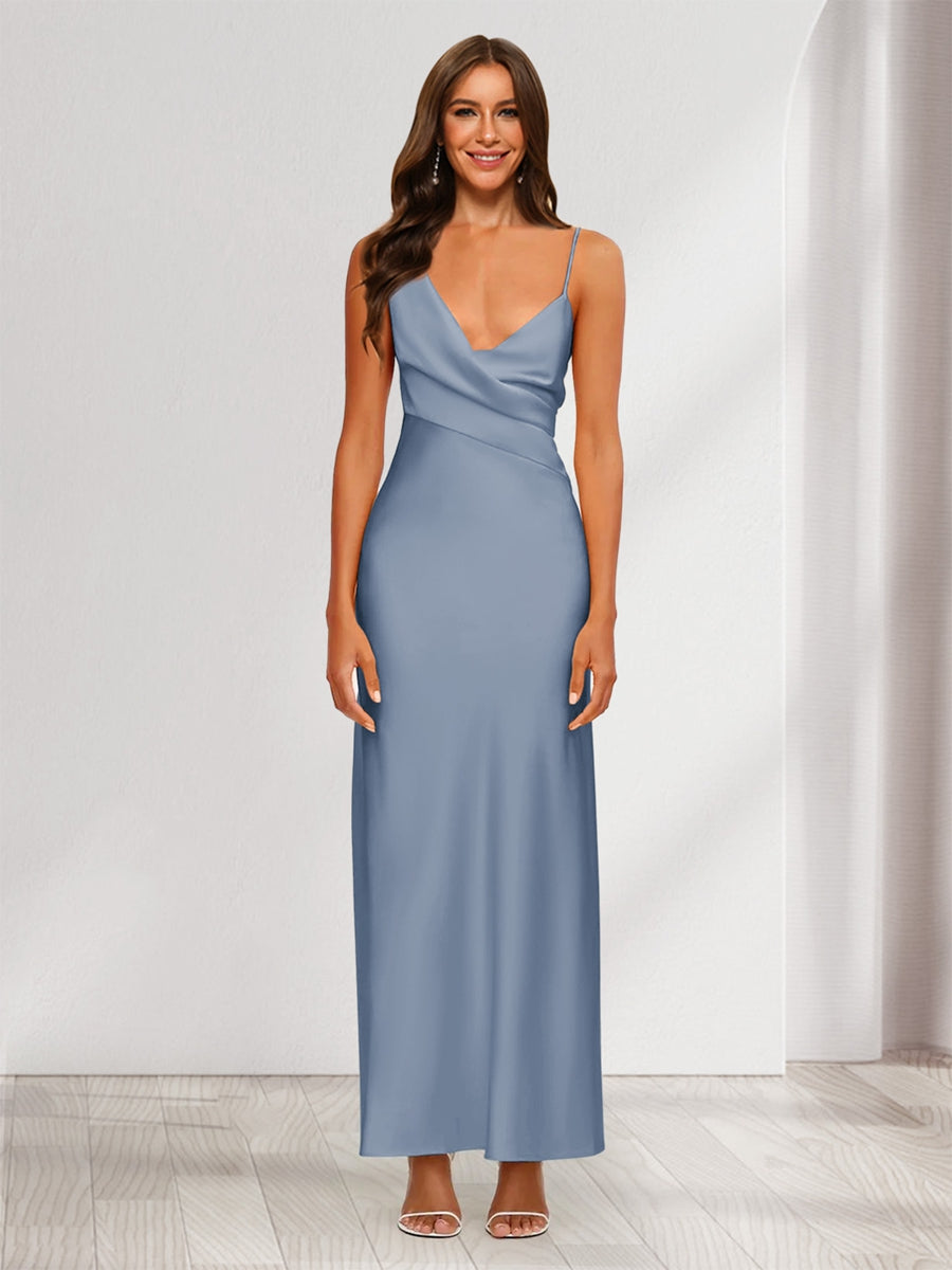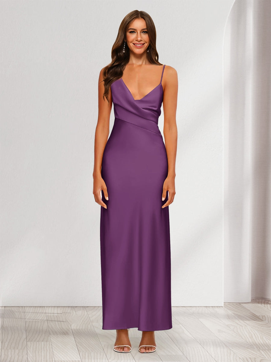 • Sheath/Column V-Neck Ruched Ankle-Length Satin Evening Dresses