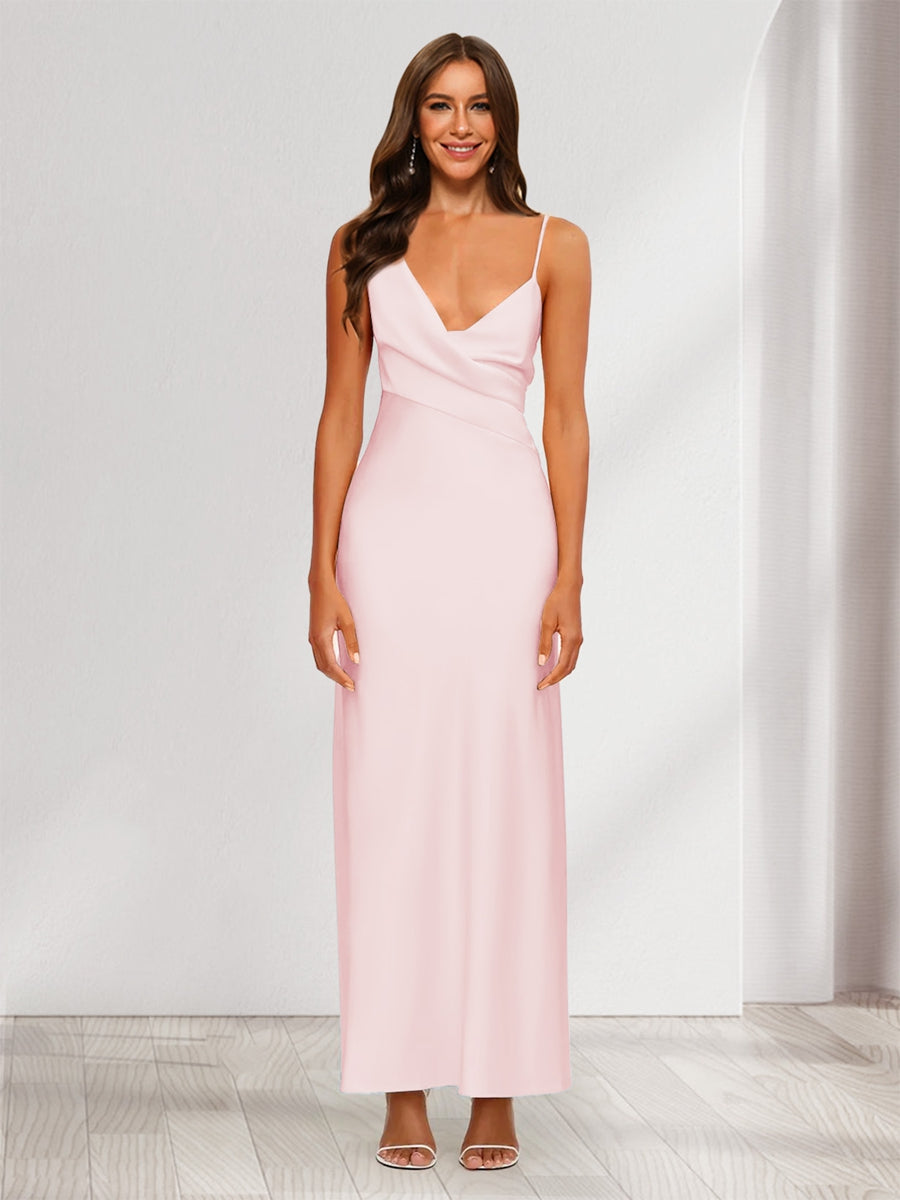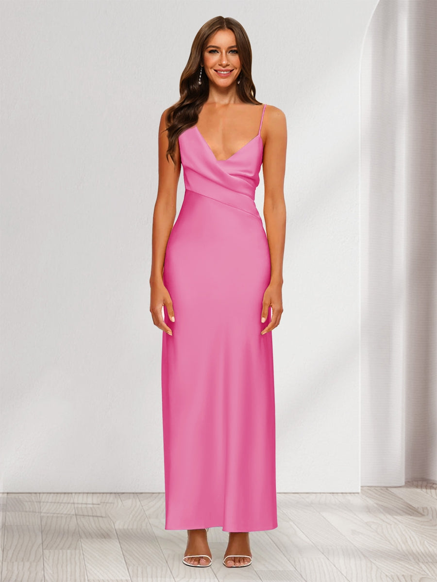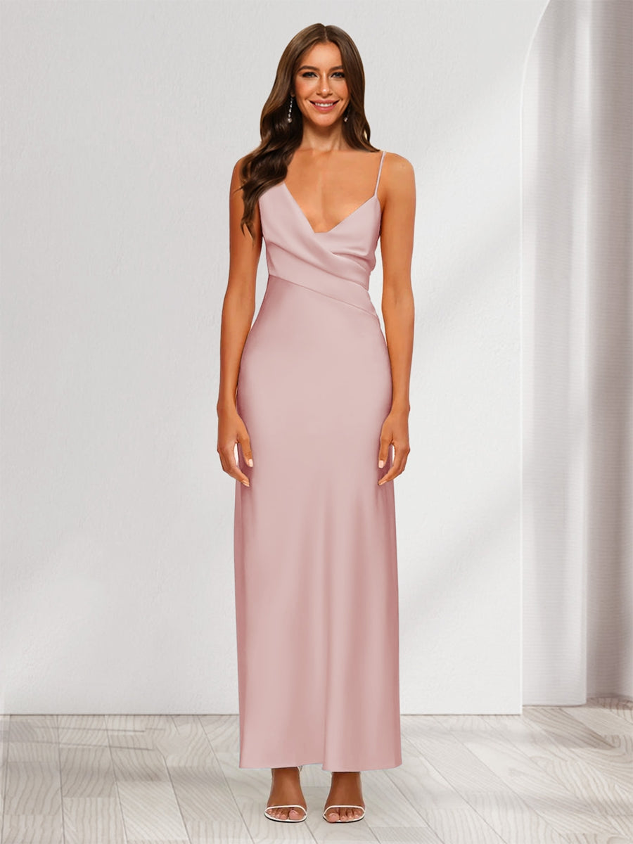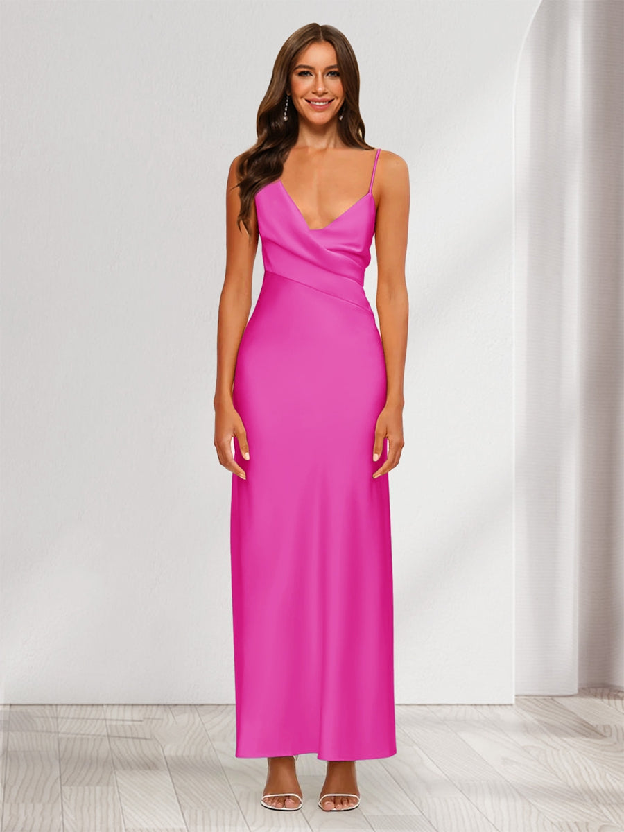 • Sheath/Column V-Neck Ruched Ankle-Length Satin Evening Dresses