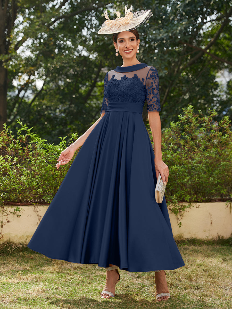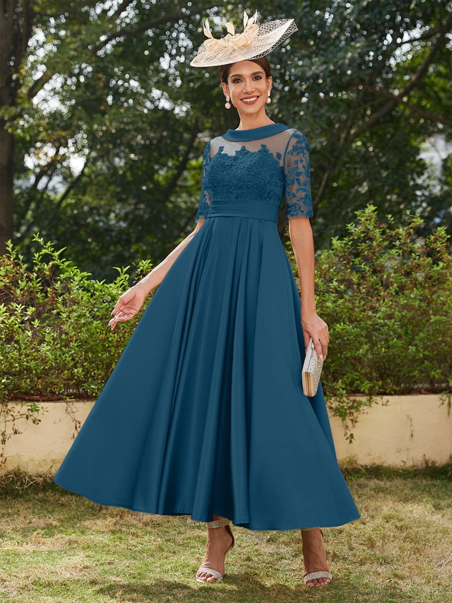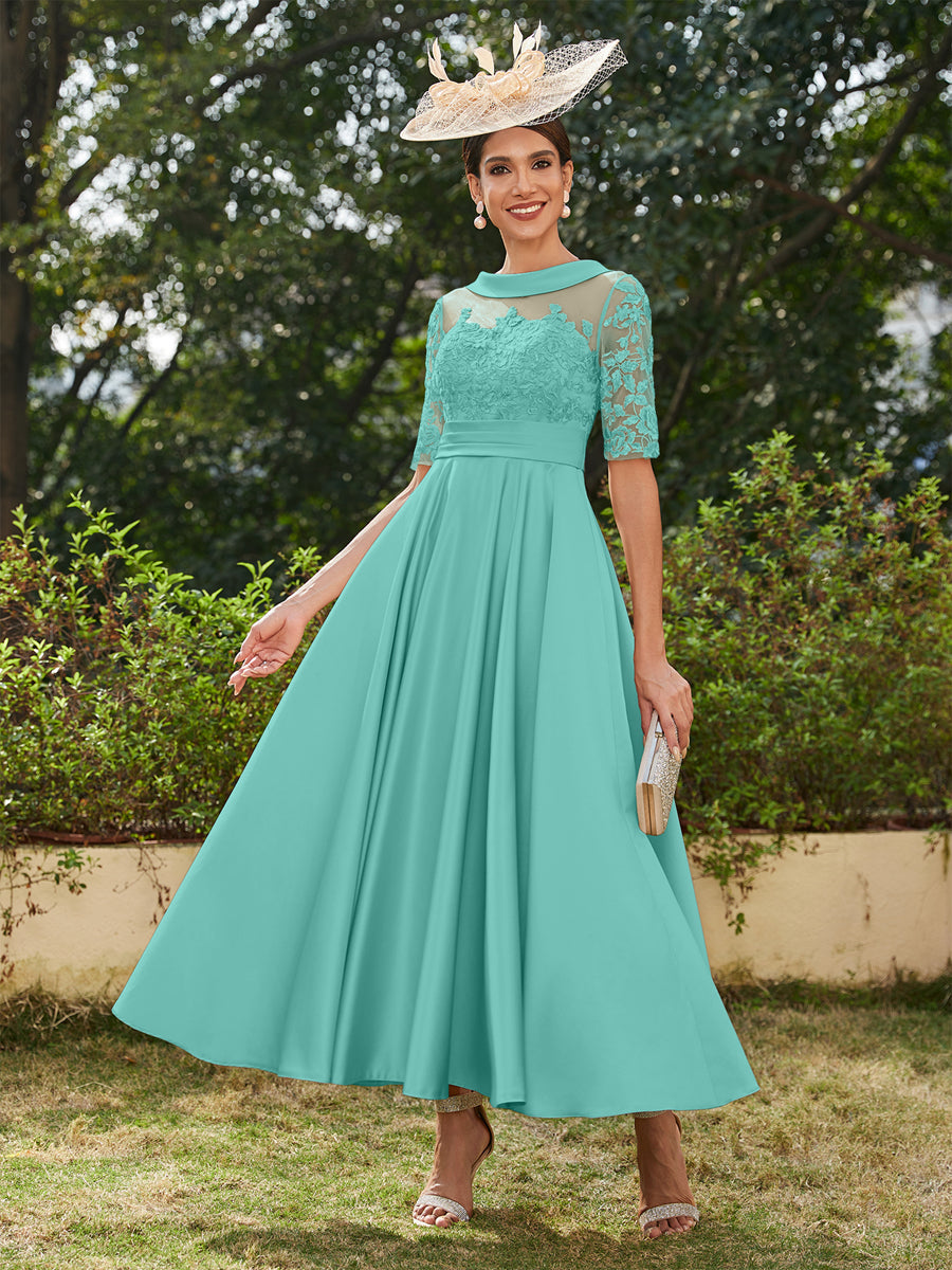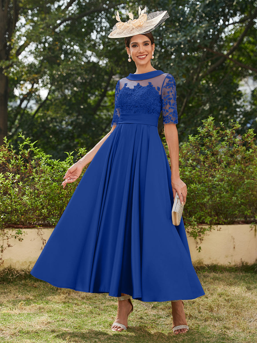 • A-Line/Princess Scoop Half Sleeves Ankle-Length Long Evening Dresses with Appliques
