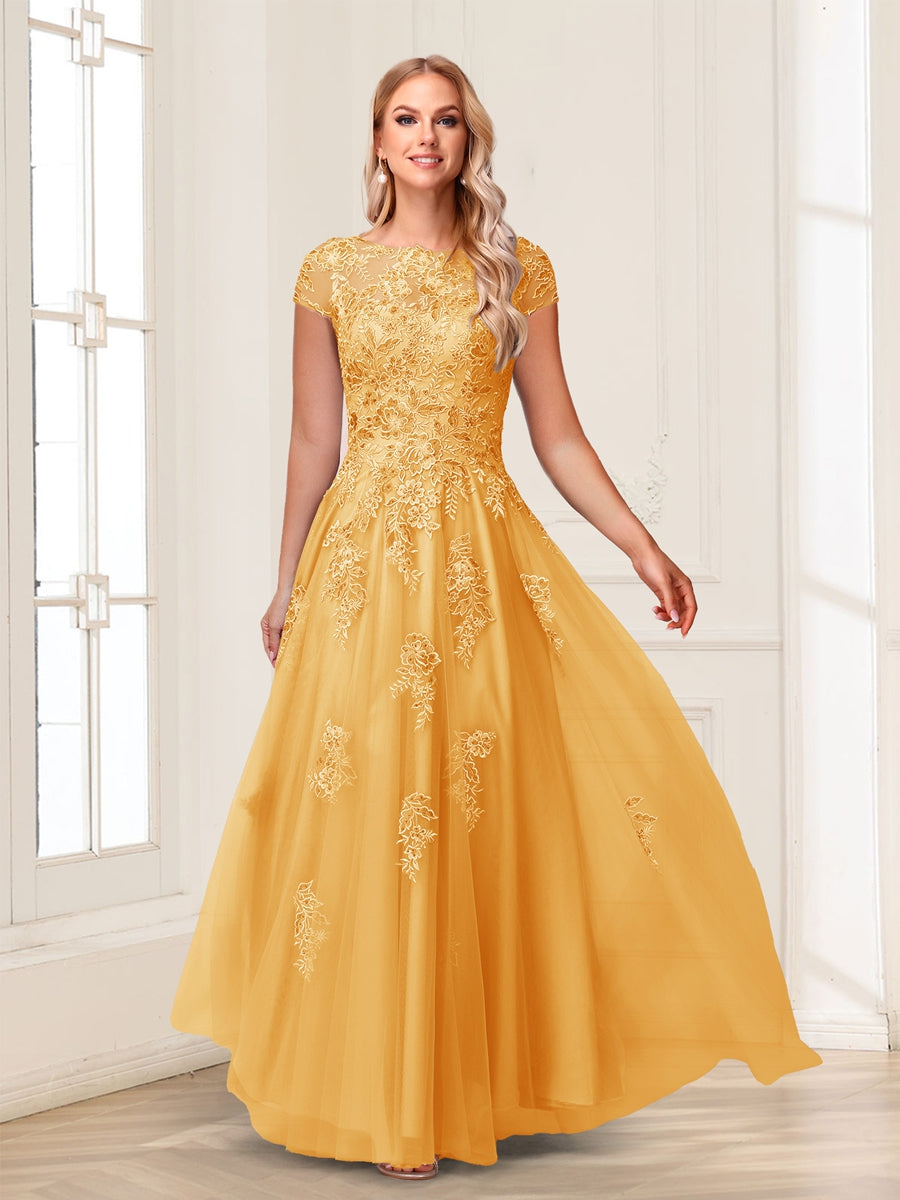 • A-Line/Princess Sheer Neck Short Sleeves Long Formal Evening Dresses with Beading & Appliques
