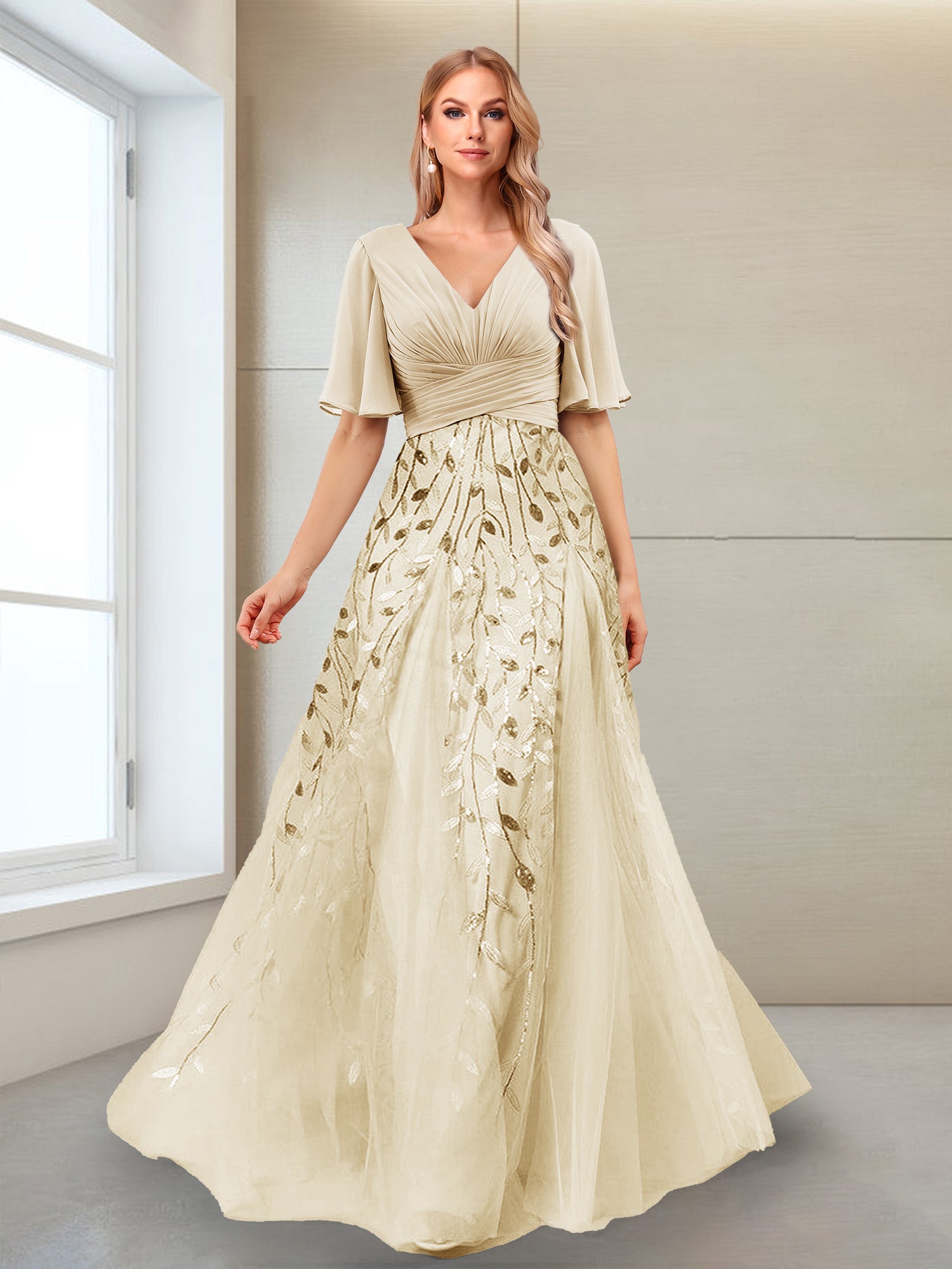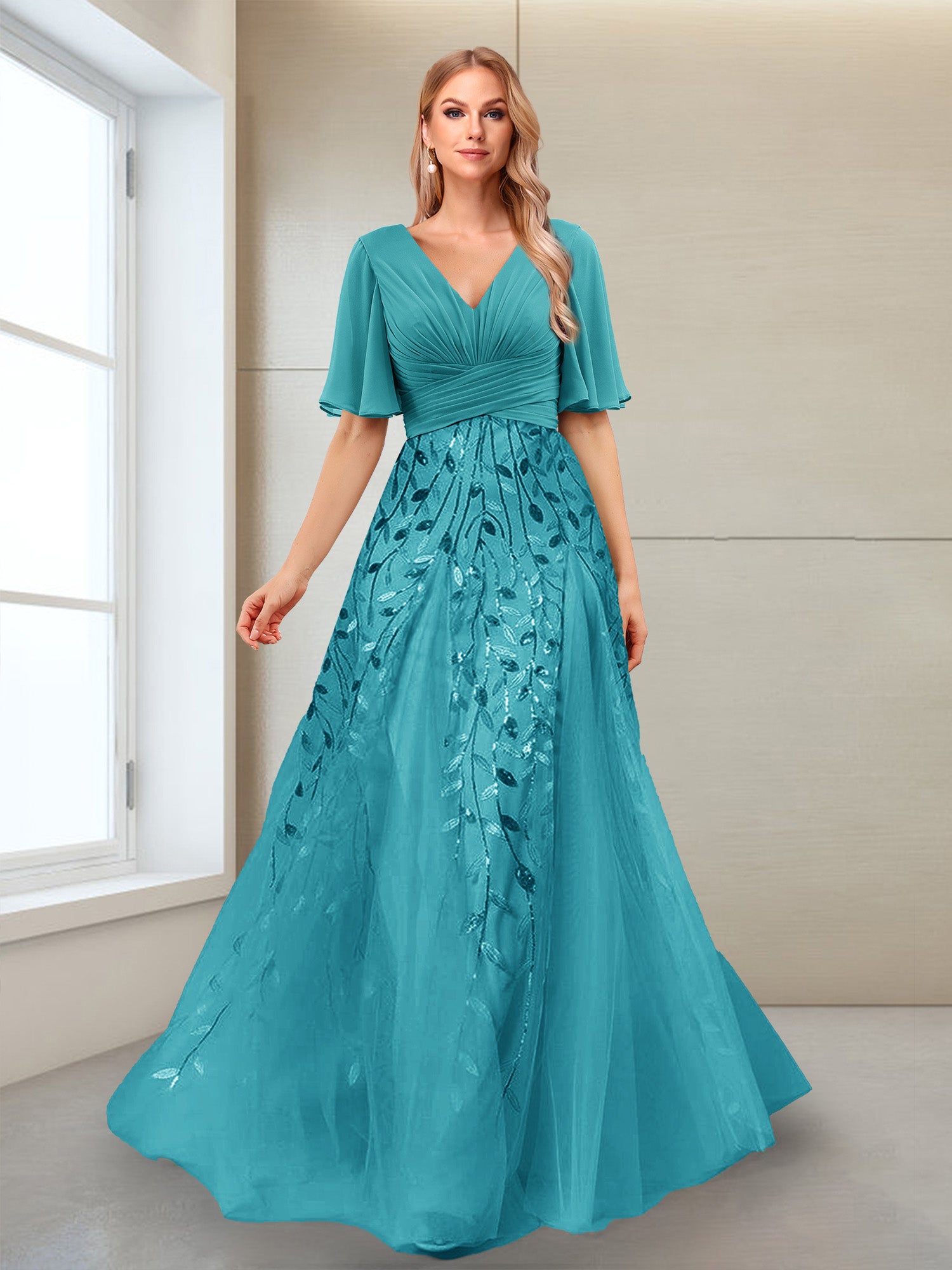 • A-Line V-Neck Half Sleeves Split Side Mother of the Bride Dresses with Appliques