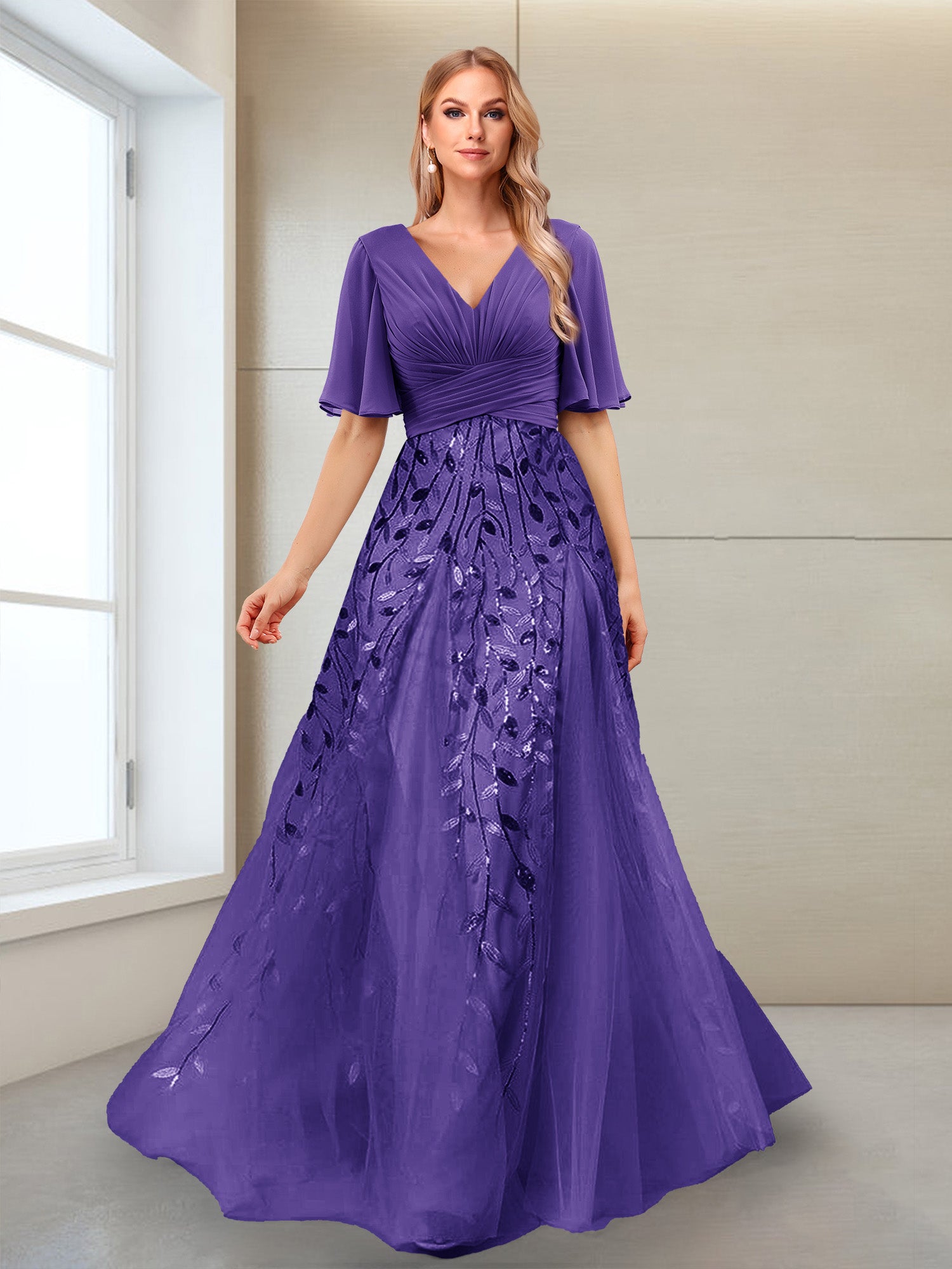 #Pansy 12011100 A-Line V-Neck Half Sleeves Split Side Mother of the Bride Dresses with Appliques