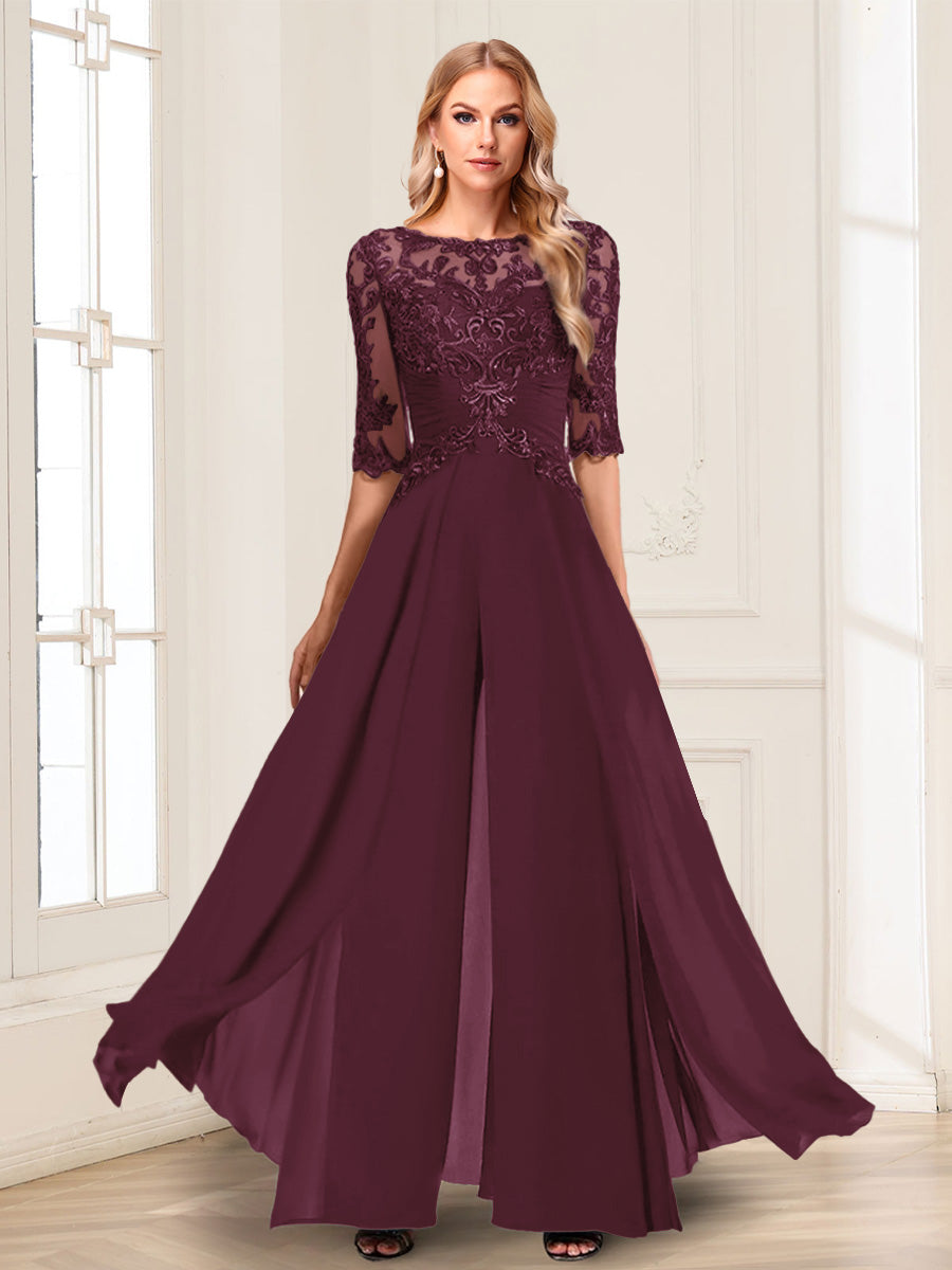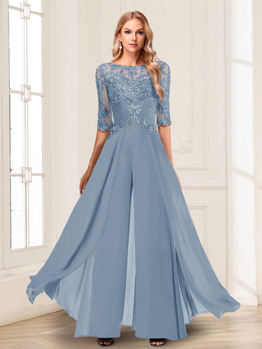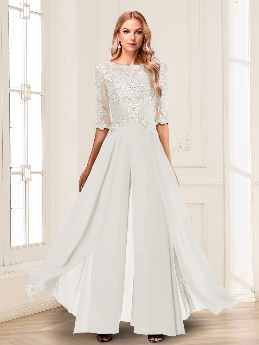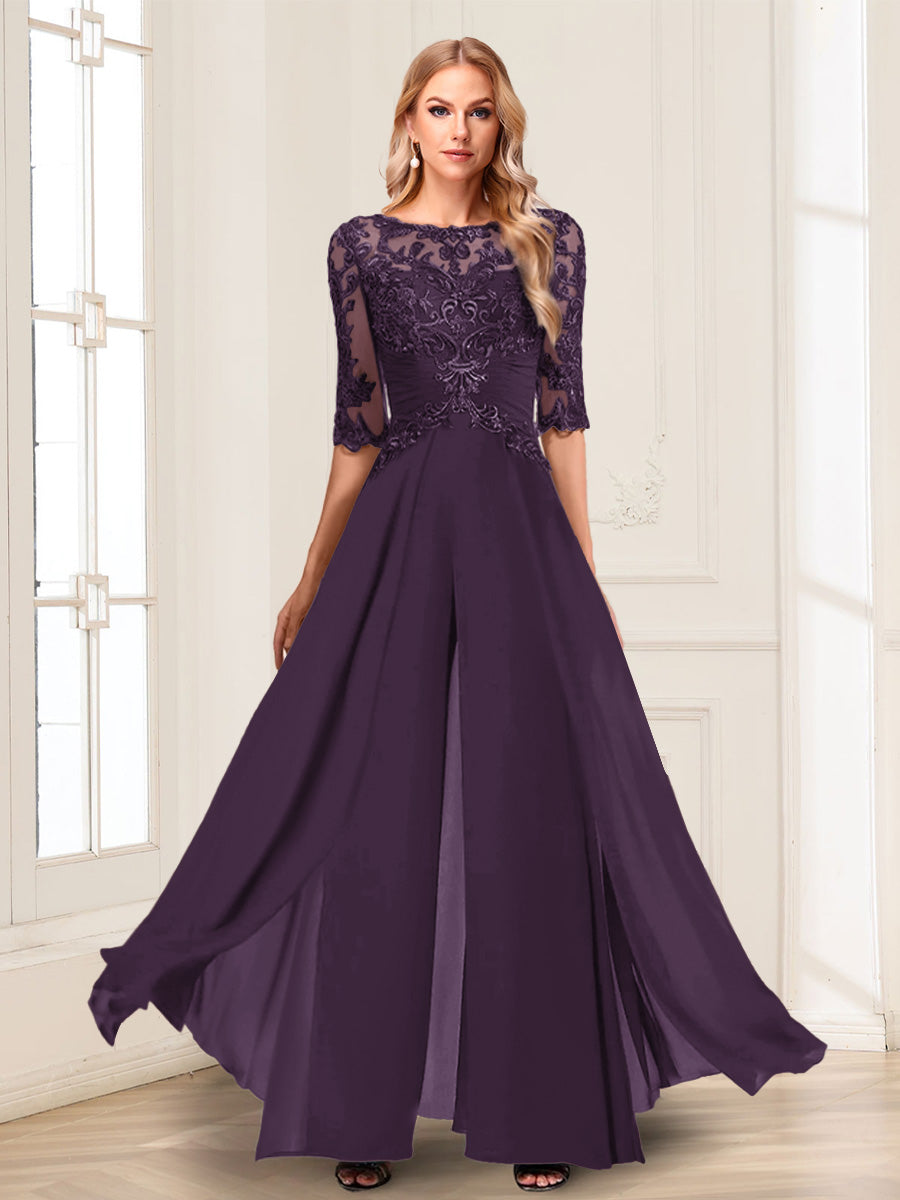 #Eulalia B12010047 Chiffon Floor-Length Half Sleeves Scoop Mother of the Bride Pantsuits
