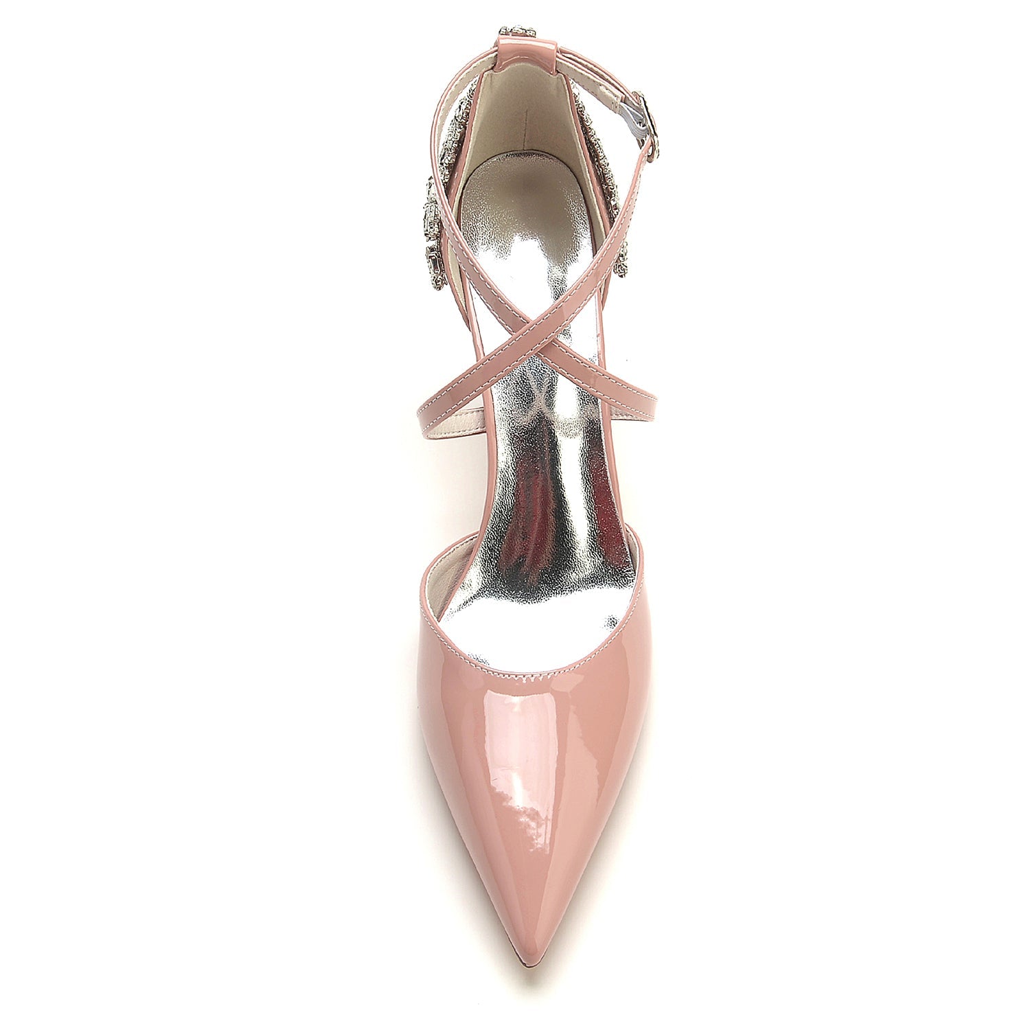#SHU1963X59A Women's Patent Leather Mirror Finish Ankle Strap Rhinestone Closed Toe Stiletto Heel Wedding Shoes