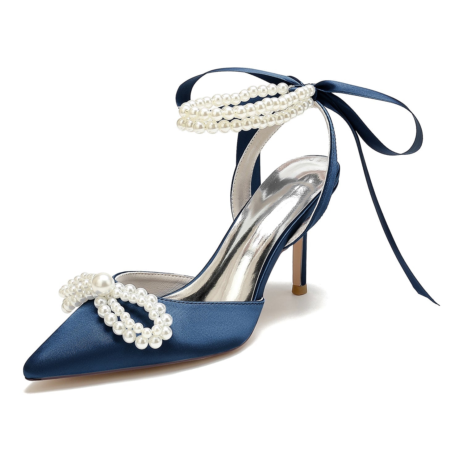 #SH1963X29SS Women's Silk Satin With Ankle Strap Lace-up Pearl Closed Toe Stiletto Heel Party Shoes
