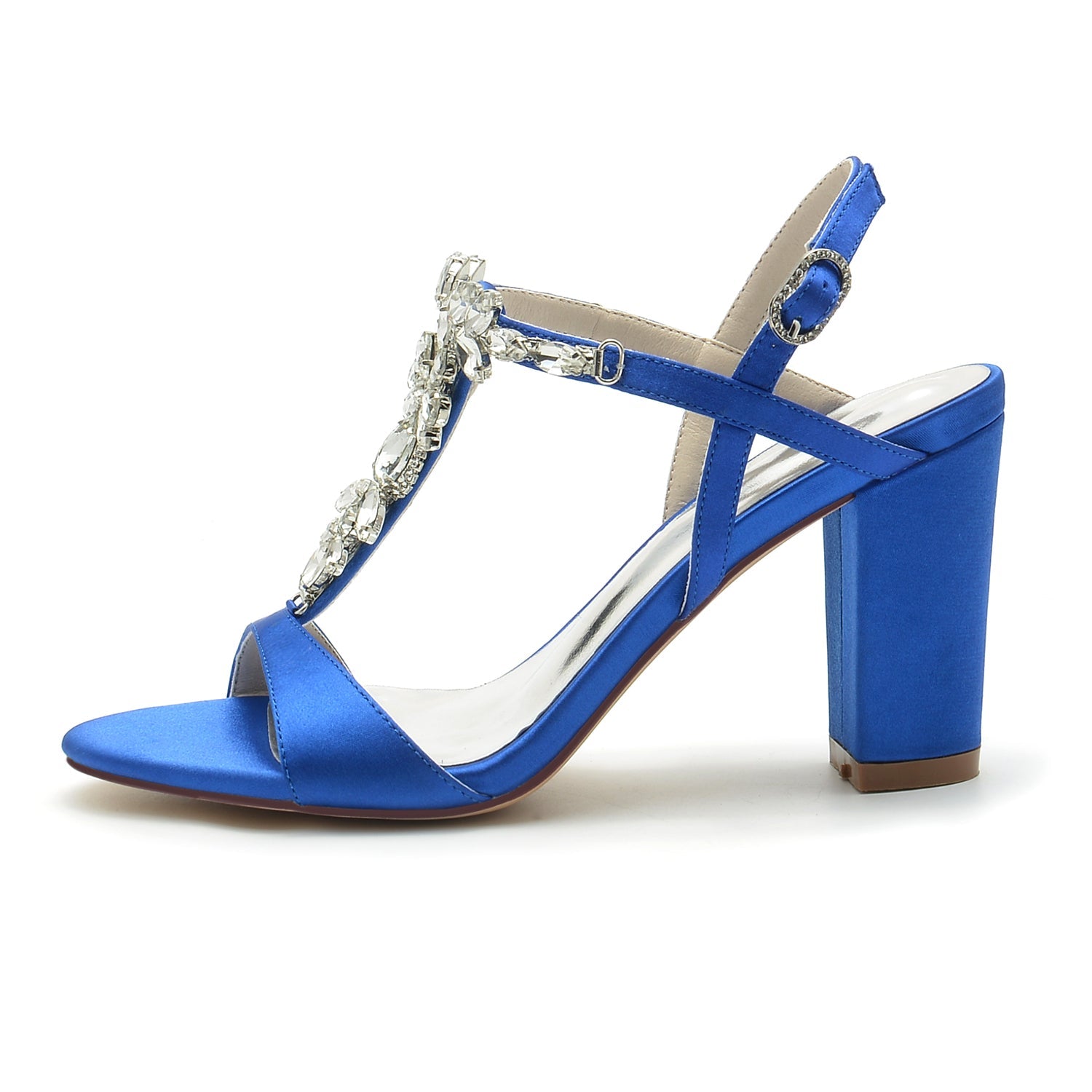 #SH2022X21 Women's Silk Satin With Ankle Strap Peep Toe Rhinestone Chunky Heel Wedding Shoes