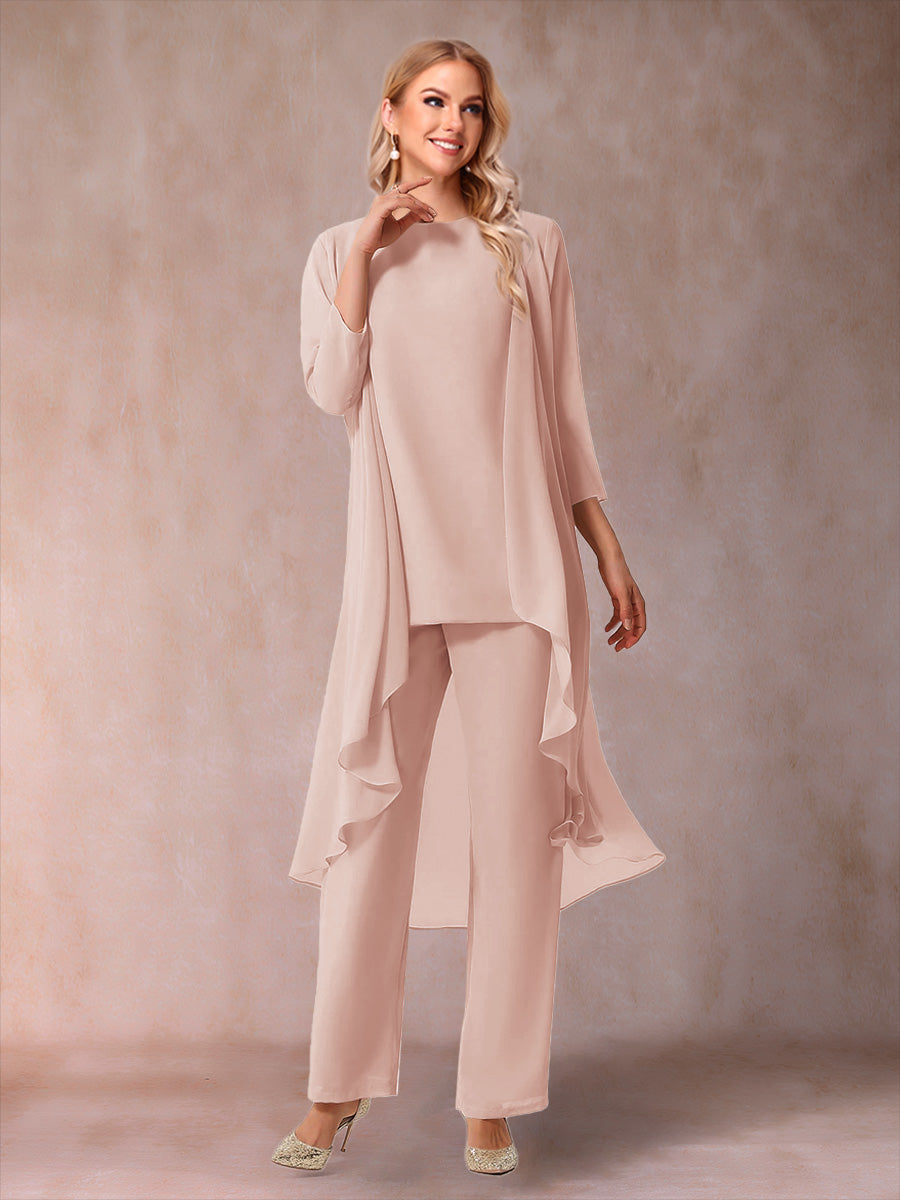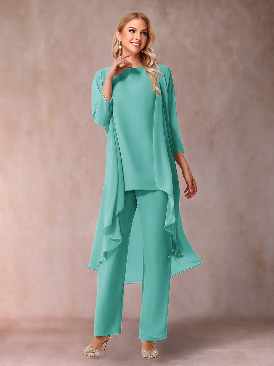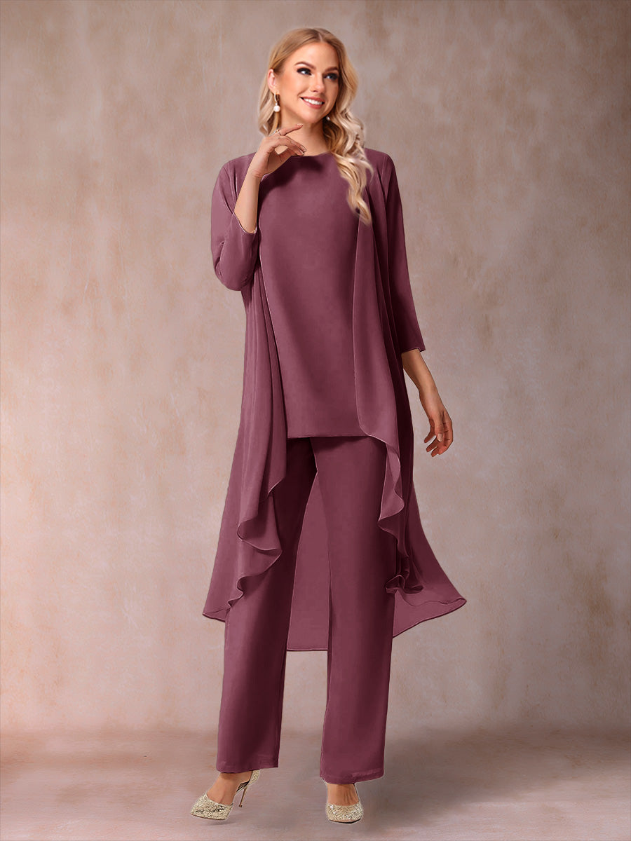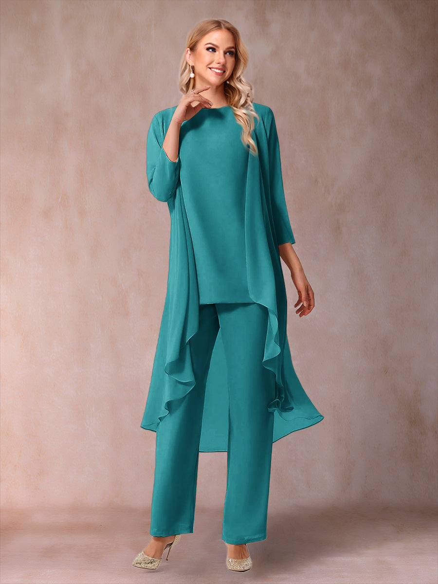 • Chiffon Scoop 3/4 Sleeves 3 Pieces Pantsuits with Ruched & Jacket