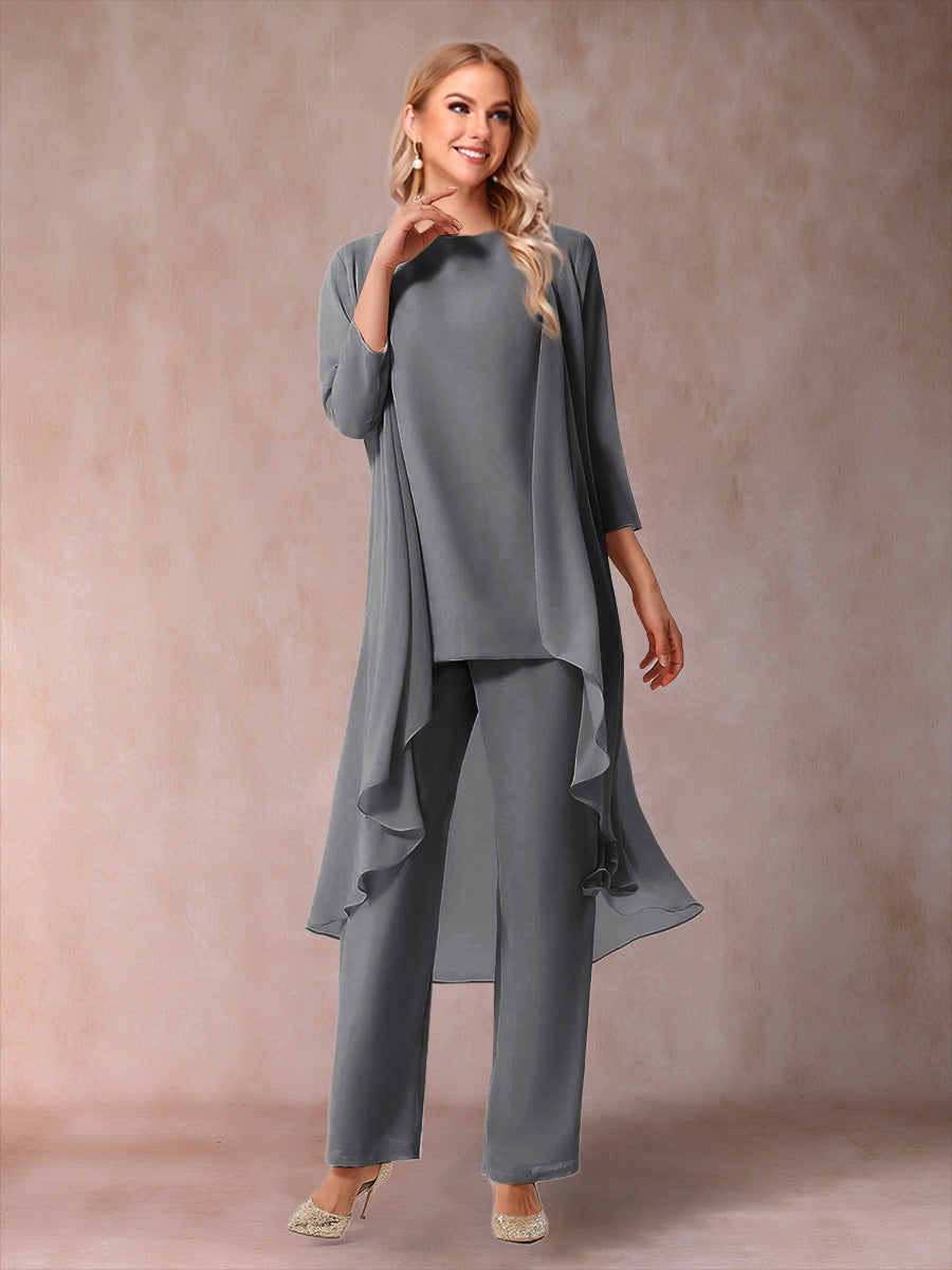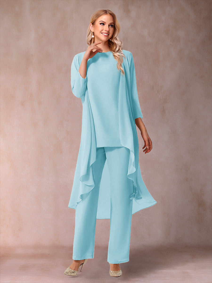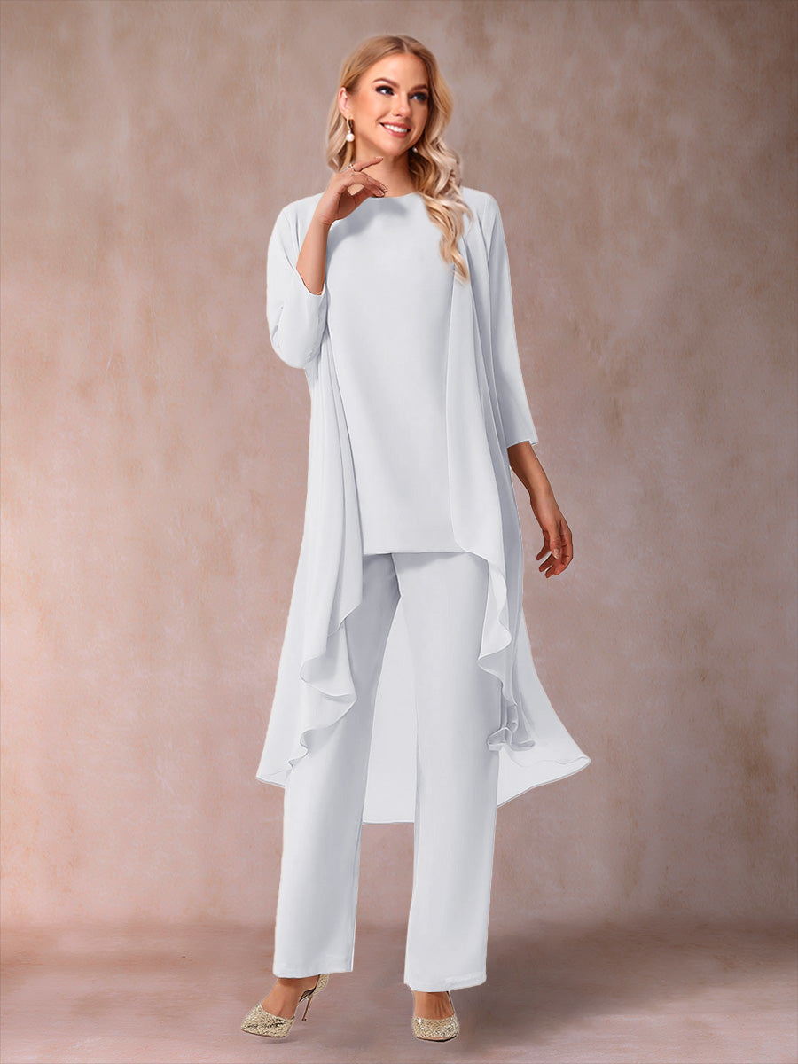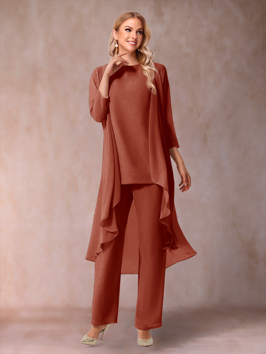 • Chiffon Scoop 3/4 Sleeves 3 Pieces Pantsuits with Ruched & Jacket