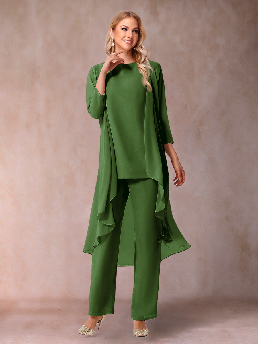 #Olive 12010278 Chiffon Scoop 3/4 Sleeves 3 Pieces Pantsuits with Ruched & Jacket