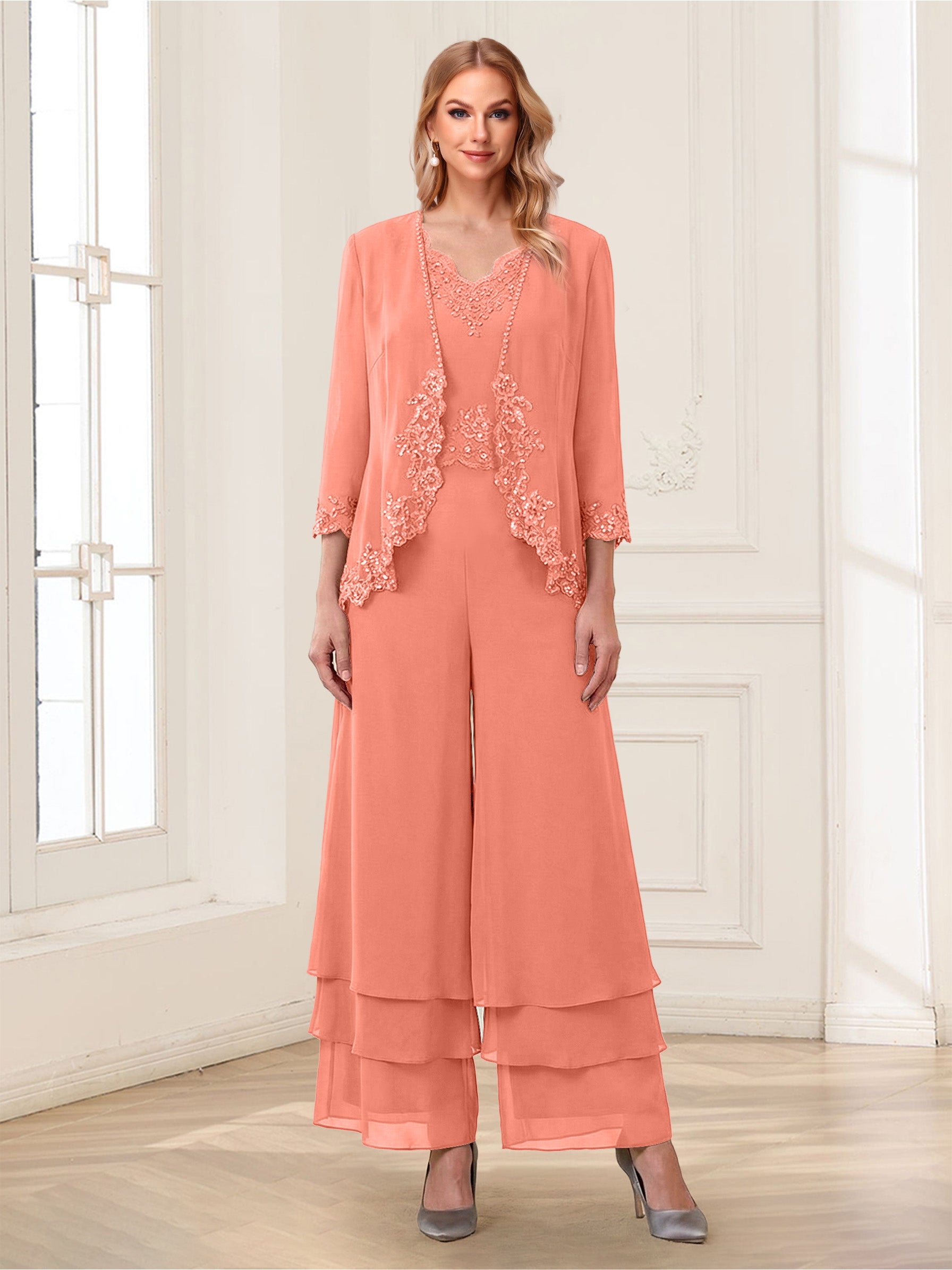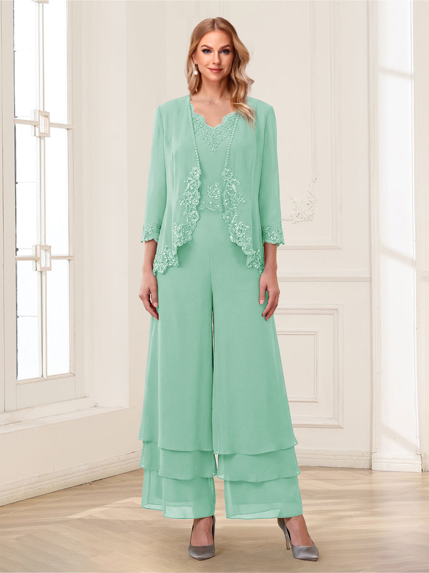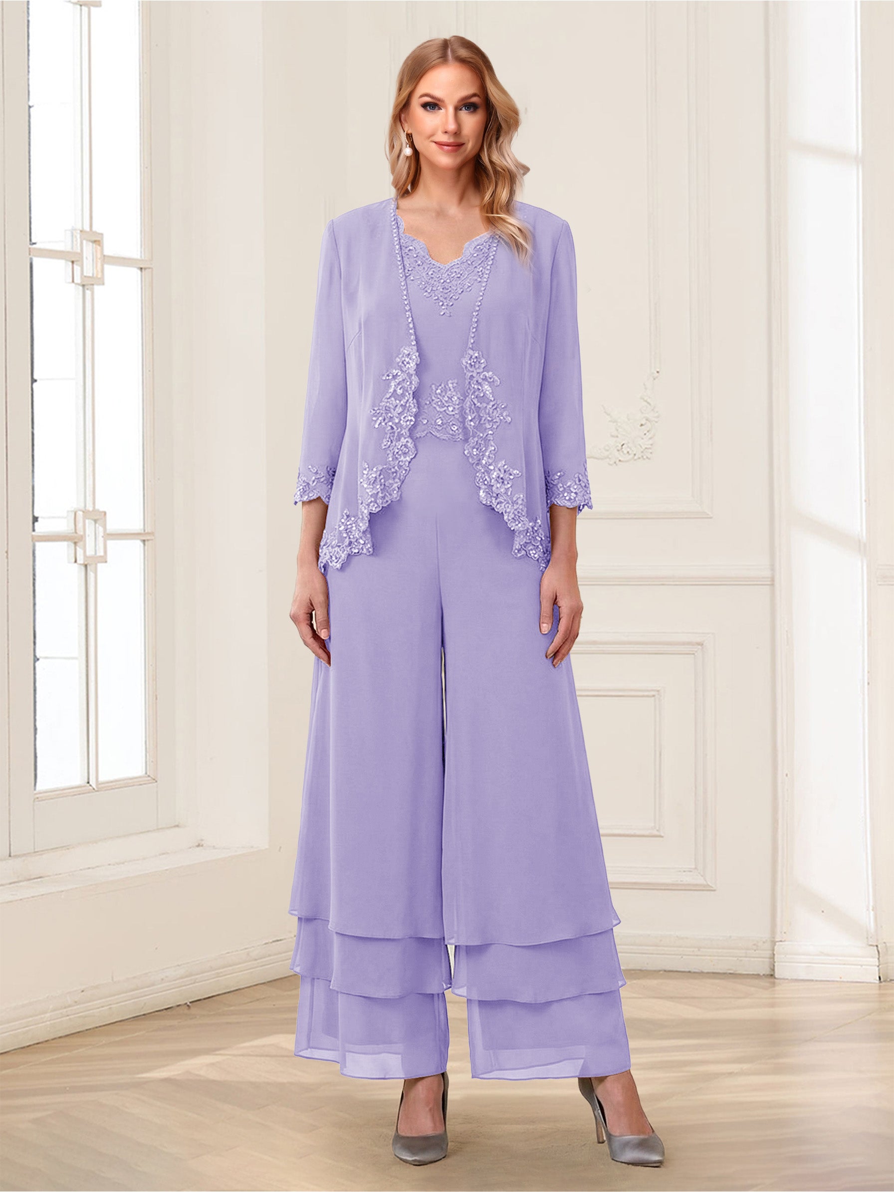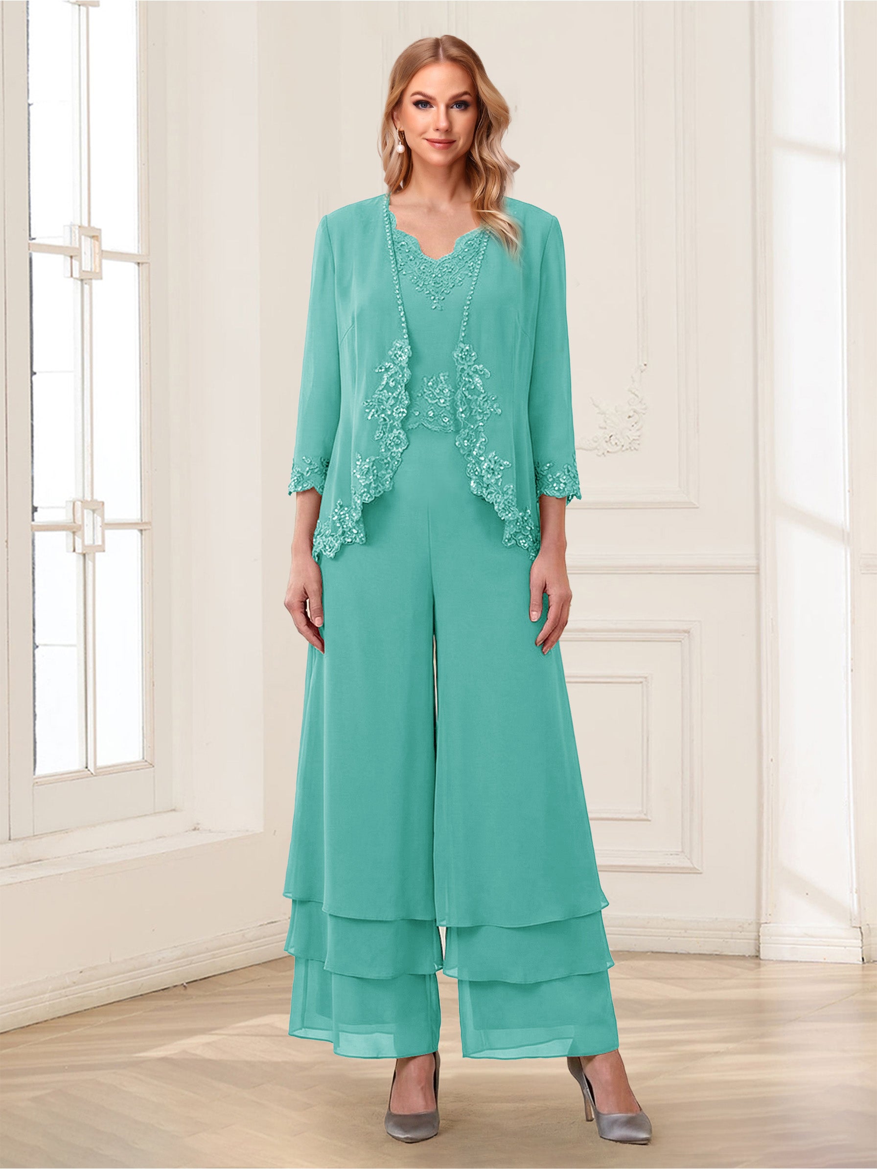 #Perkin 12011851 Jumpsuits V-Neck 3/4 Sleeves Ankle-Length Two Pieces Mother of the Bride Pantsuit with Lace