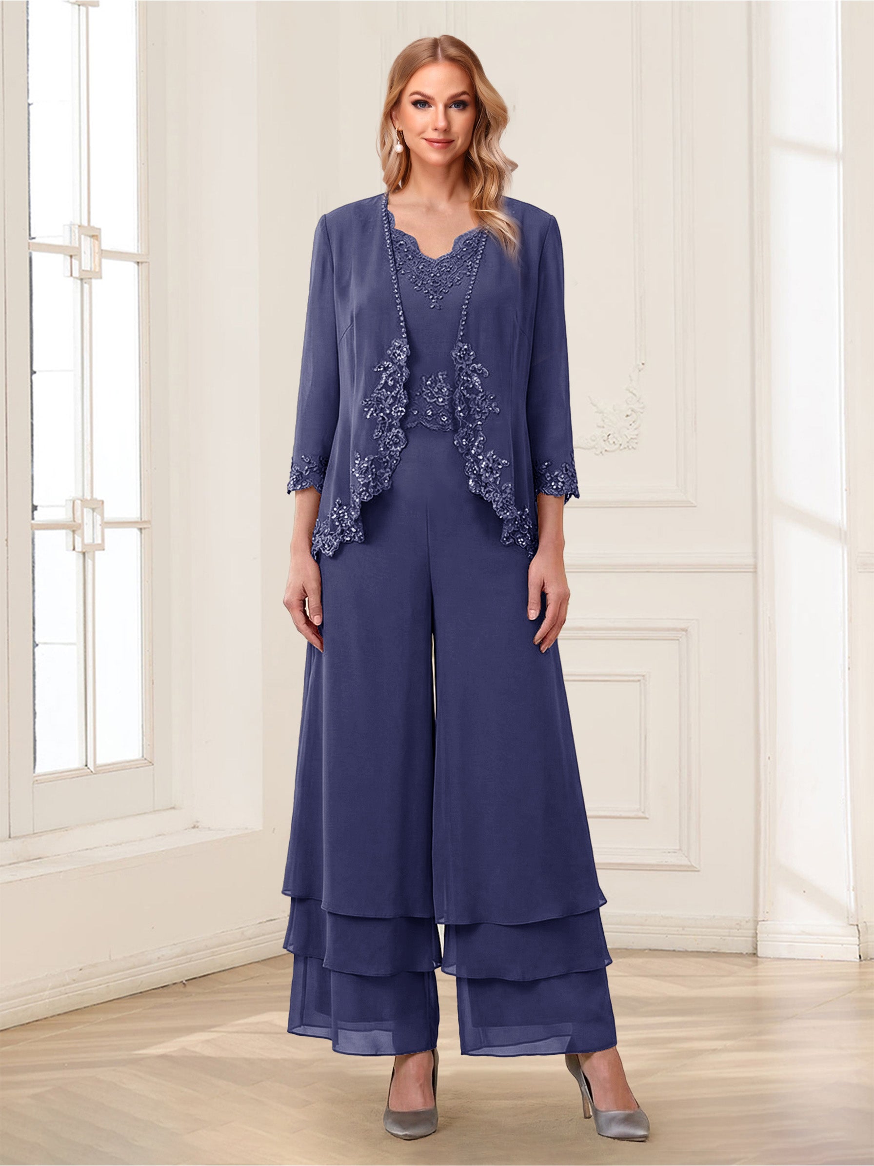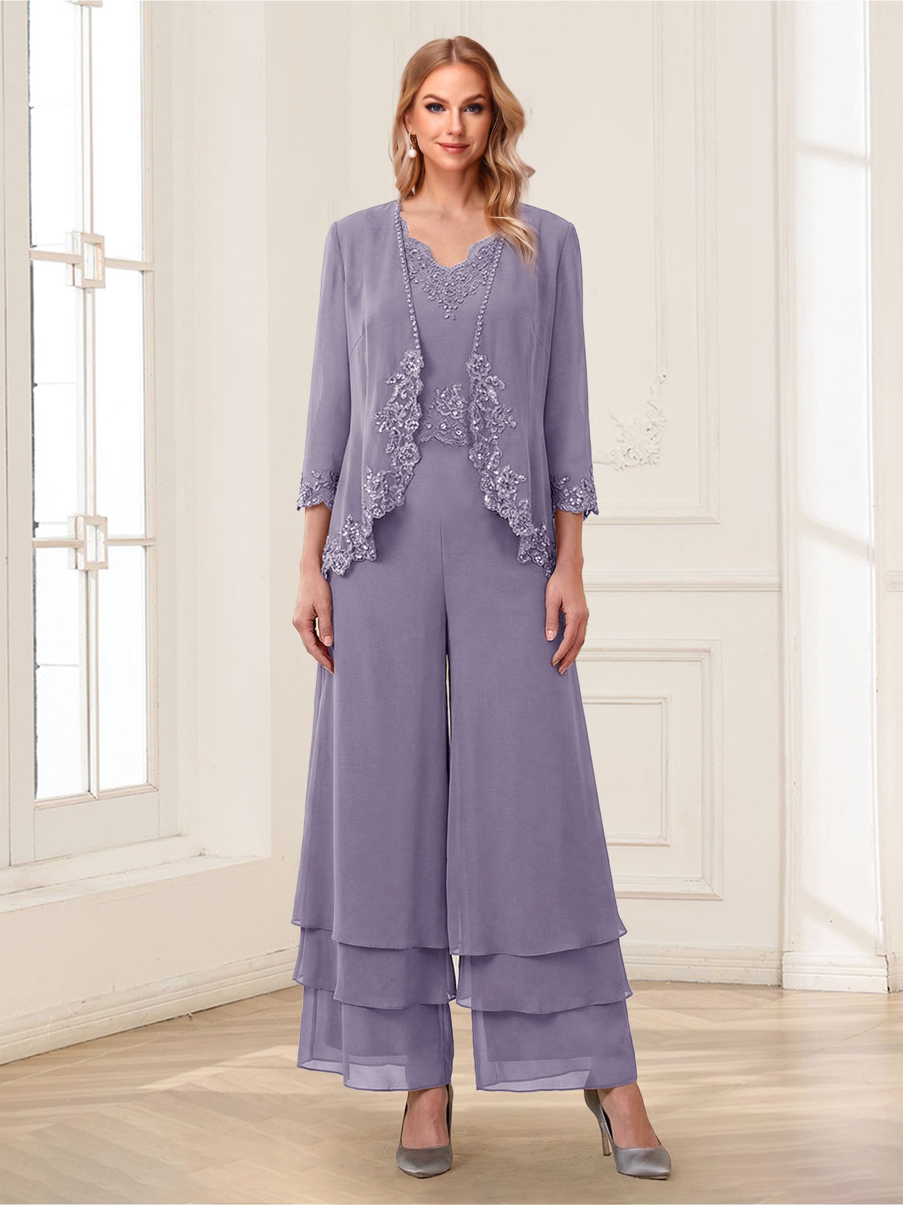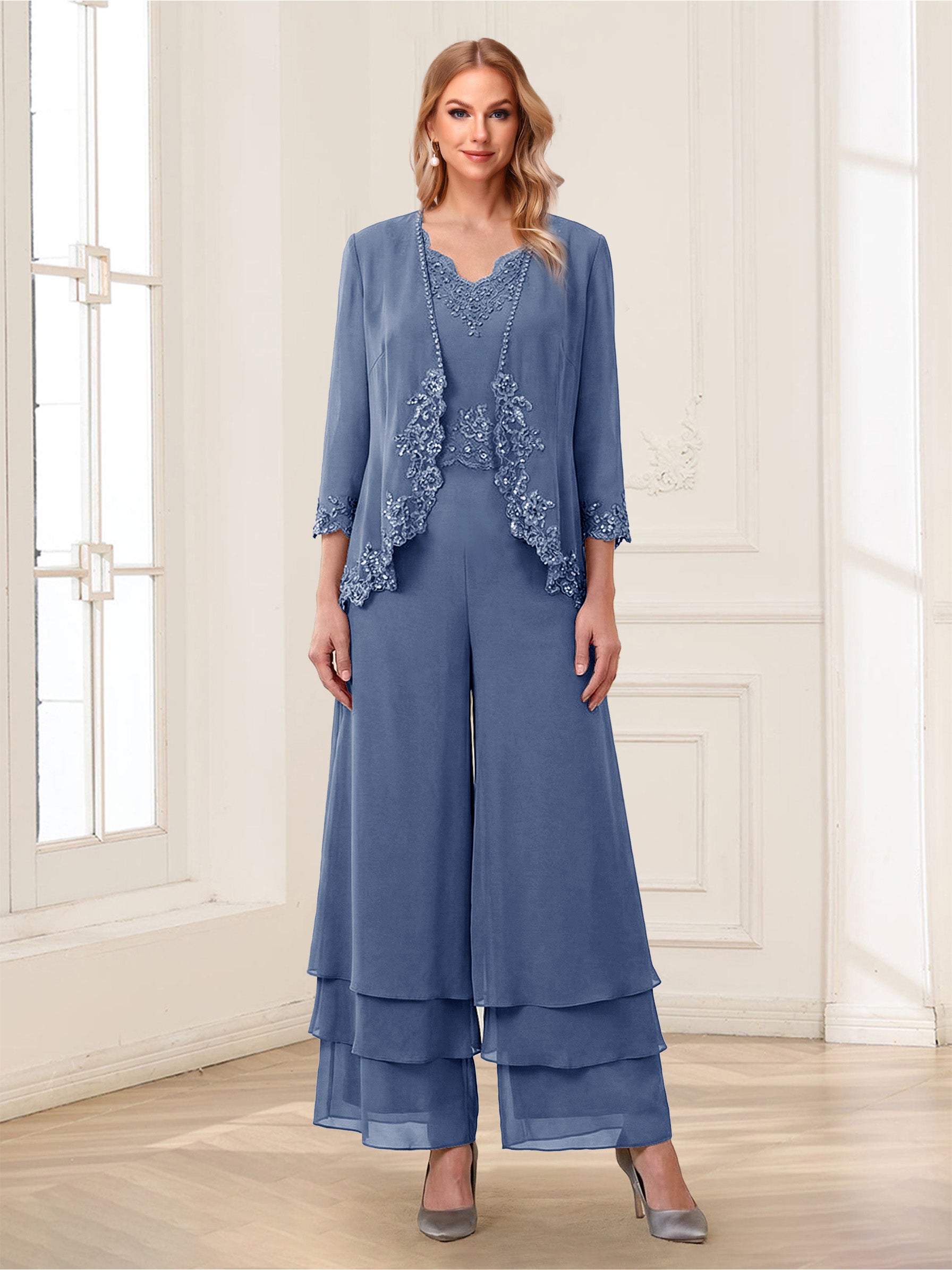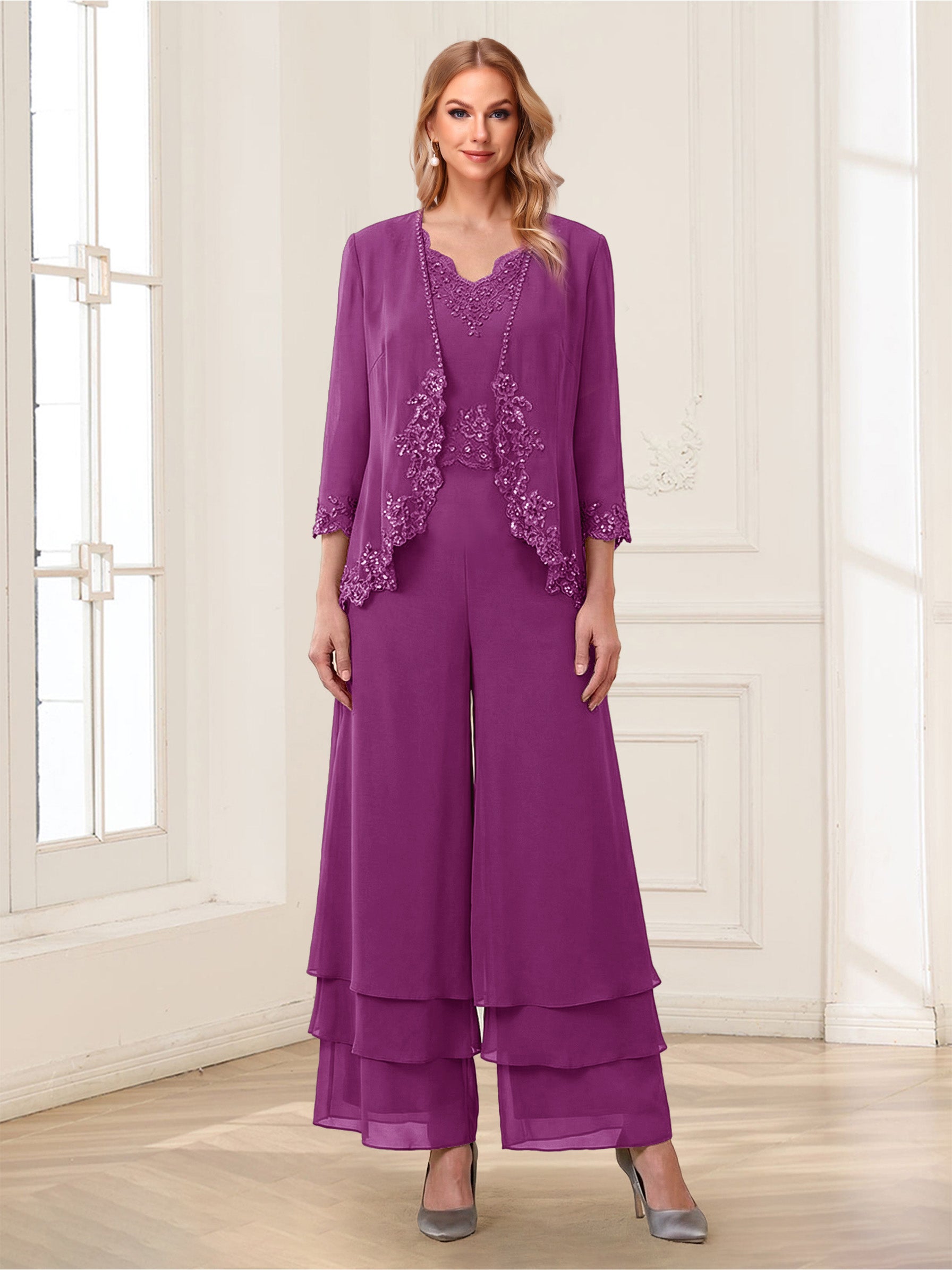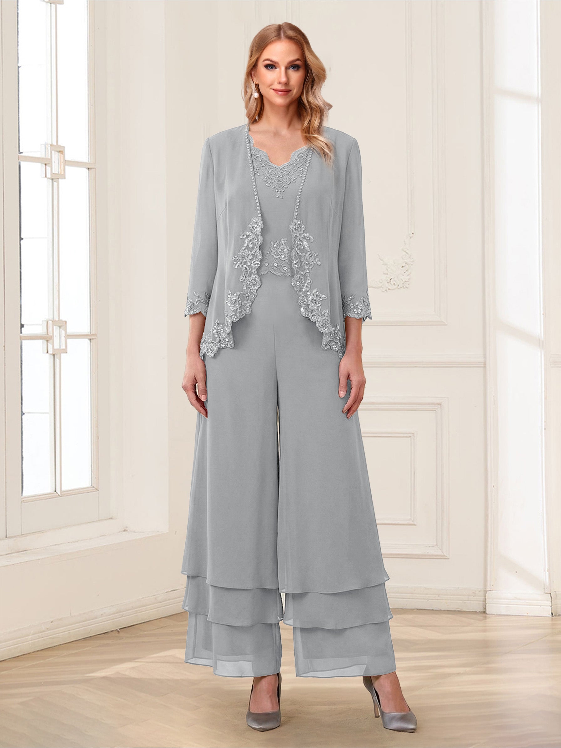 #Perkin 12011851 Jumpsuits V-Neck 3/4 Sleeves Ankle-Length Two Pieces Mother of the Bride Pantsuit with Lace