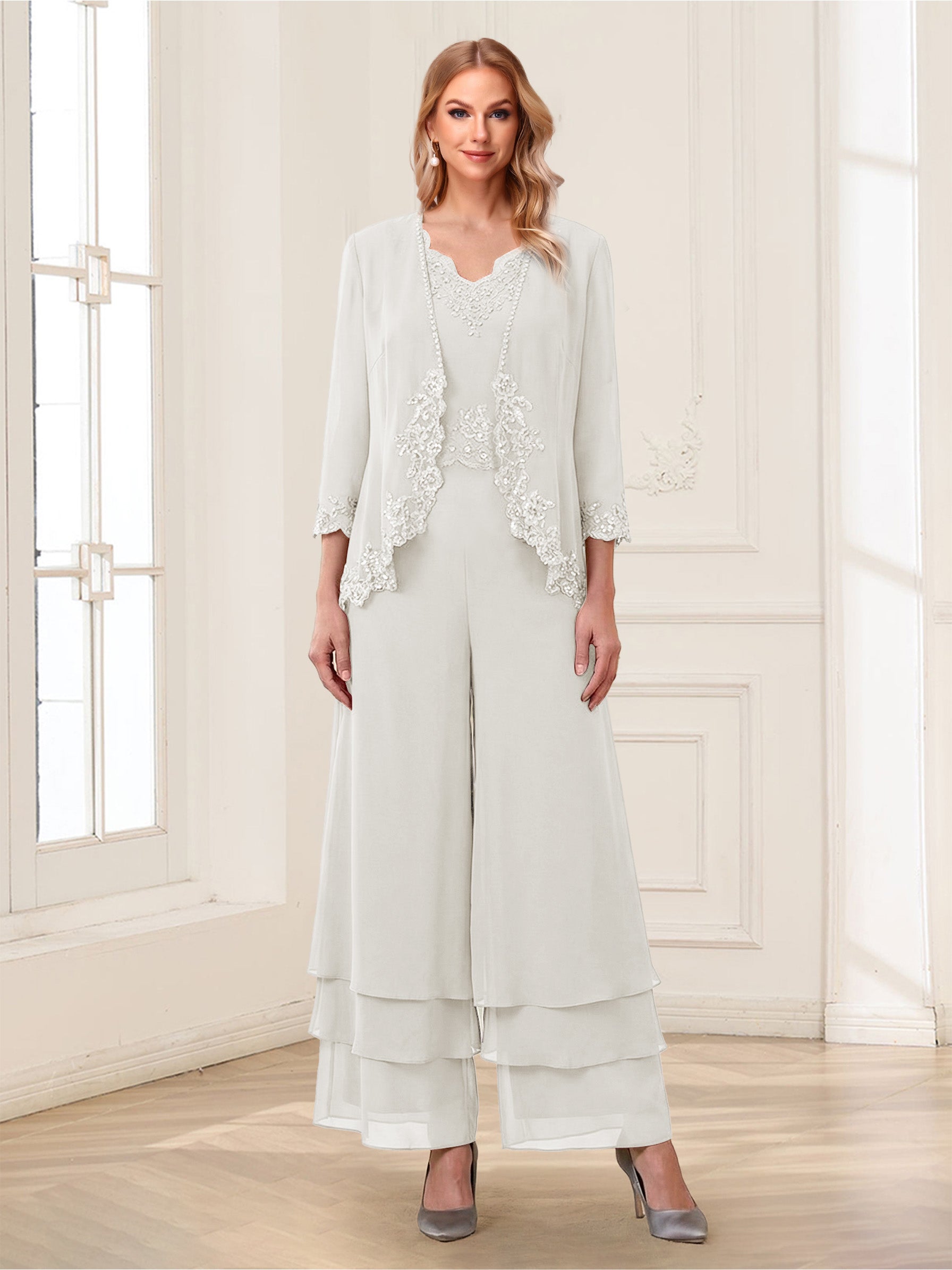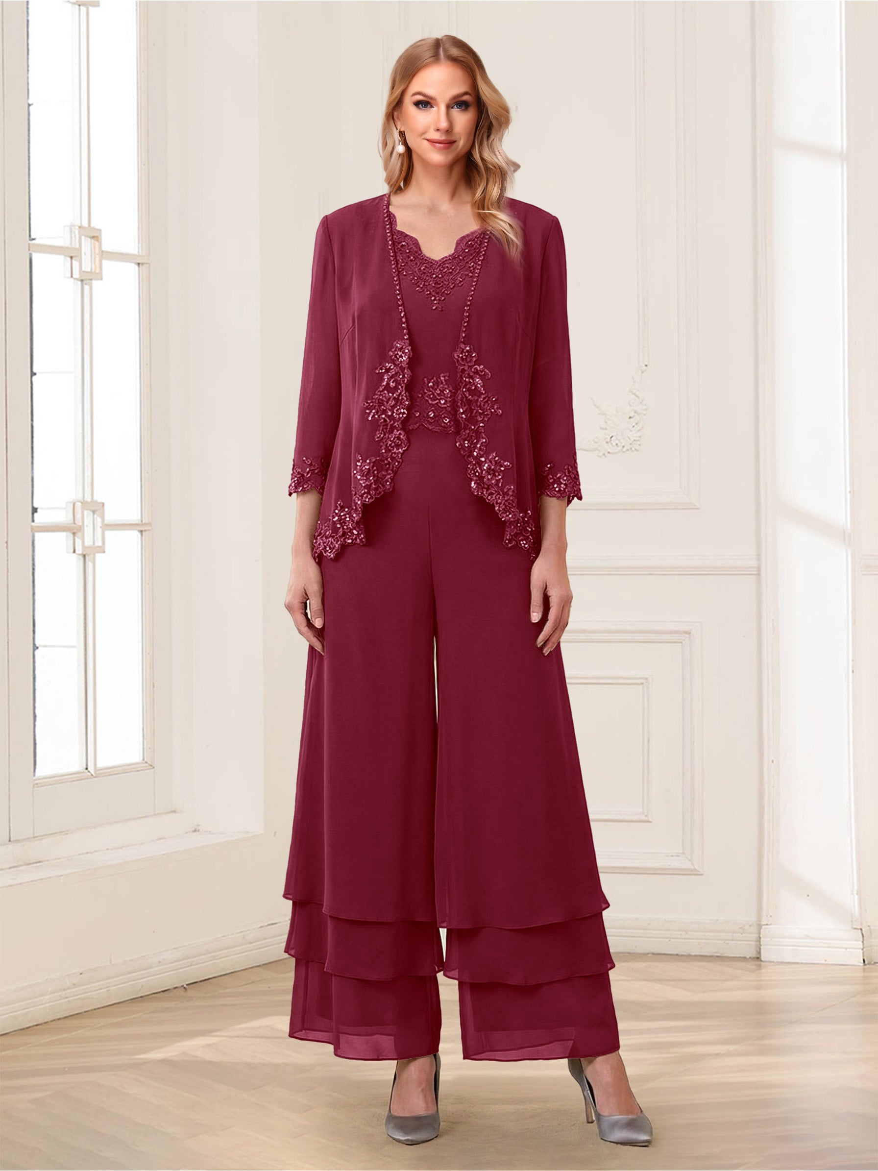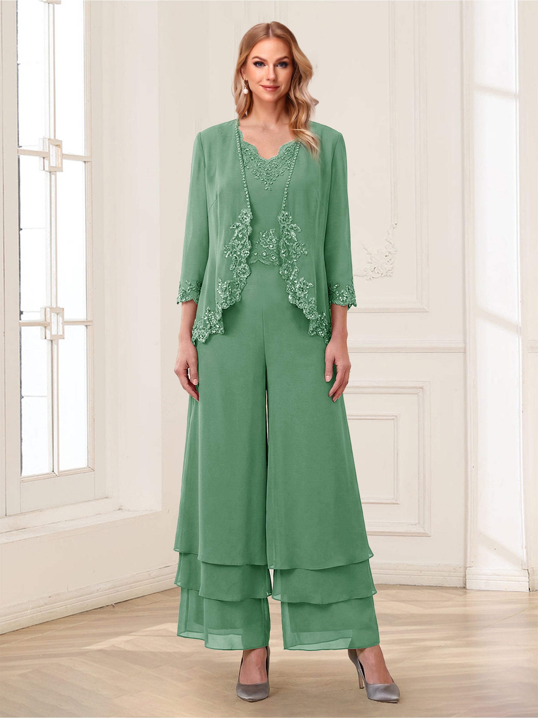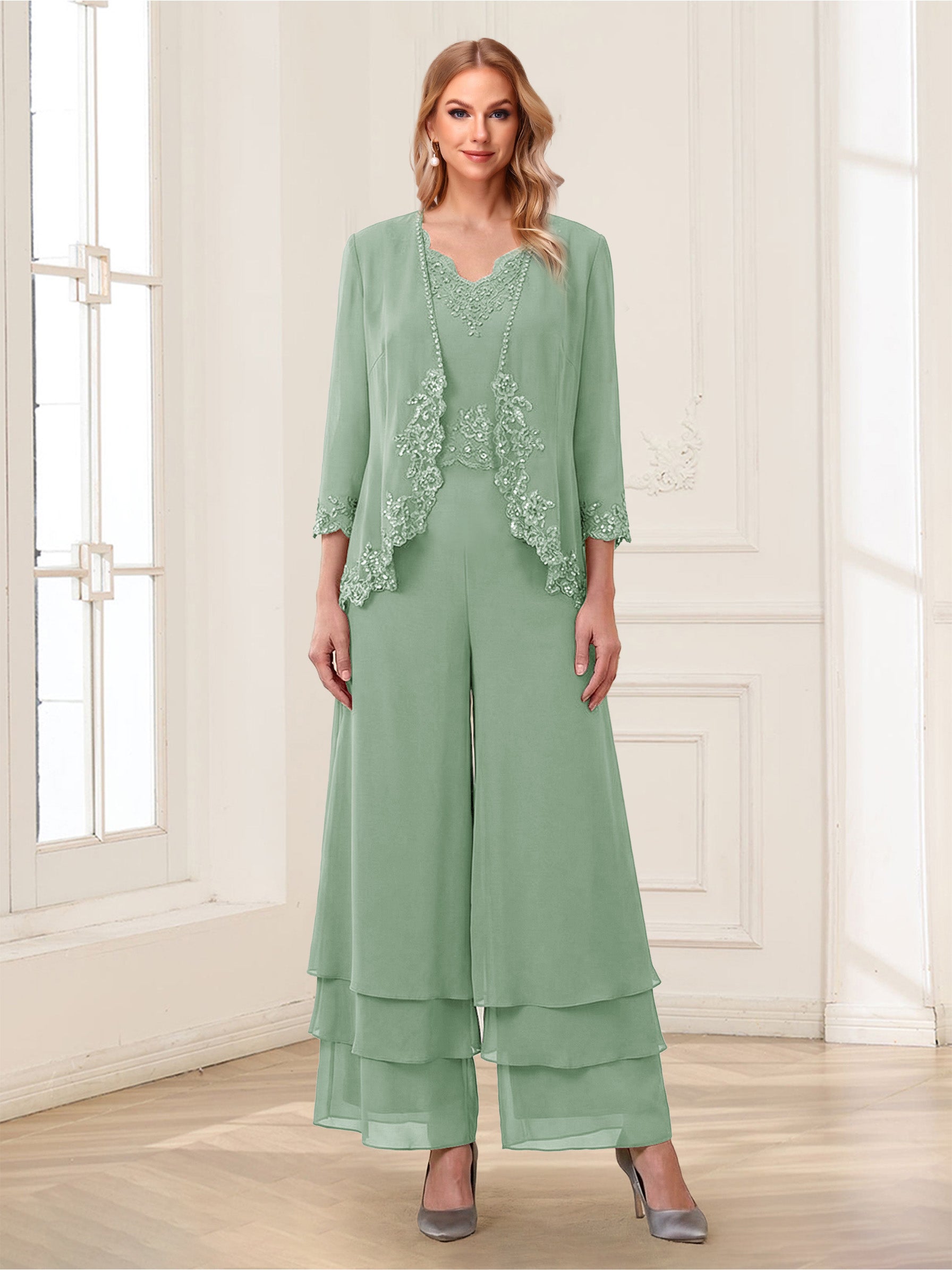 #Perkin 12011851 Jumpsuits V-Neck 3/4 Sleeves Ankle-Length Two Pieces Mother of the Bride Pantsuit with Lace