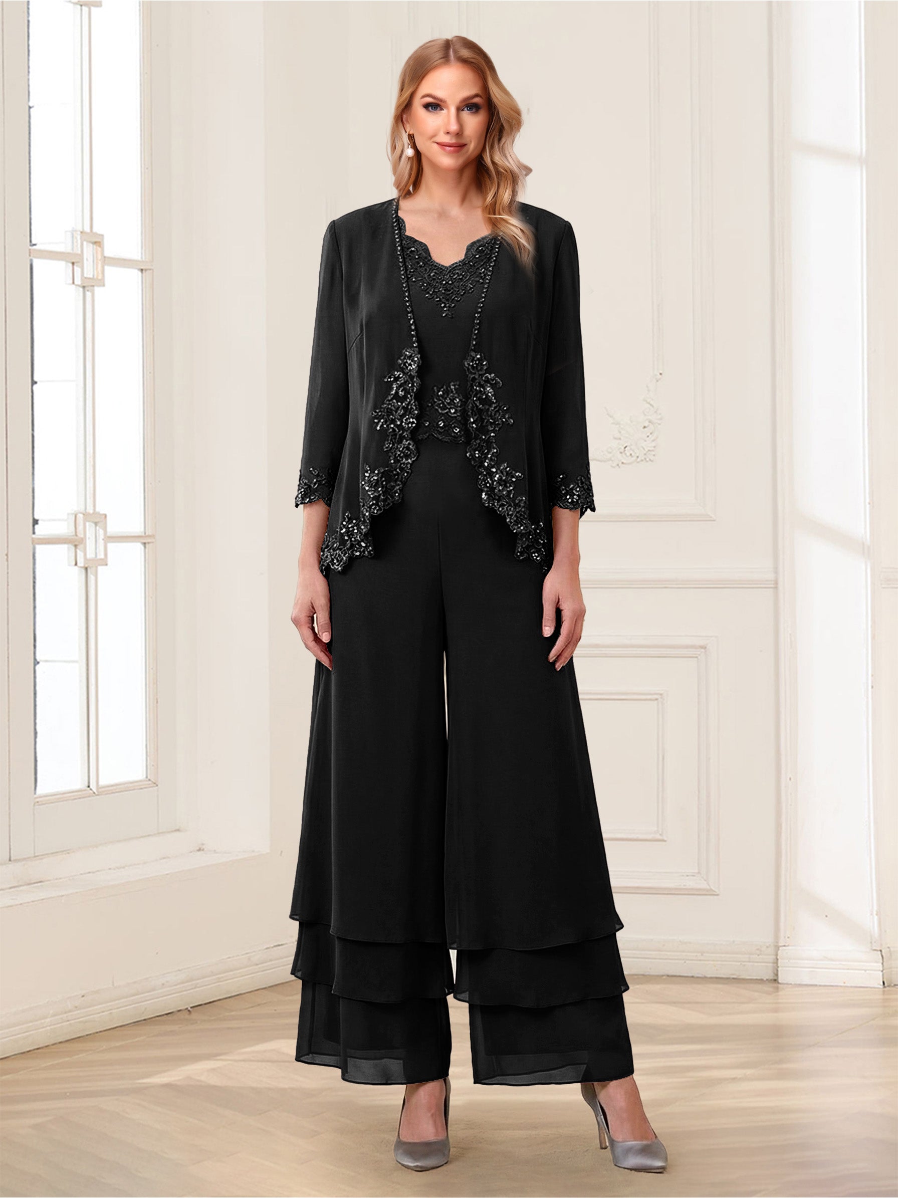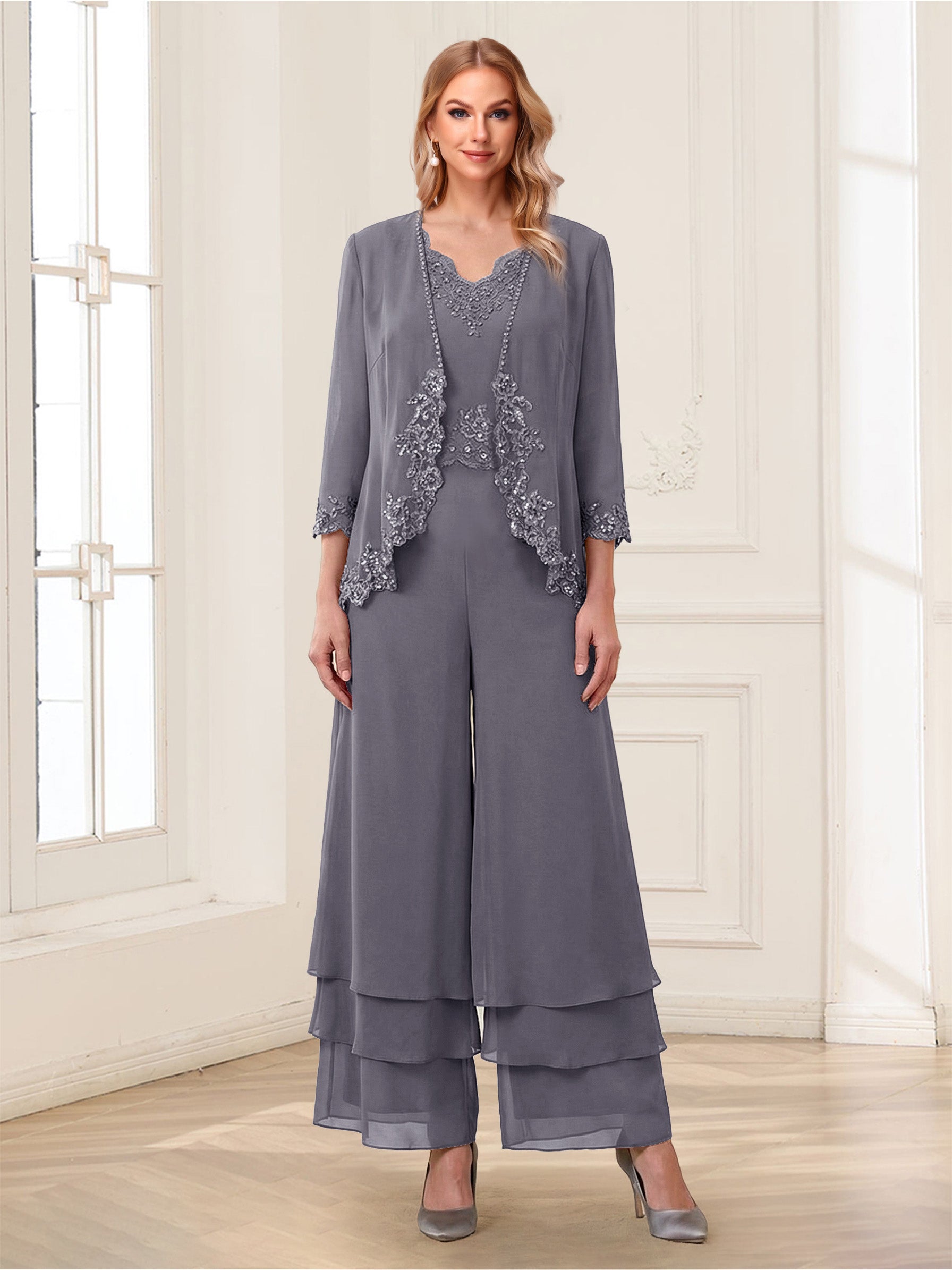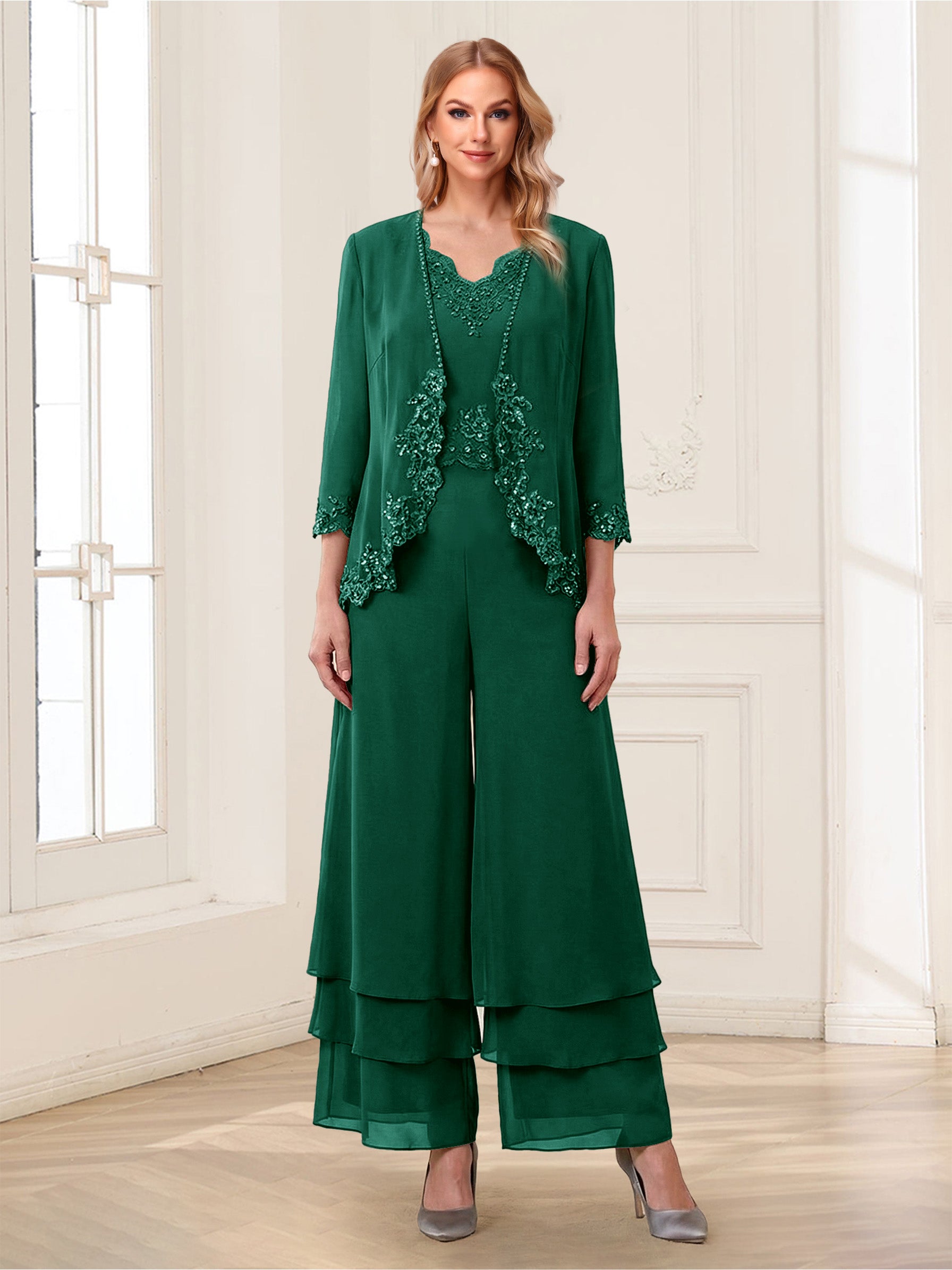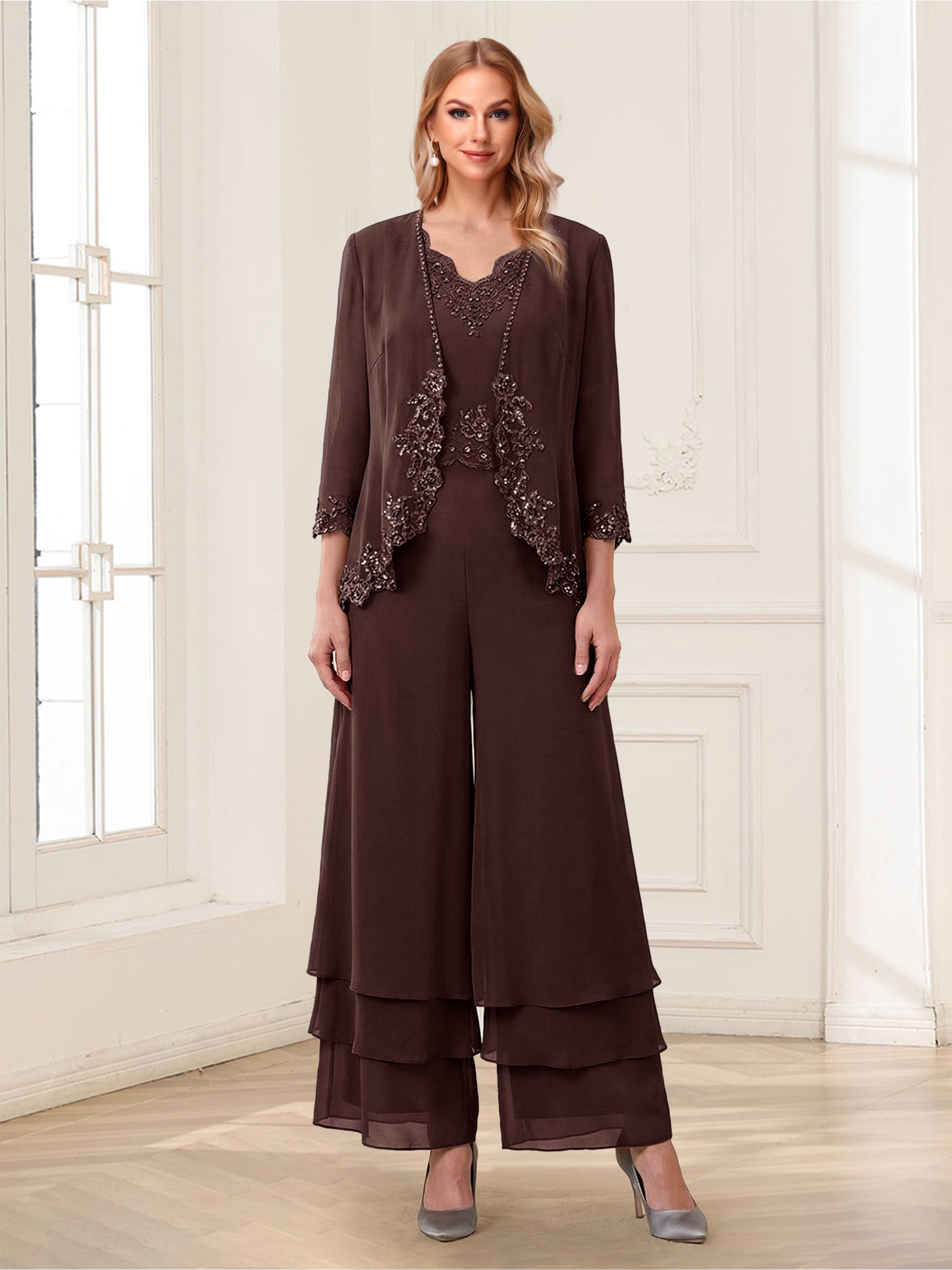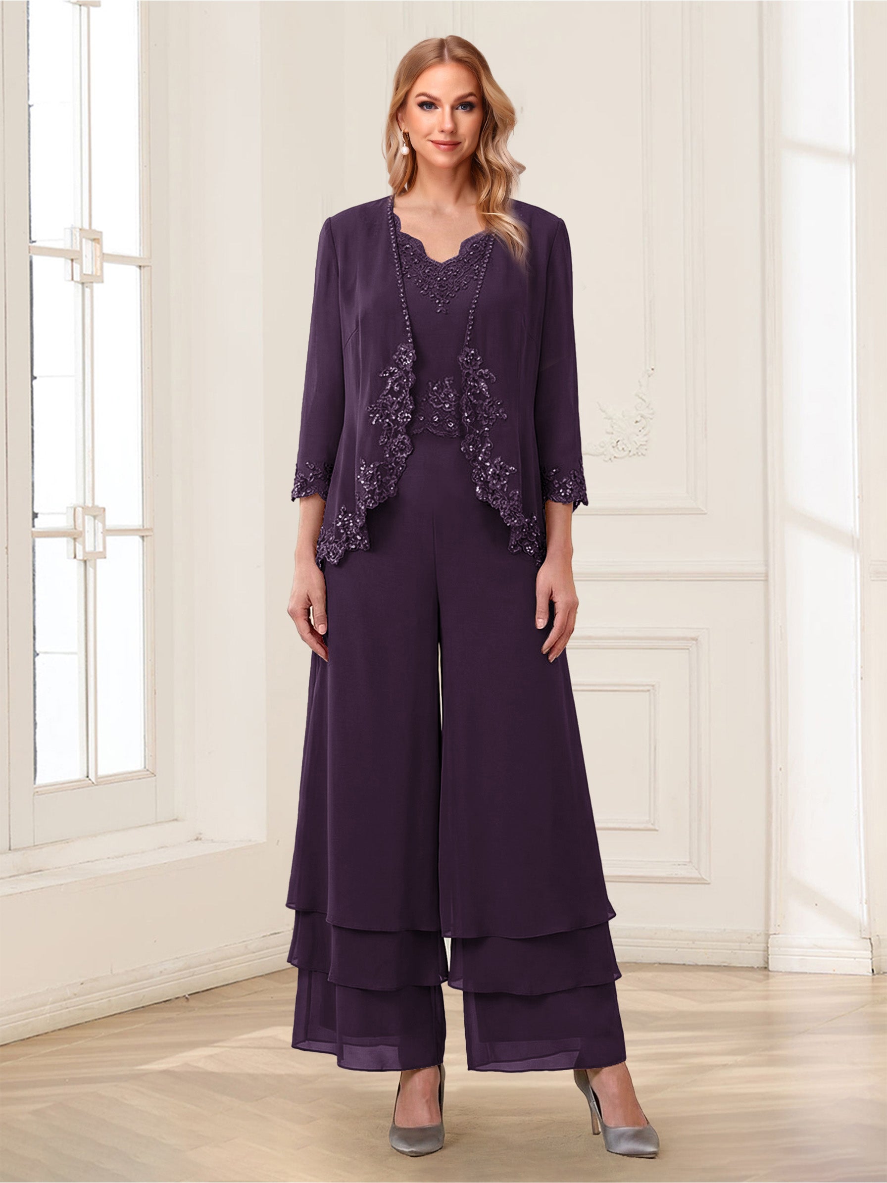 #Perkin 12011851 Jumpsuits V-Neck 3/4 Sleeves Ankle-Length Two Pieces Mother of the Bride Pantsuit with Lace