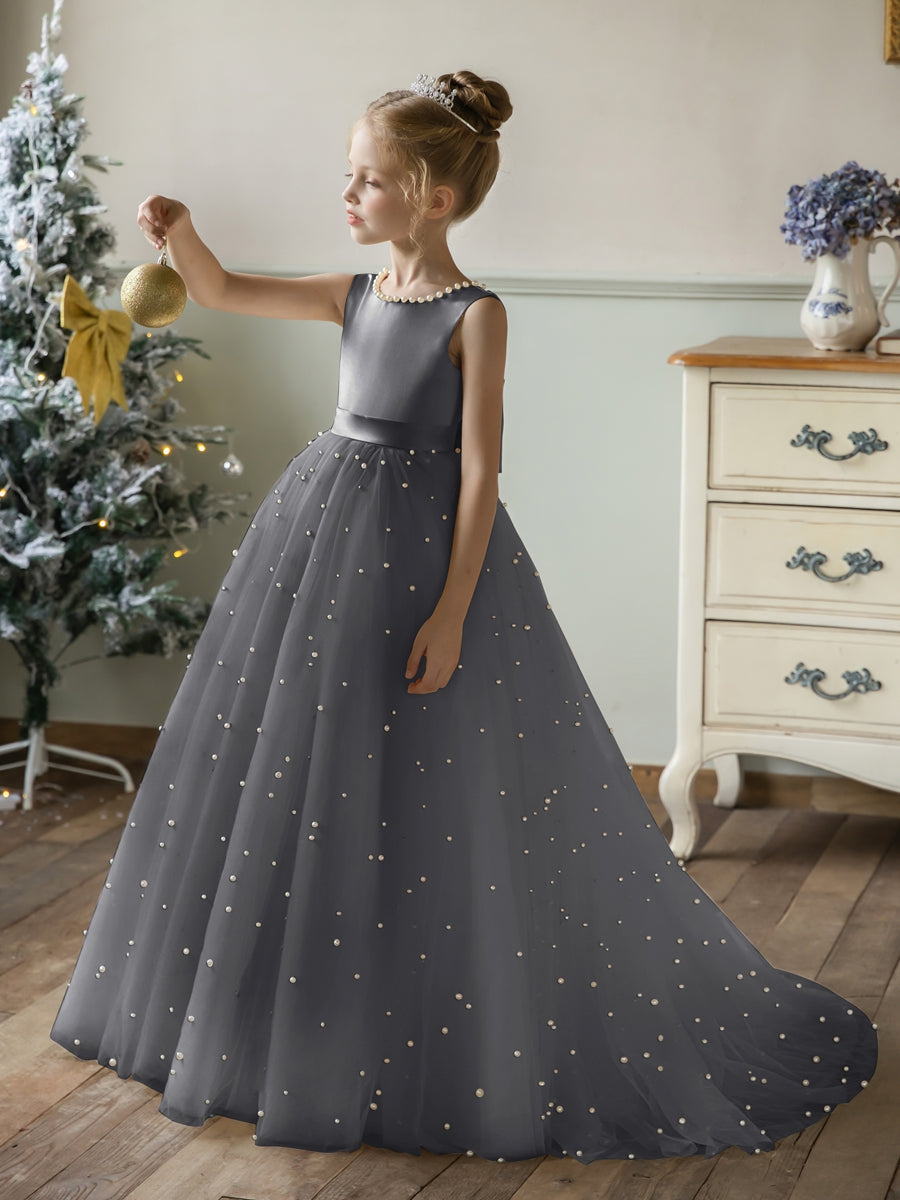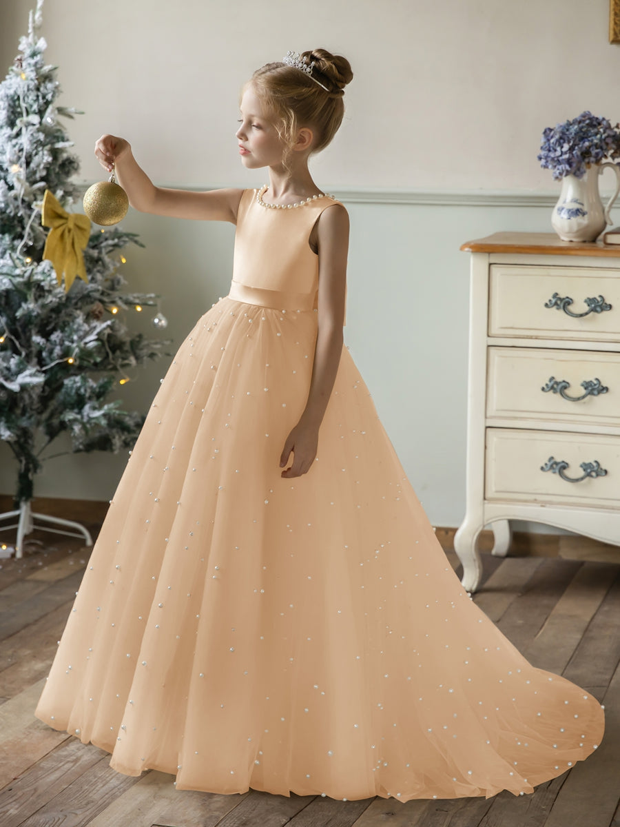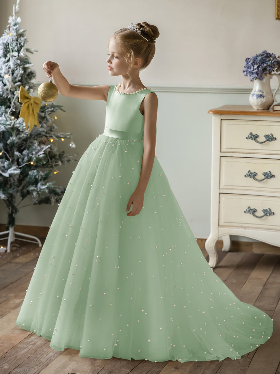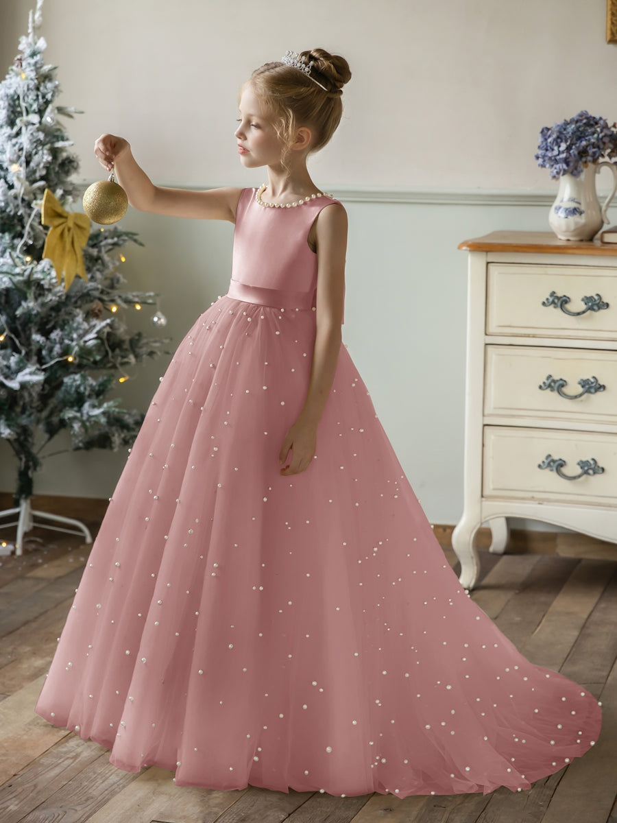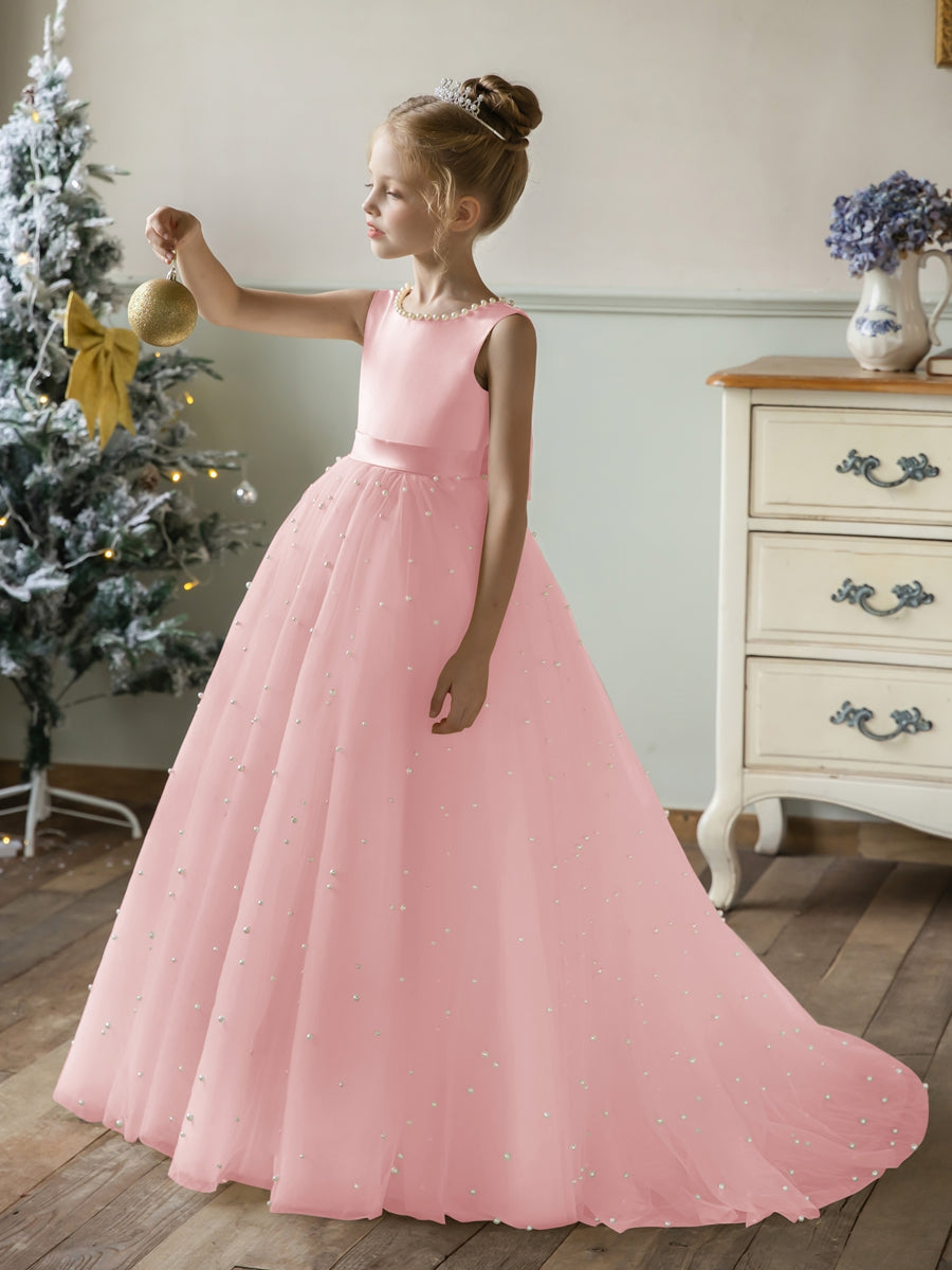 #Arabella 9660583 Crew Neck Tulle Flower Girl Dresses with Pearls & Satin Bowknot