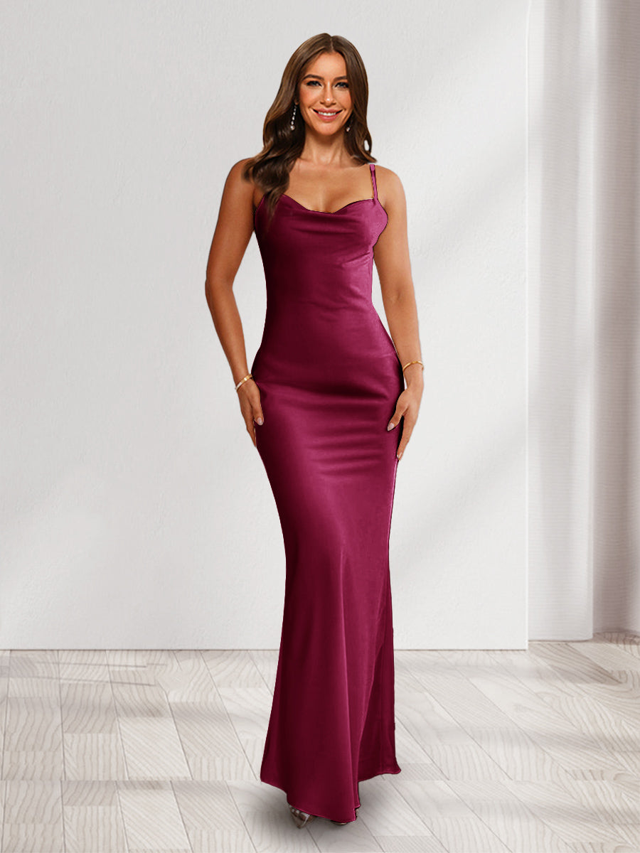 • Sheath/Column Cowl Neck Straps Fitted Long Bridesmaid Dresses with Flowers