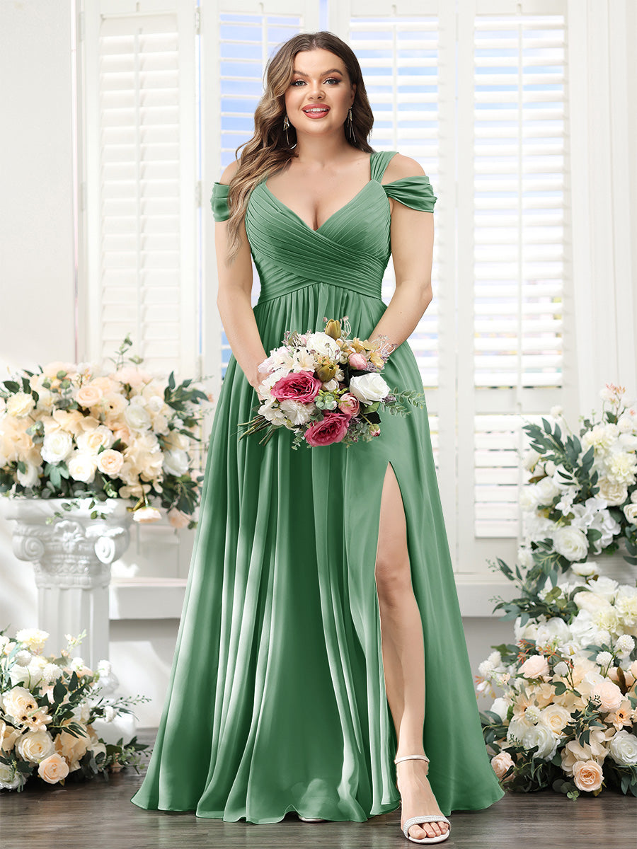 #Oron 9817019P A-Line V-Neck Split Side Ruched Floor-Length Chiffon Plus Size Bridesmaid Dresses