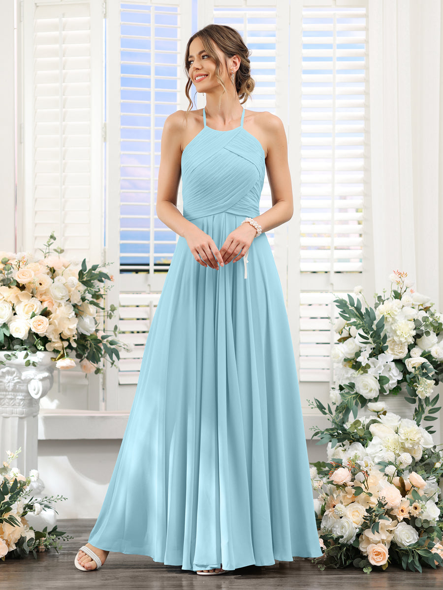 #Violet 9817077 A-Line Halter Sleeveless Ruched Floor-Length Chiffon Bridesmaid Dresses