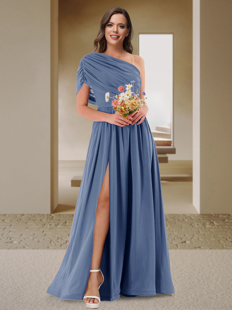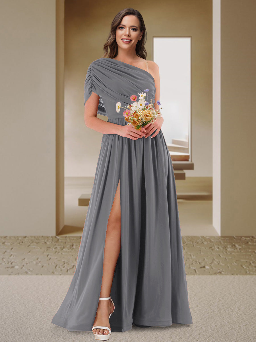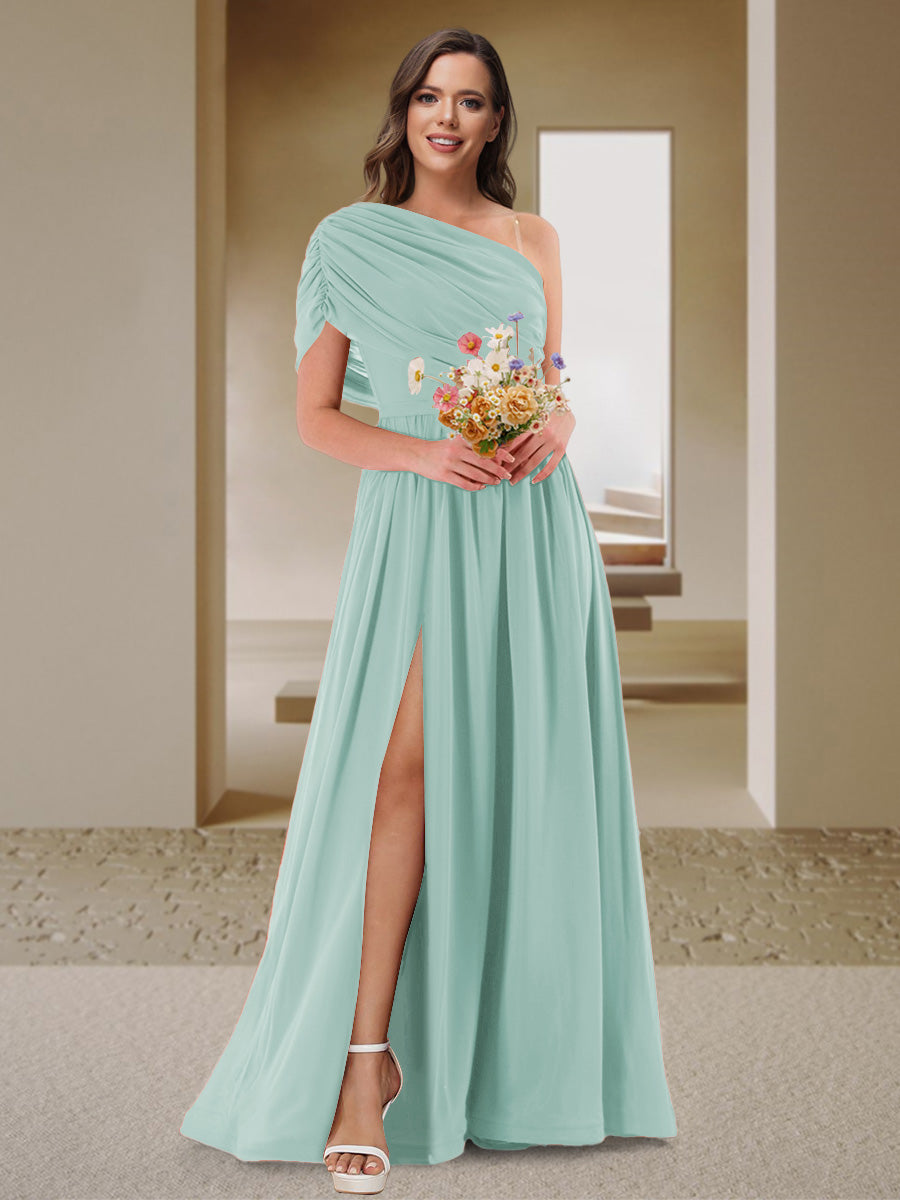 • A-Line/Princess One-Shoulder Ruched Satin Bridesmaid Dresses with Side Slit