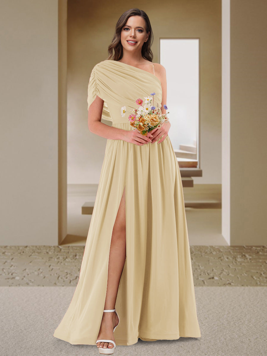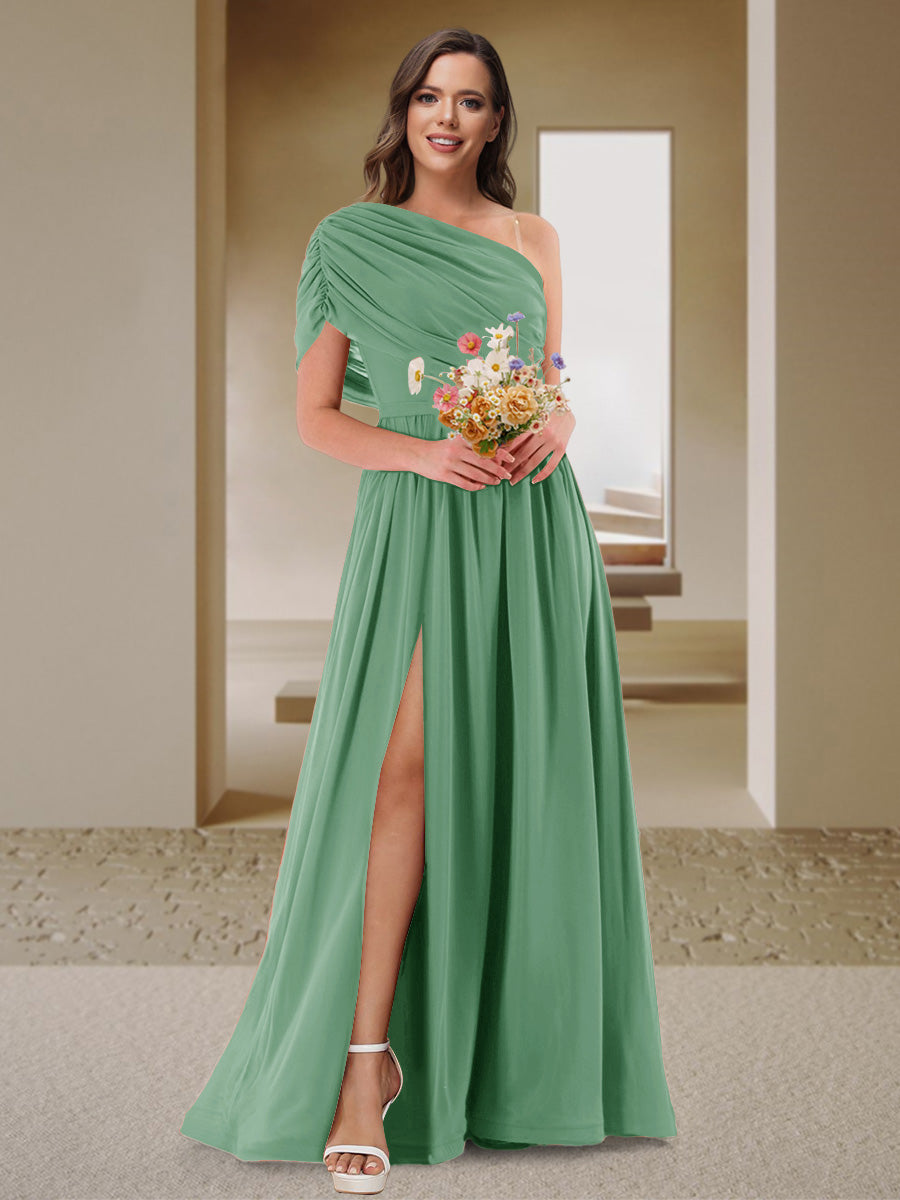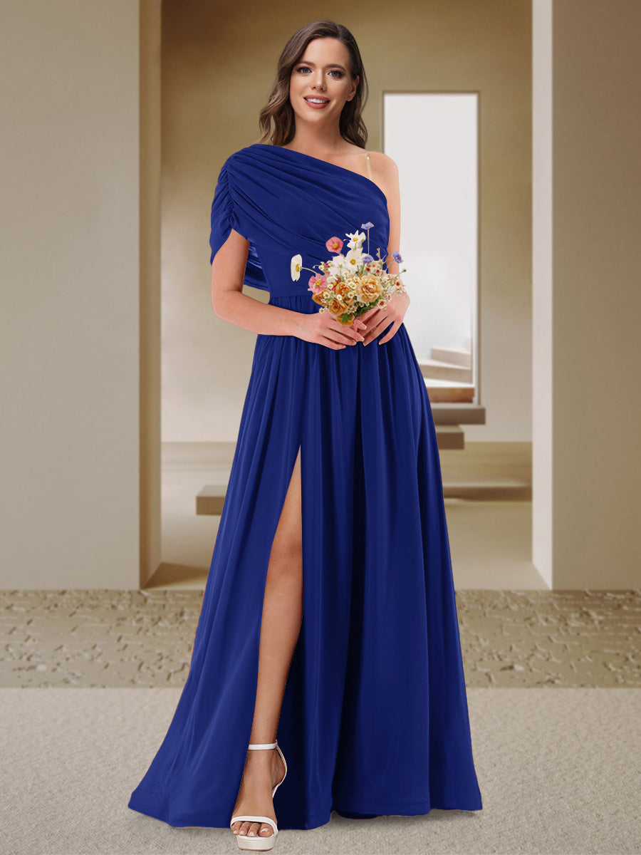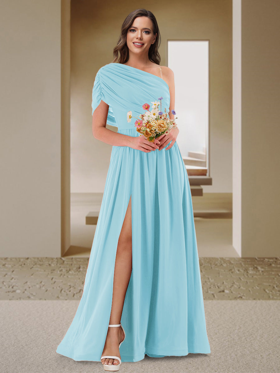 • A-Line/Princess One-Shoulder Ruched Satin Bridesmaid Dresses with Side Slit