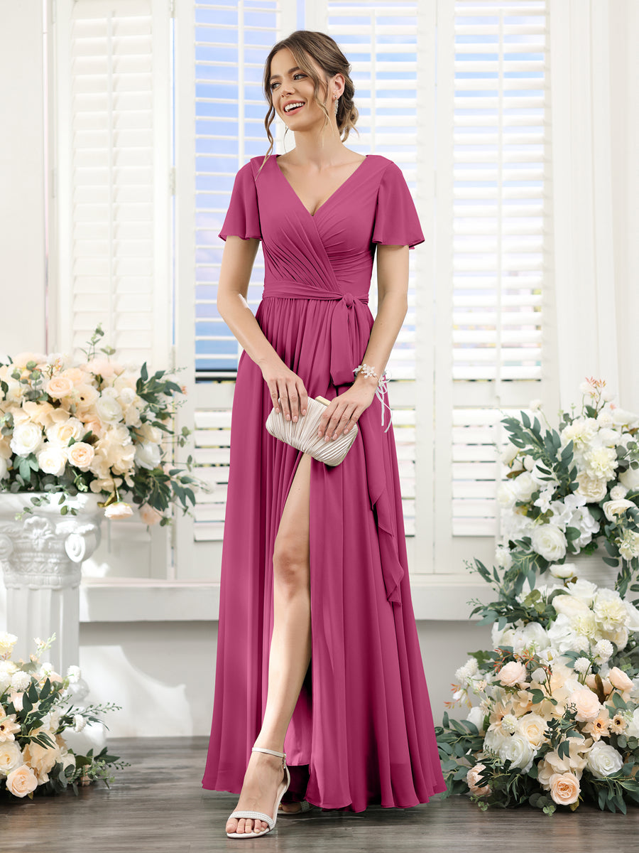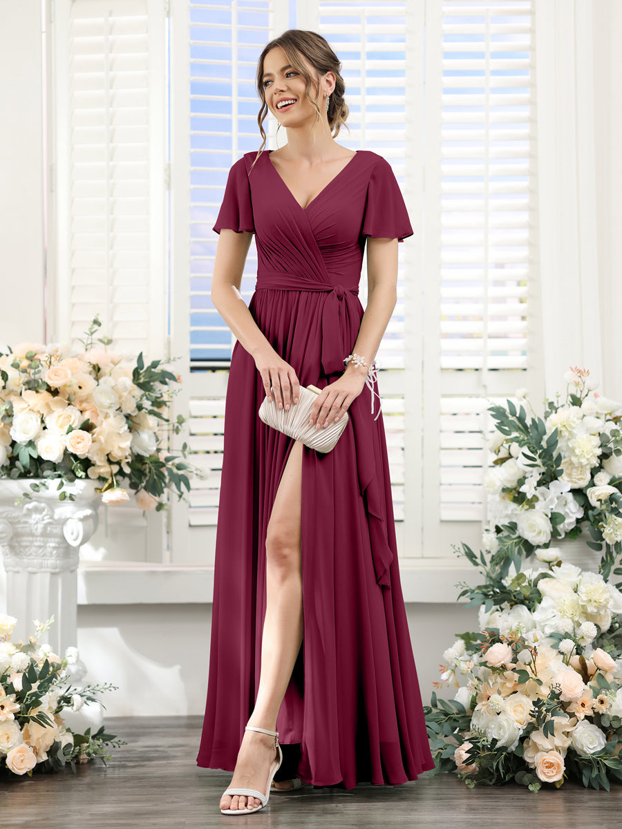 • A-Line V-Neck Short Sleeves Split Side Ruched Floor-Length Chiffon Bridesmaid Dresses