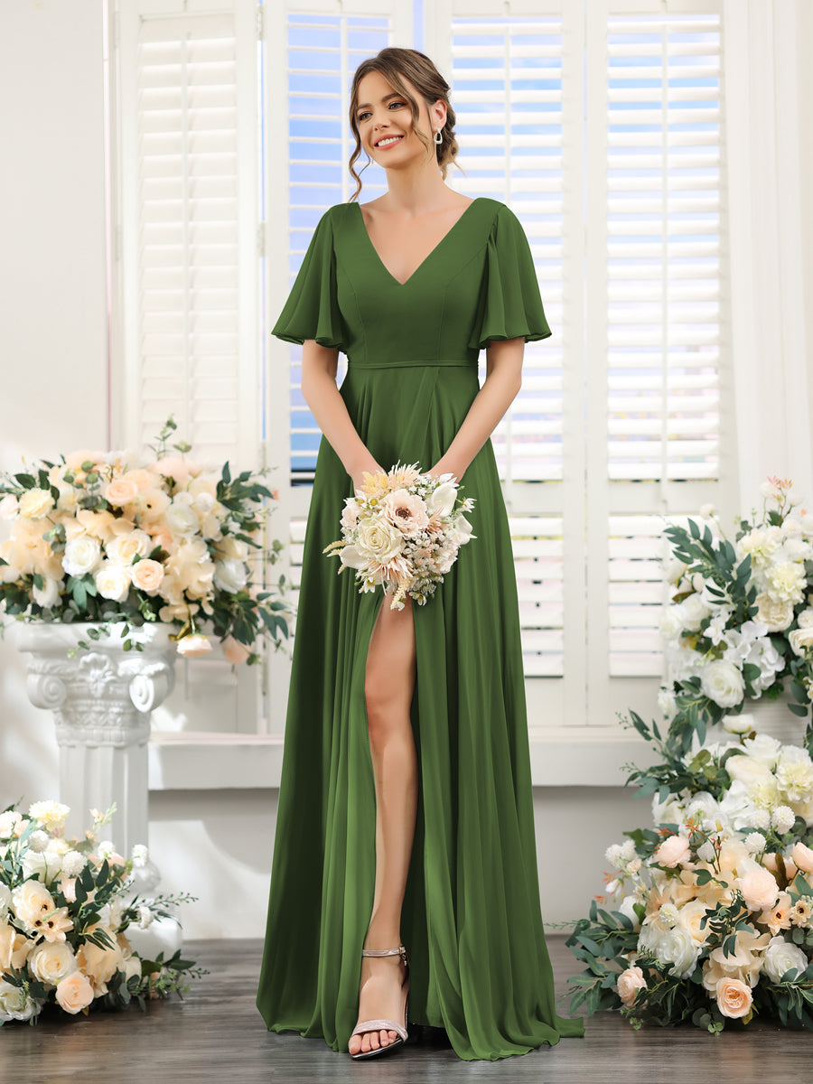 • A-Line V-Neck Short Sleeves Split Side Ruffles Chiffon Bridesmaid Dresses