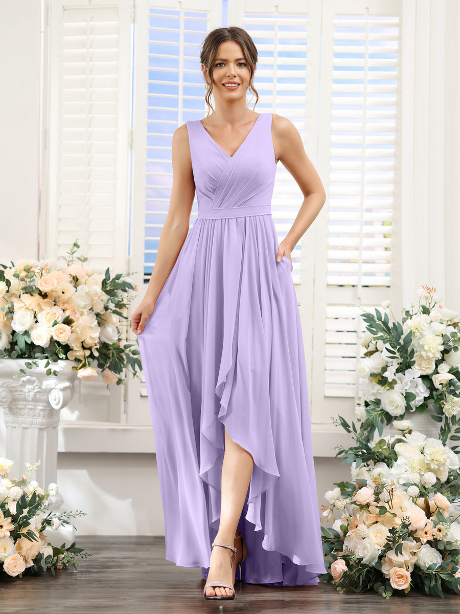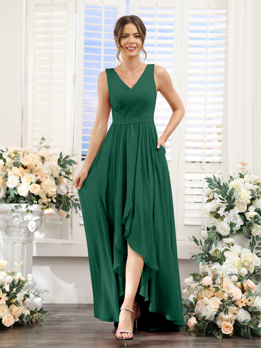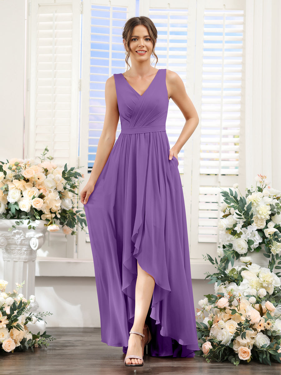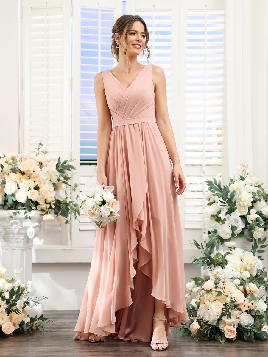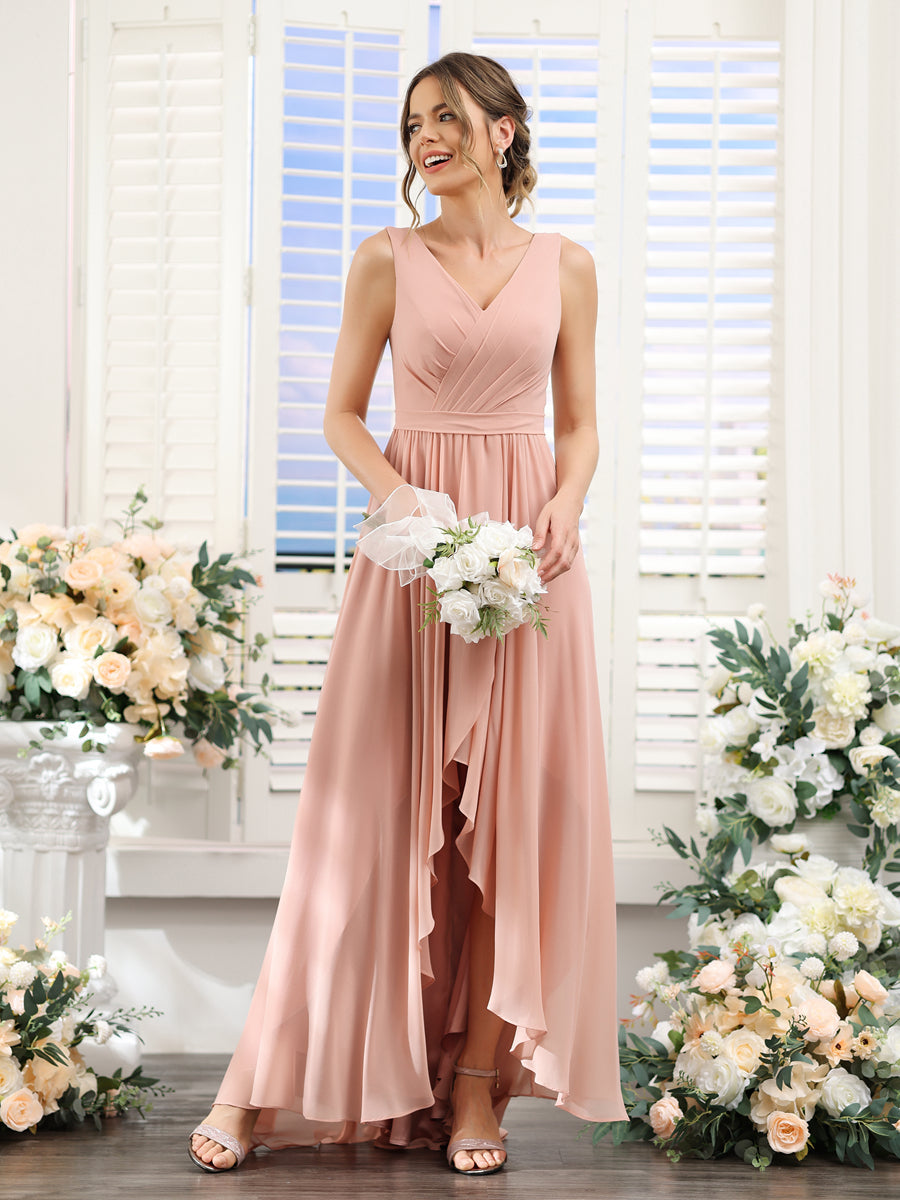 • A-Line V-Neck Sleeveless Ruched Asymmetrical Chiffon Bridesmaid Dresses