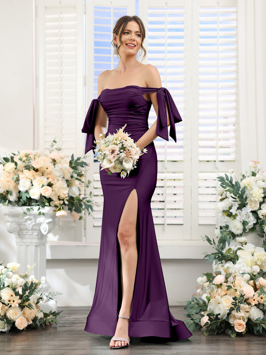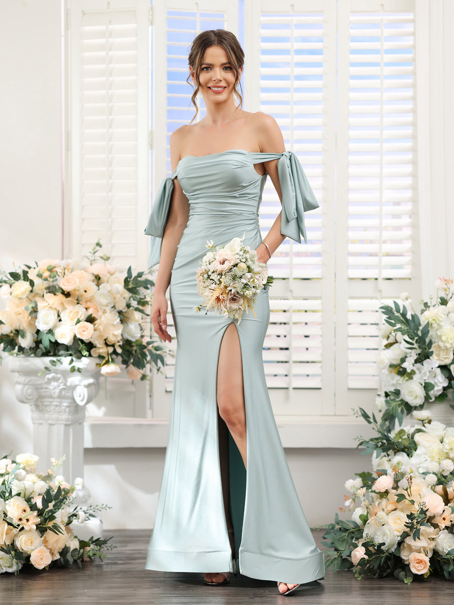 #Luna 9627035 Mermaid Off-the-Shoulder Sleeveless Split Side Silk Satin Bridesmaid Dresses