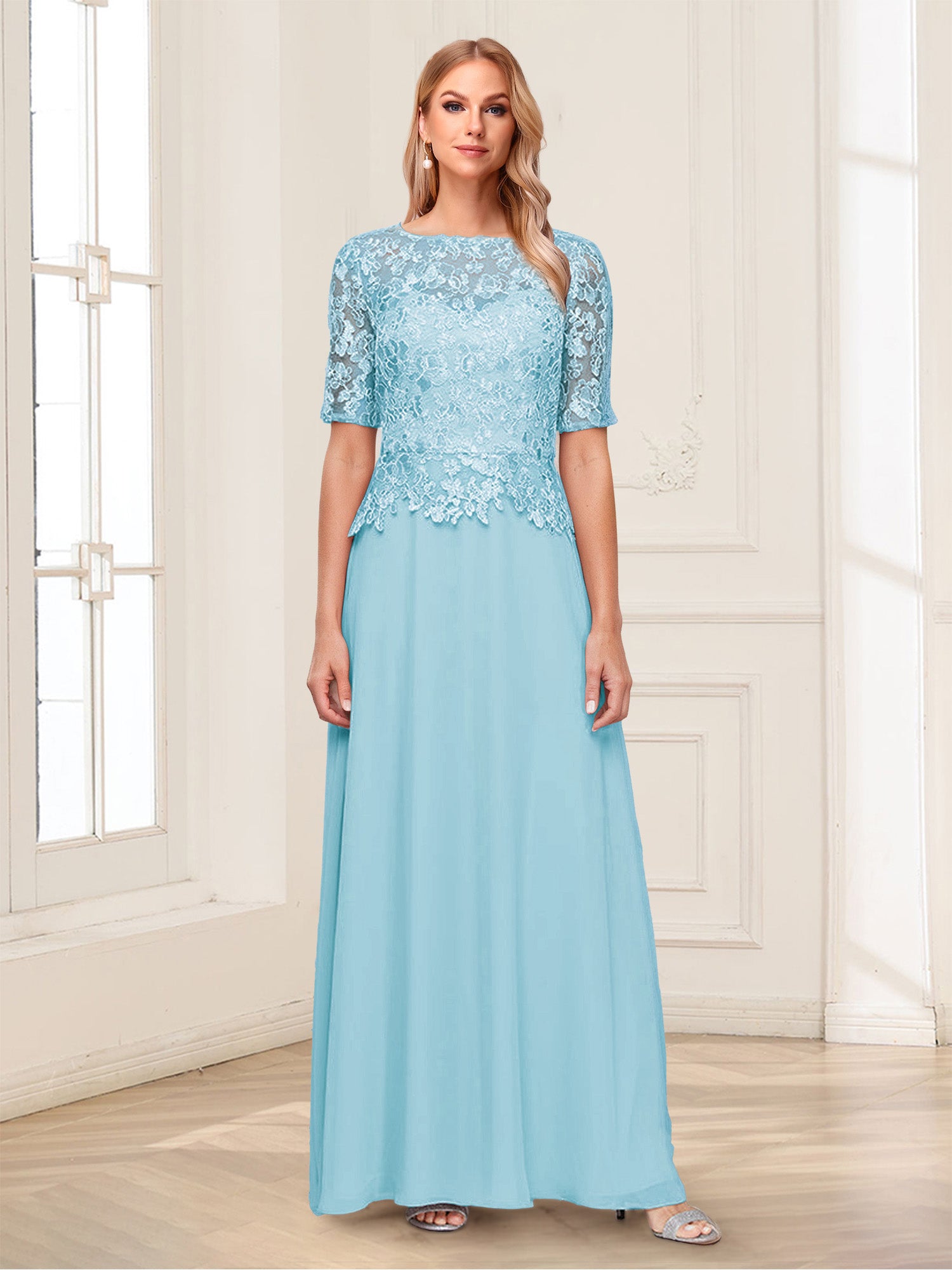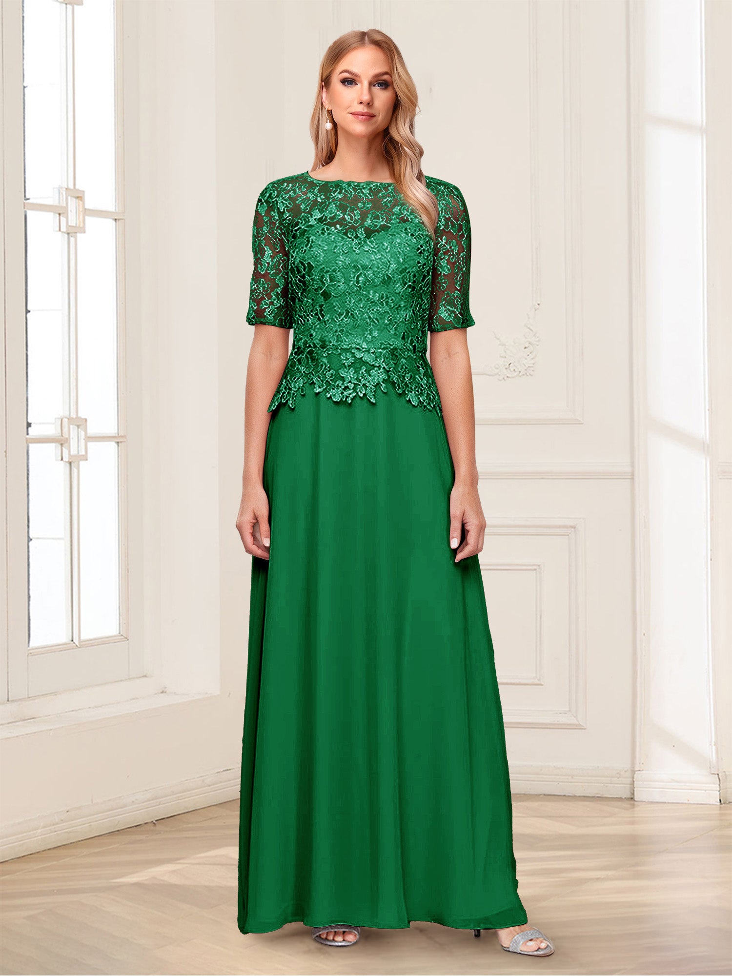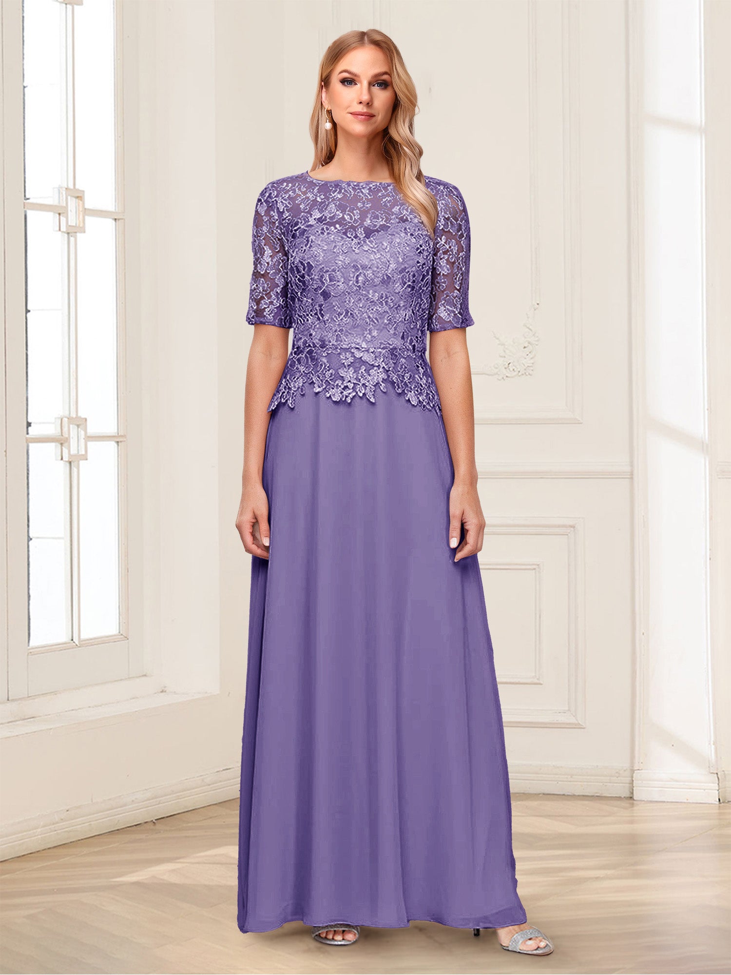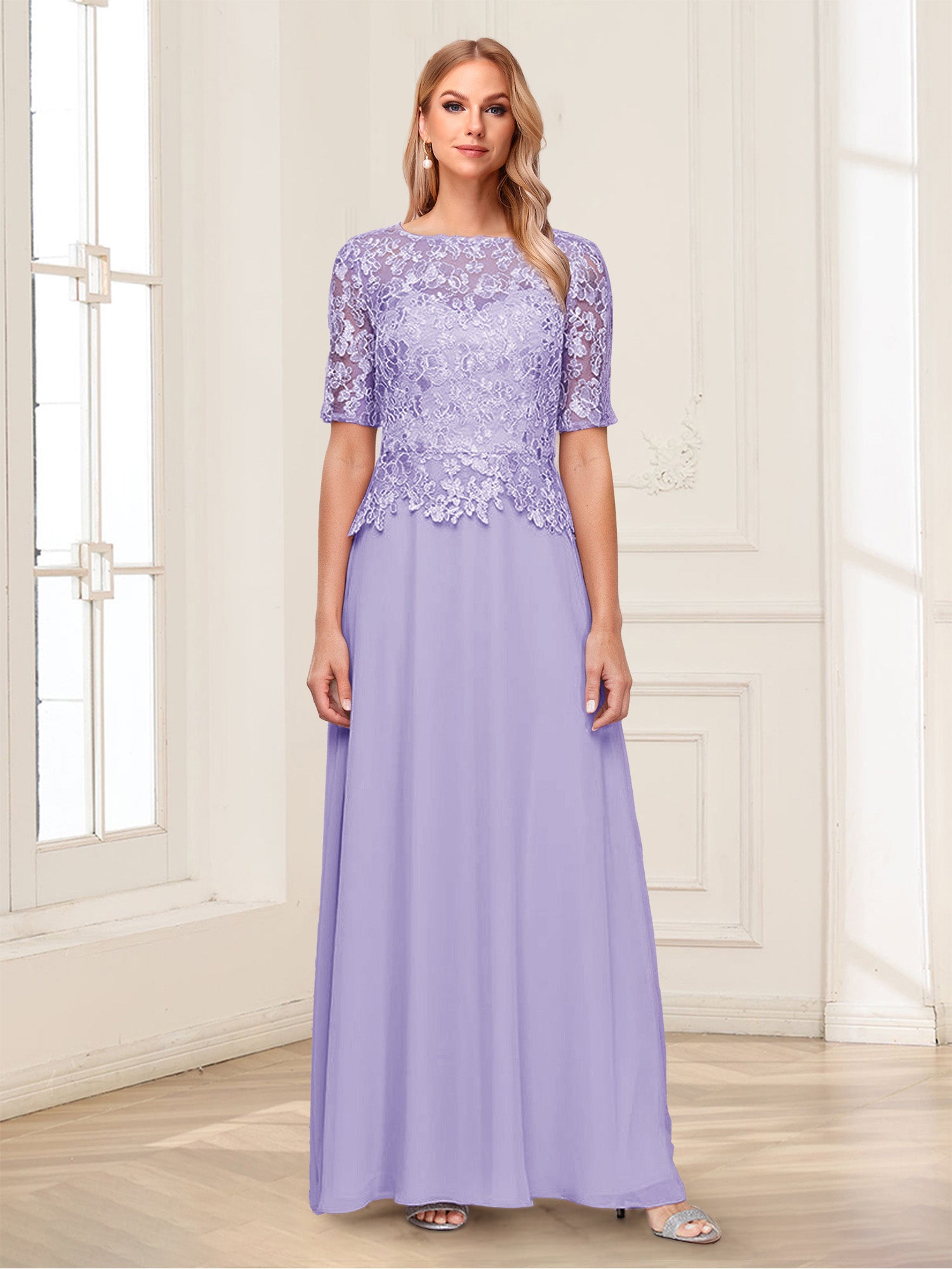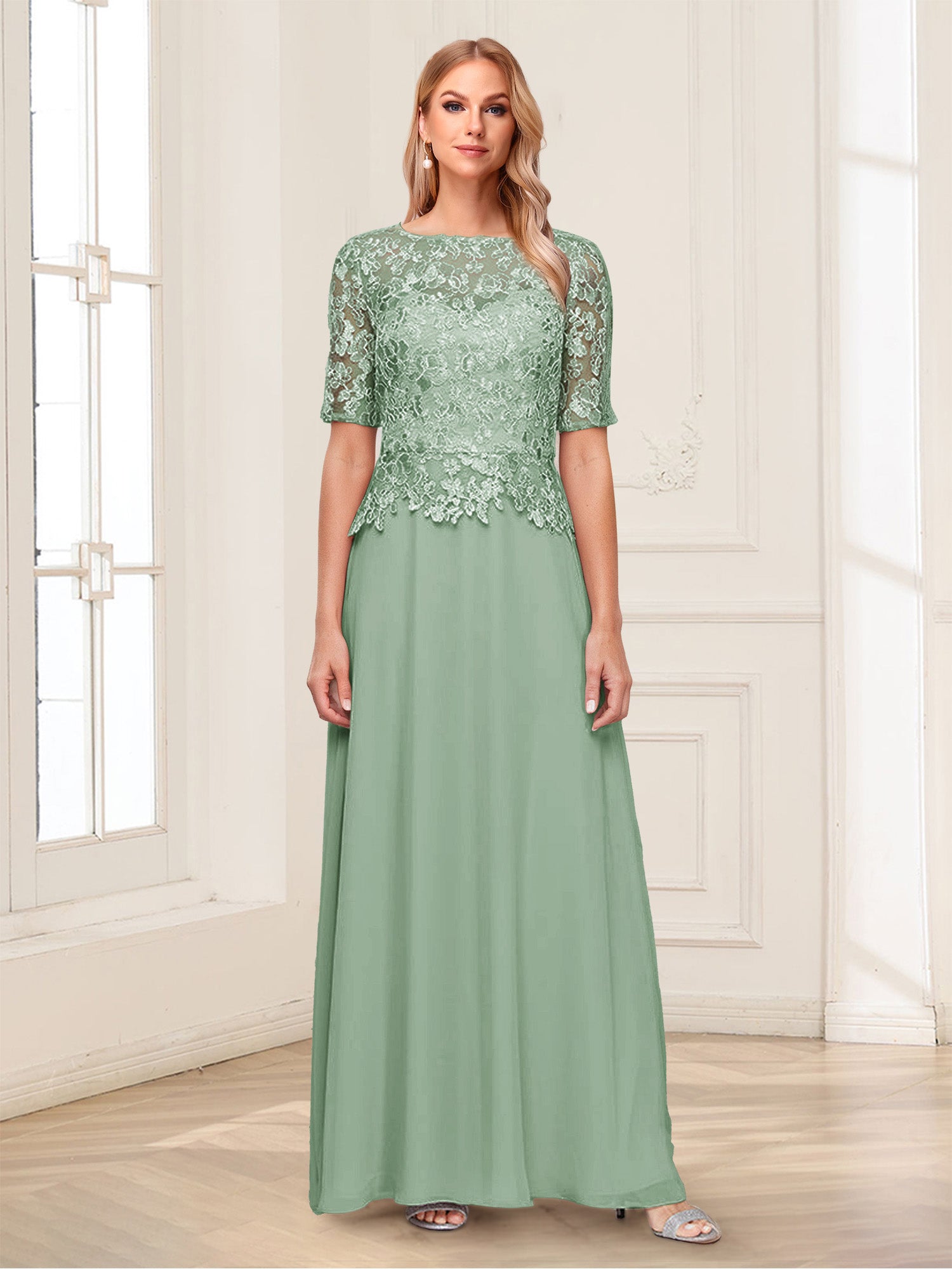 • A-Line/Princess Scoop Half Sleeves Floor-Length Mother of the Bride Dresses with Applique & Lace