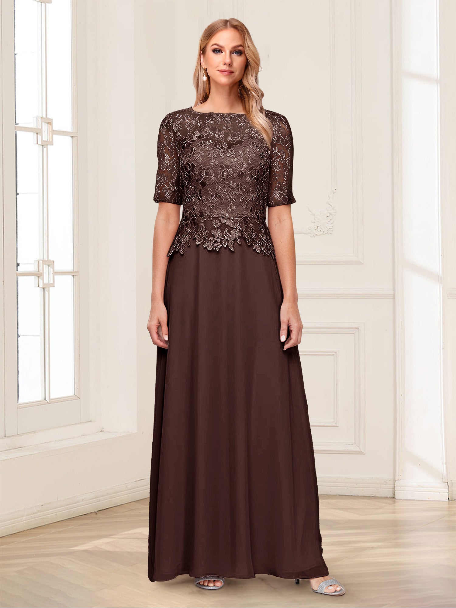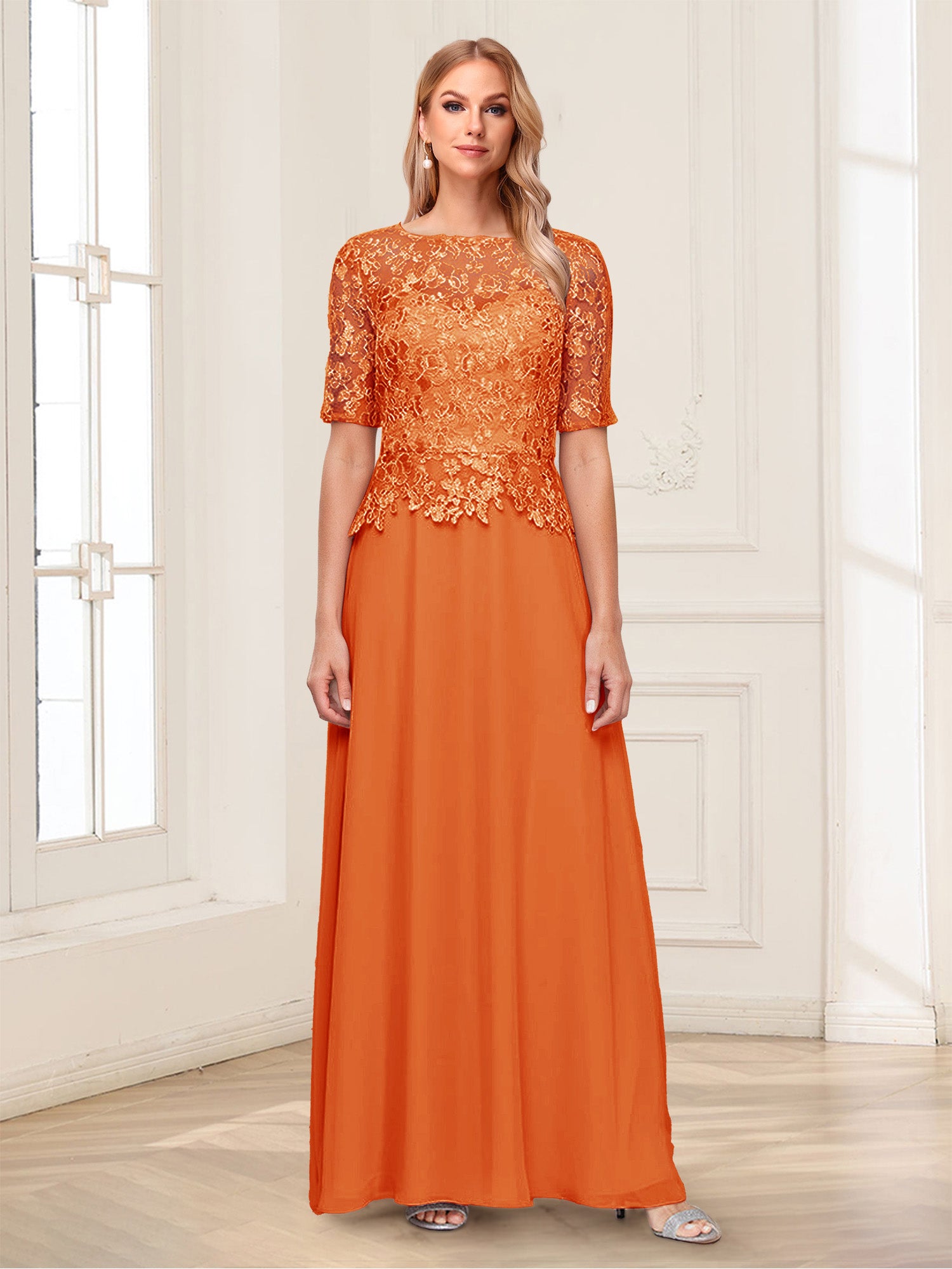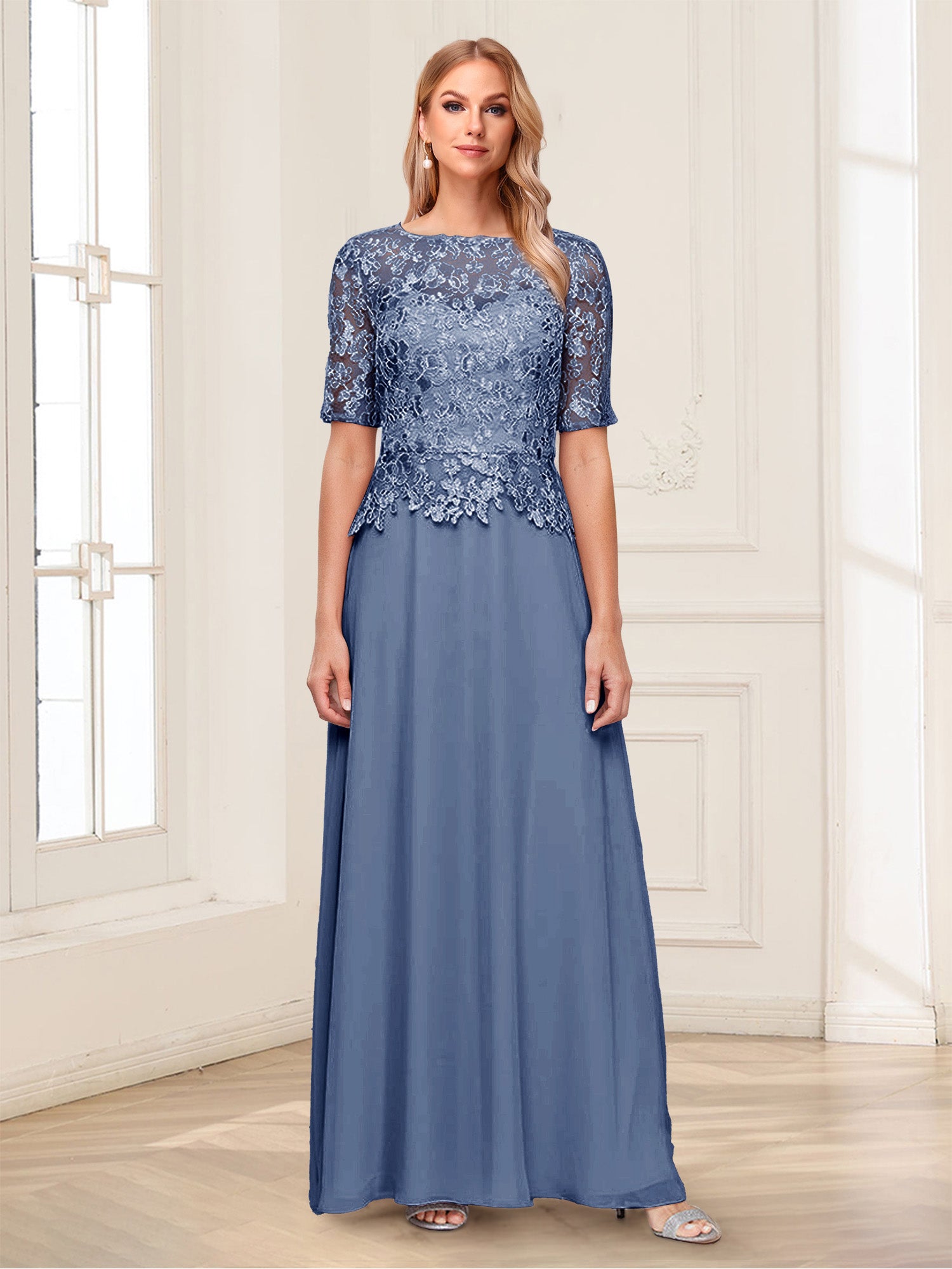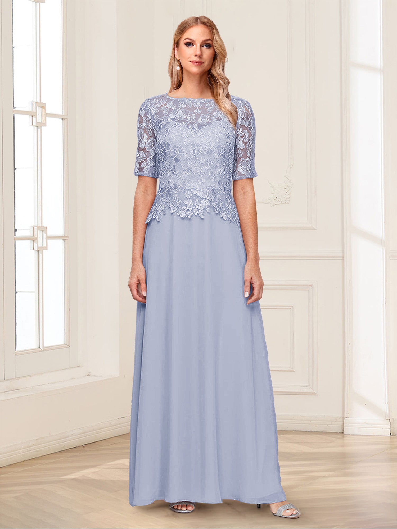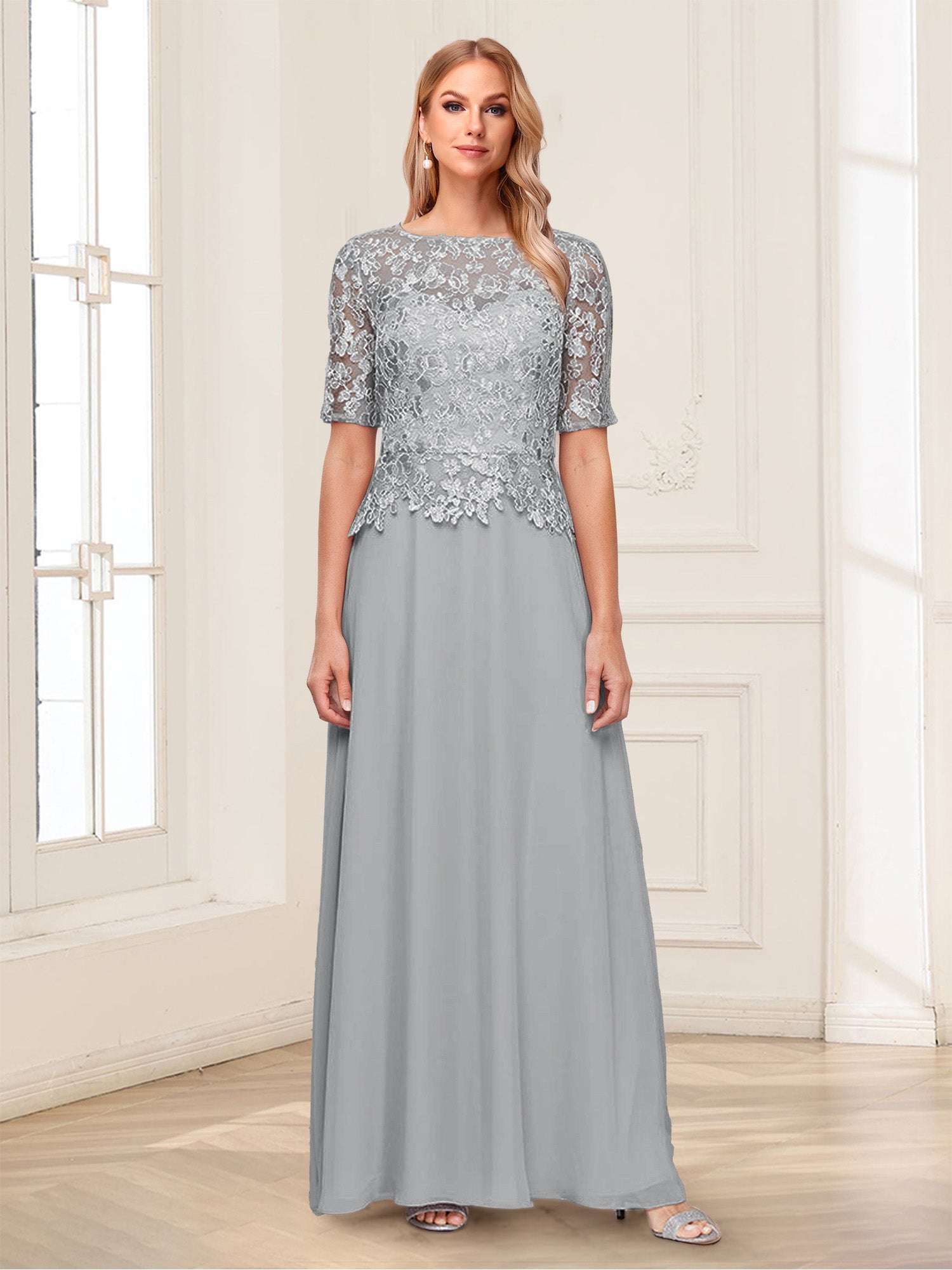 • A-Line/Princess Scoop Half Sleeves Floor-Length Mother of the Bride Dresses with Applique & Lace