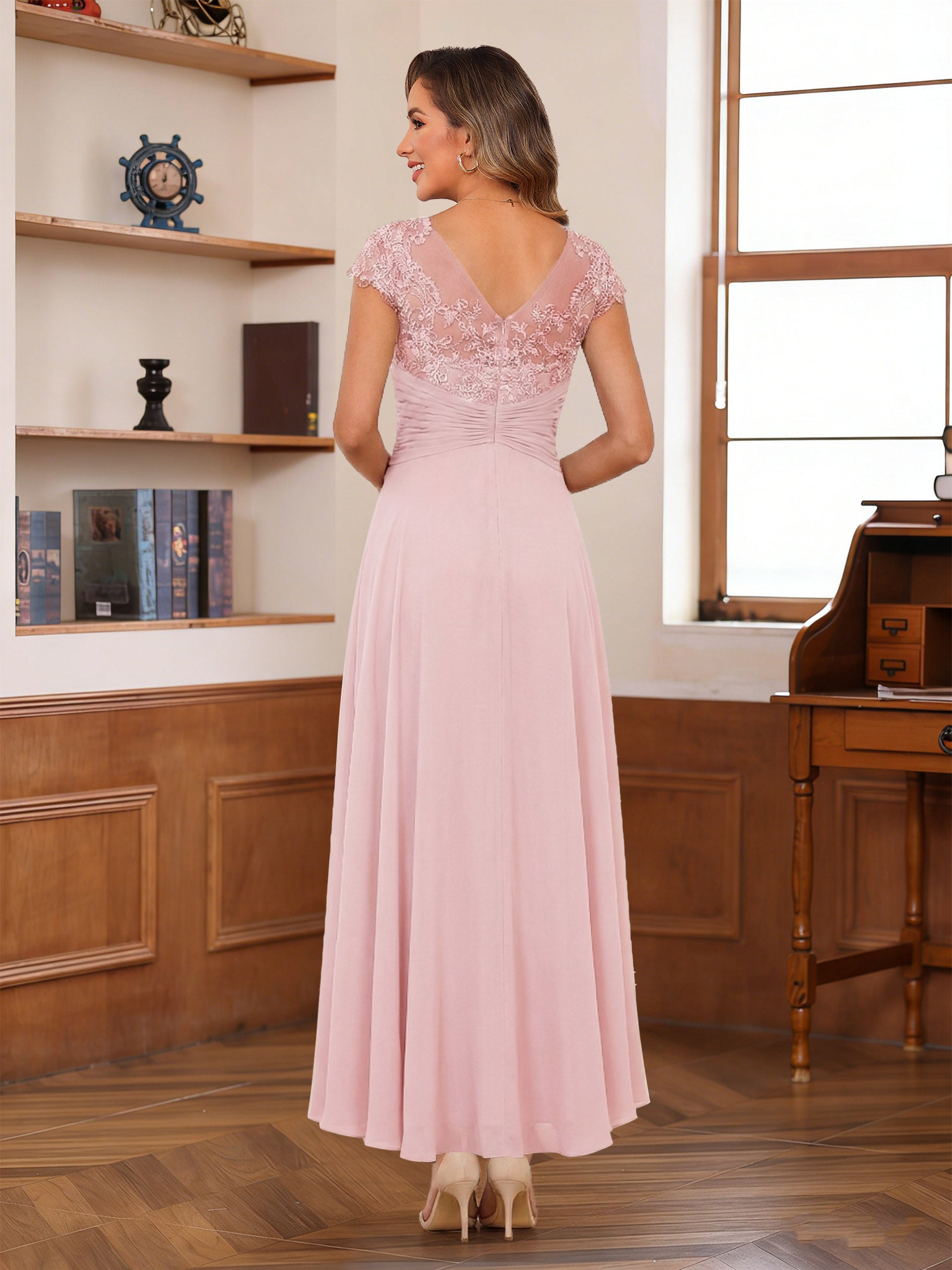• A-Line/Princess Scoop Short Sleeves Ankle-Length Mother of the Bride Dresses with Lace & Applique