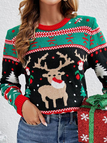 Knitted Pullover Crewneck Rib Knit Reindeer Jacquard Christmas Sweater