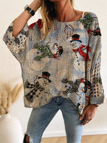 Women's Soft Crocheted Crew Neck Long Sleeves Christmas Sweater