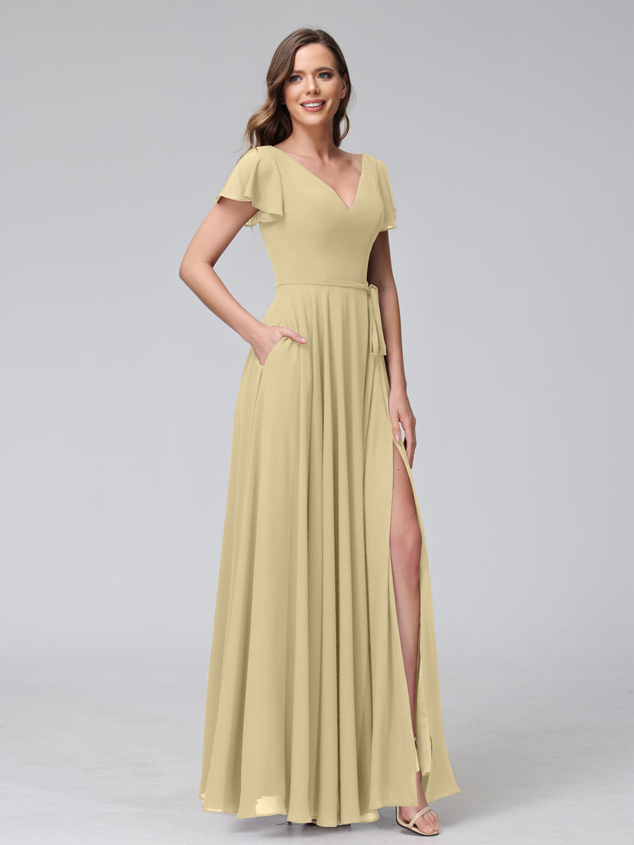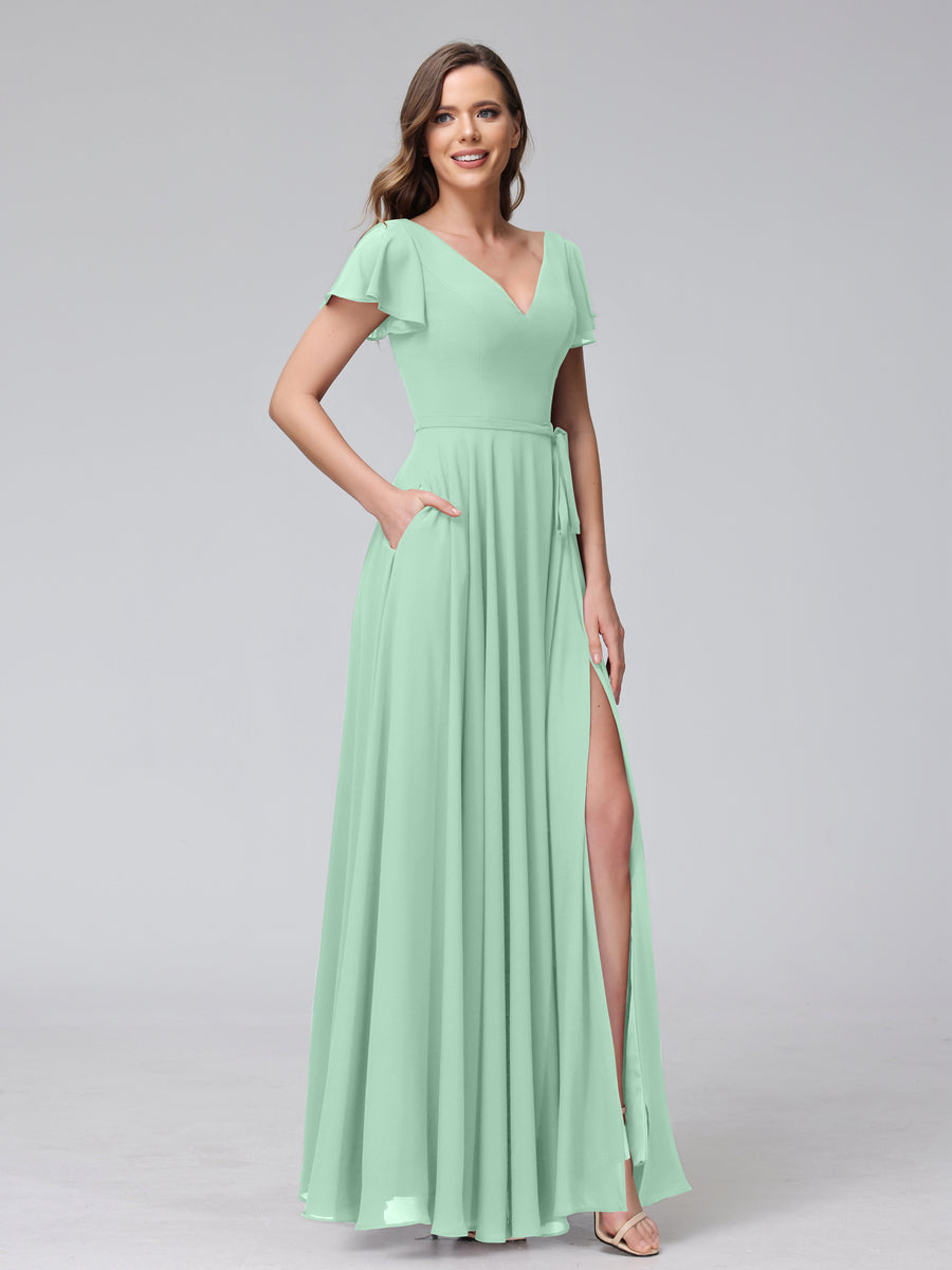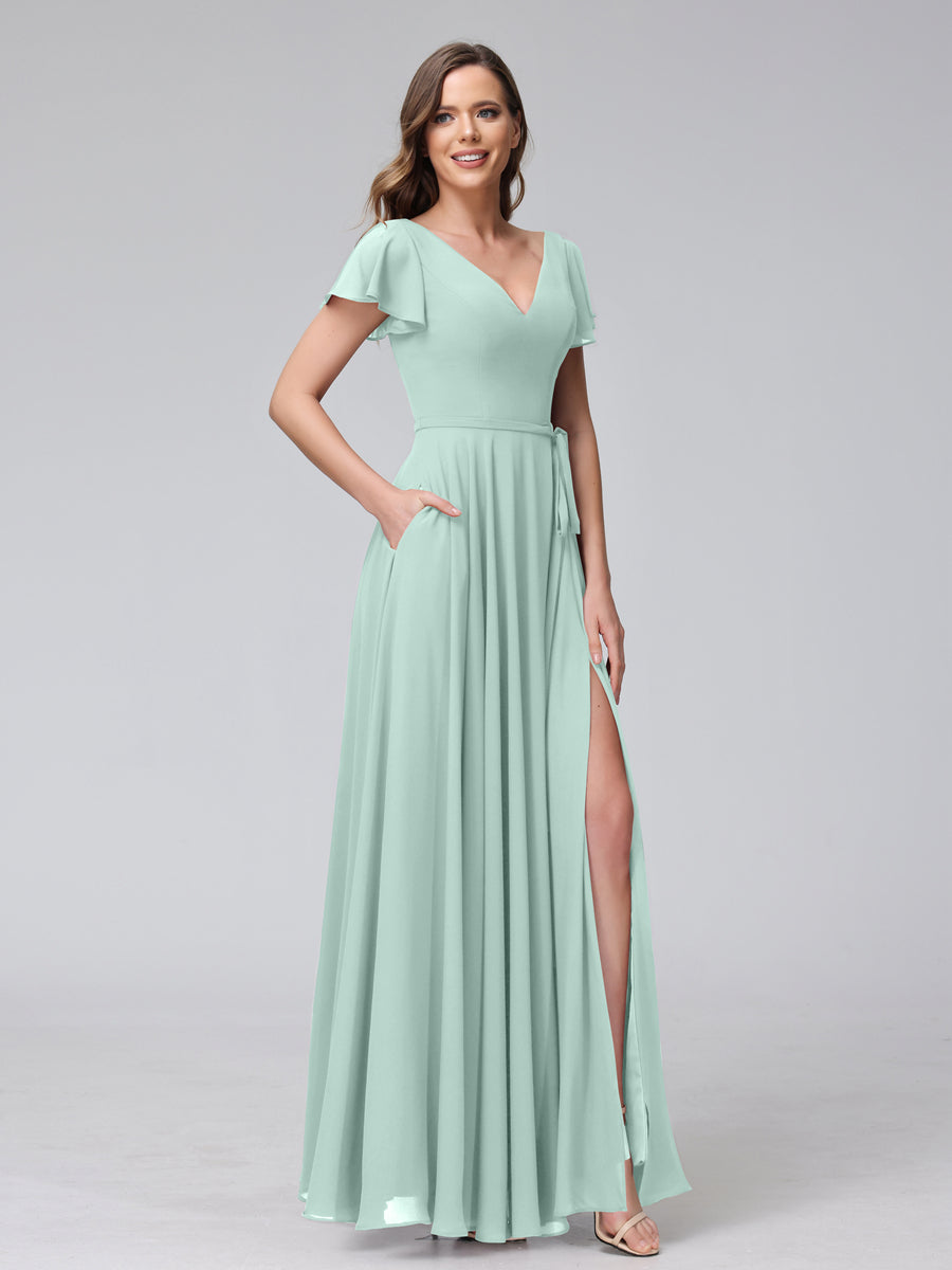 #Aaliyah 9816217 A-Line V-Neck Ruffles Short Sleeves Long Chiffon Dresses With Split Side & Pockets
