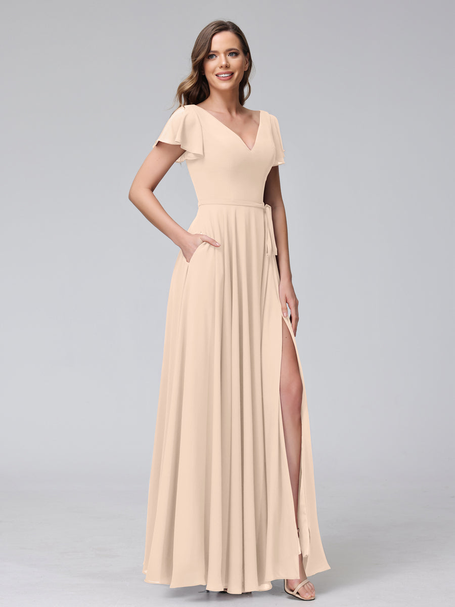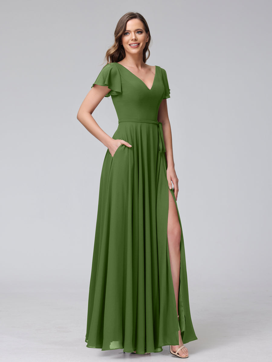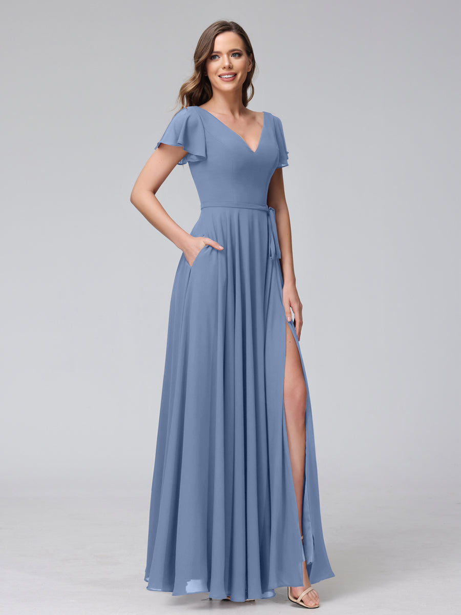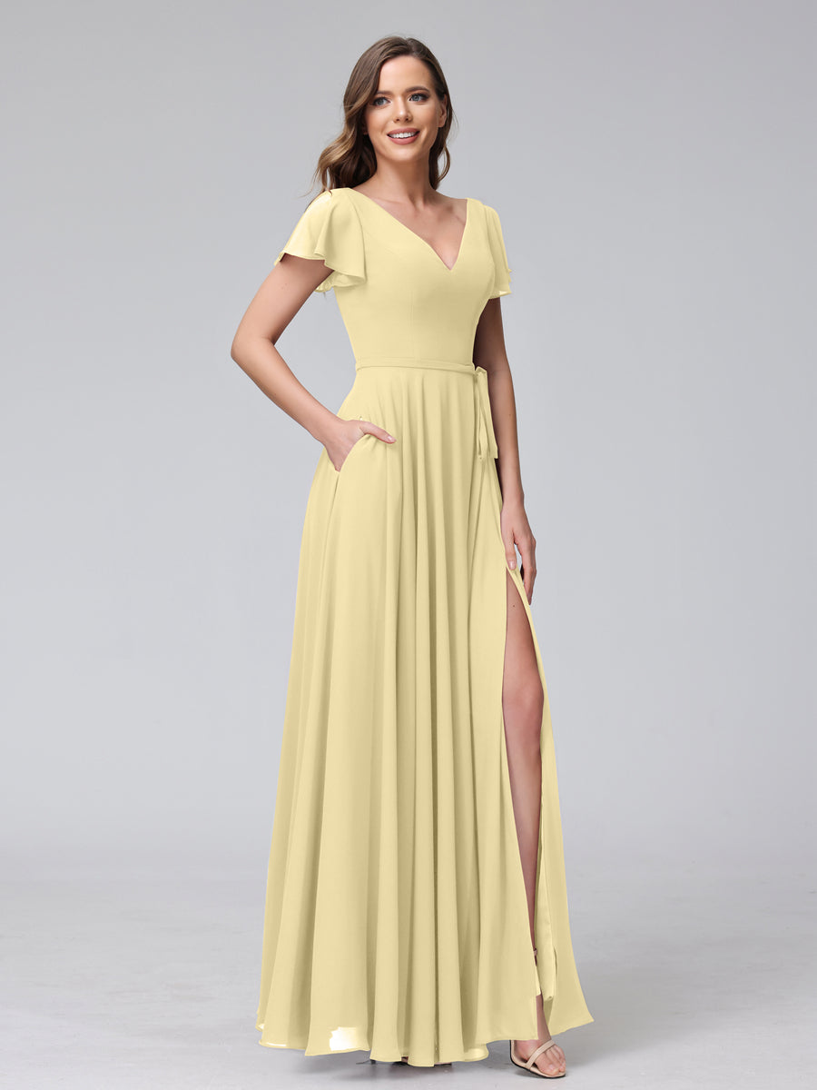 #Aaliyah 9816217 A-Line V-Neck Ruffles Short Sleeves Long Chiffon Dresses With Split Side & Pockets