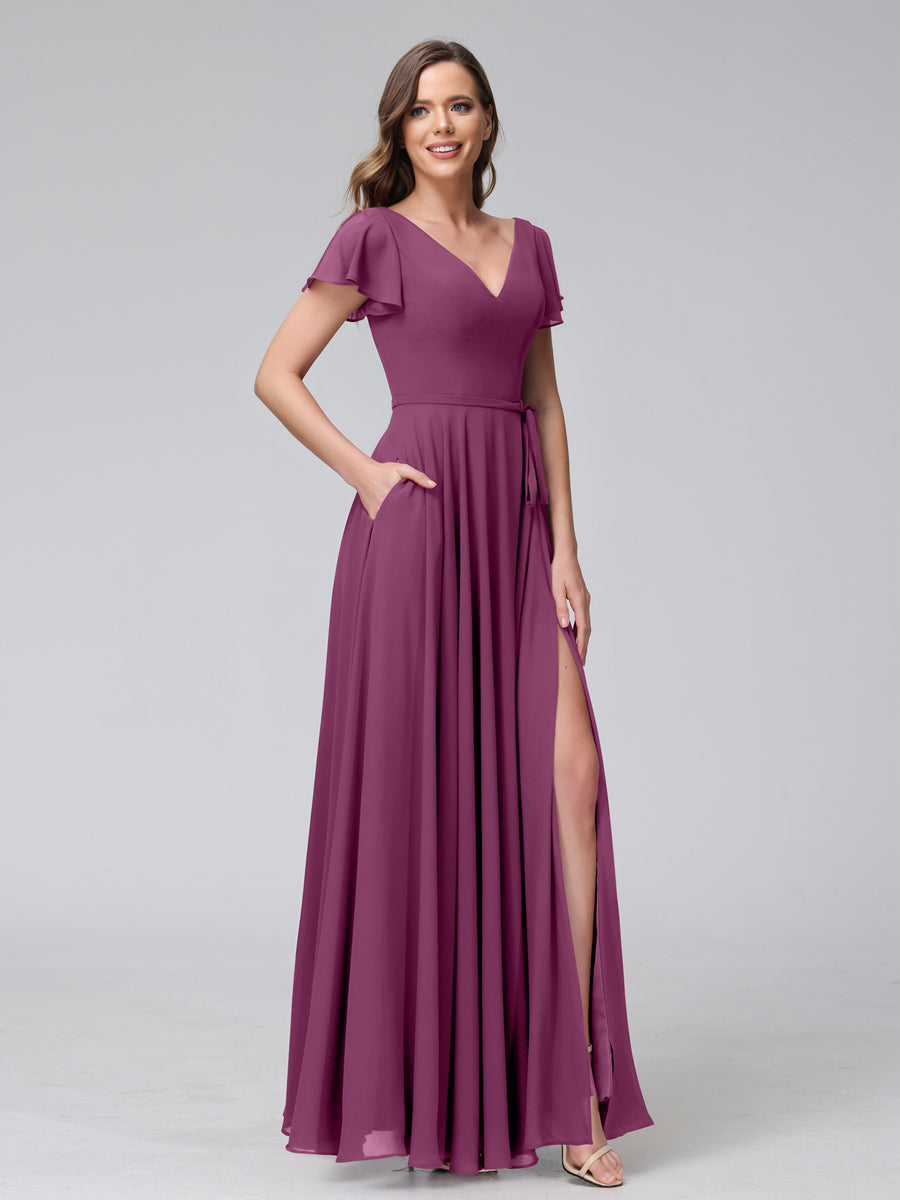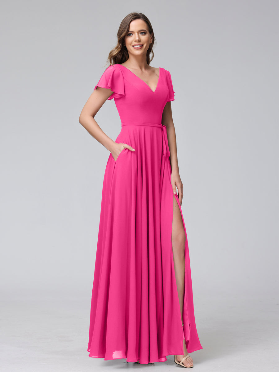 • A-Line V-Neck Ruffles Short Sleeves Long Chiffon Dresses With Split Side & Pockets