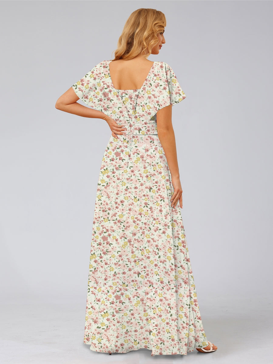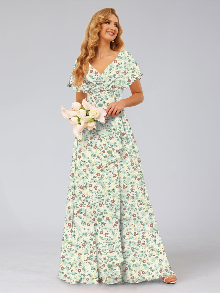 #Attempt 99091007 A-Line/Princess V-Neck Short Sleeves Ruffles Floral Bridesmaid Dresses