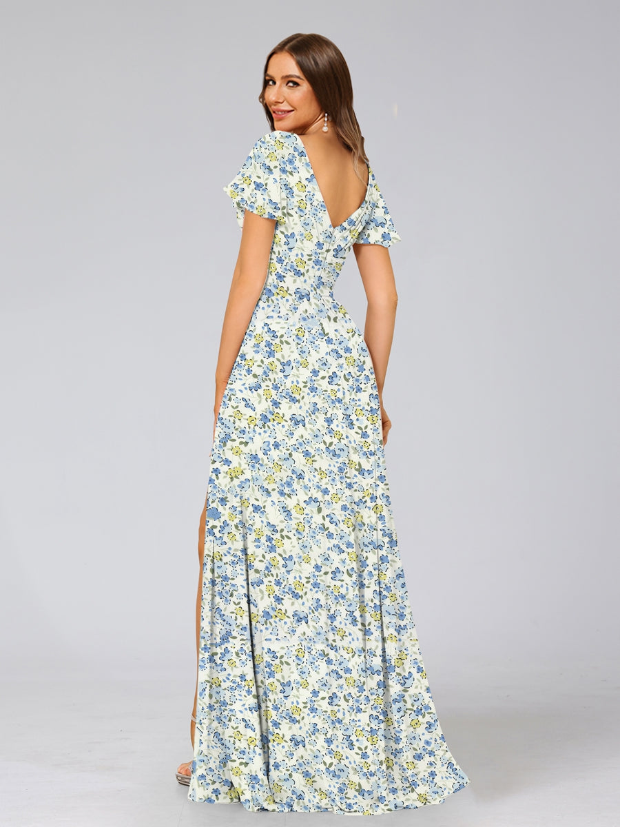 #Demonstrate 99091021 A-Line/Princess V-Neck Short Sleeves Split Side Floral Bridesmaid Dresses