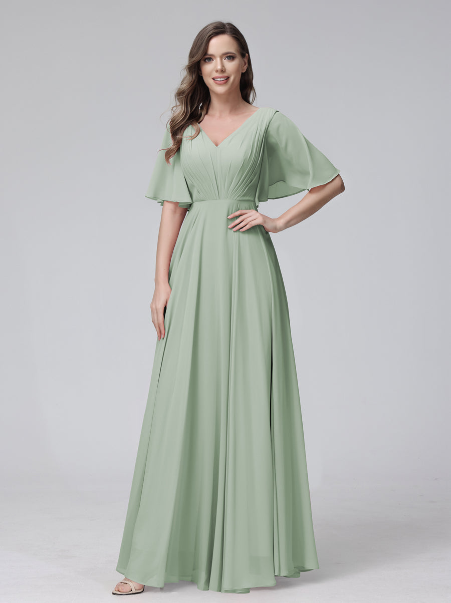 • A-Line V-Neck Half Sleeves Long Chiffon Bridesmaid Dresses With Ruffles Pockets