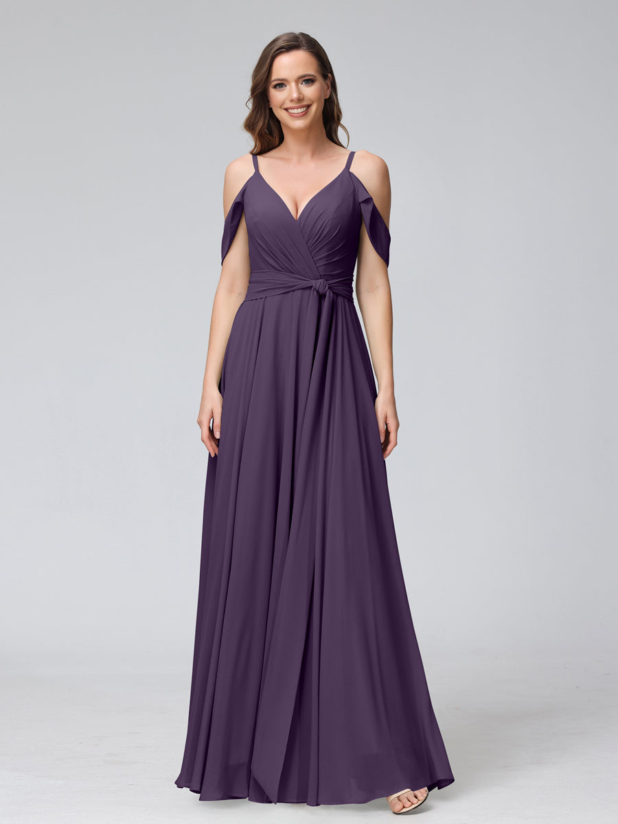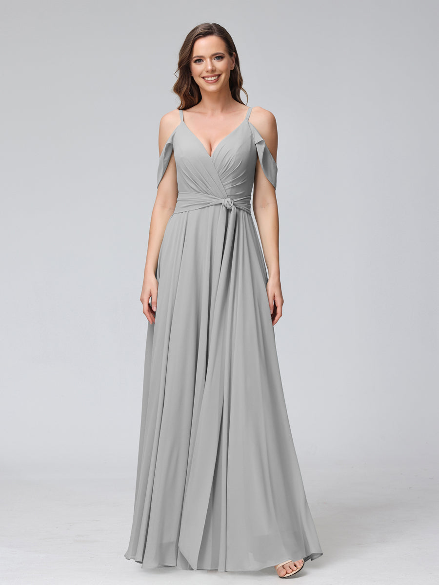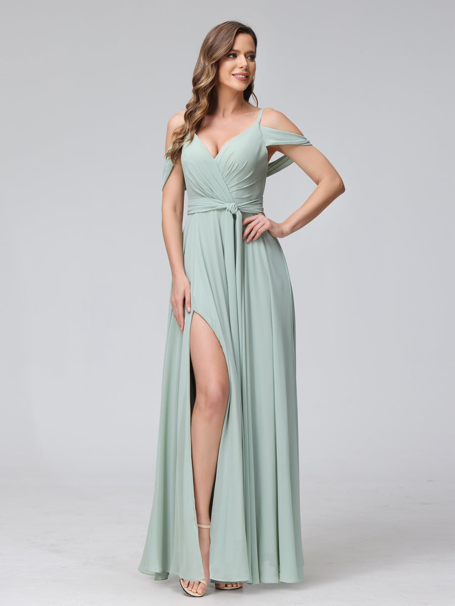 #Hayley 9816212 A-Line V-Neck Short Sleeves Chiffon Bridesmaid Dresses with Spaghetti Straps & Split Side