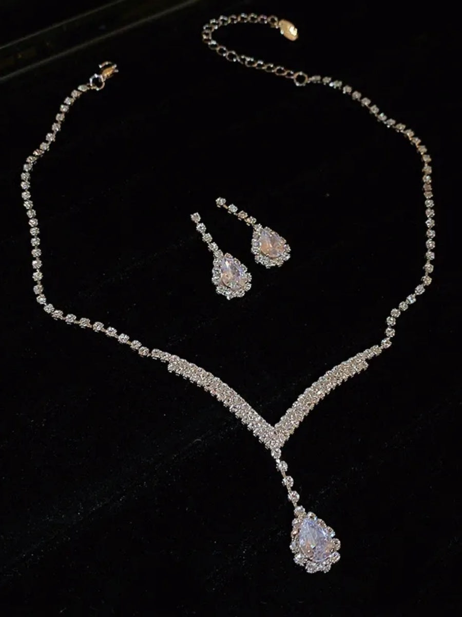 #2141033 Crystal-Accented Waterdrop V-Shape Pendant Necklace & Stud Earrings 2-Piece Set
