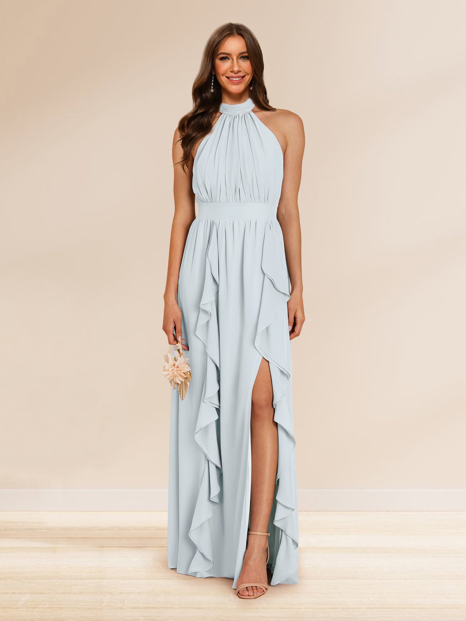 #Mona 12011785 Chiffon A-Line/Princess Halter Bridesmaid Dresses with Split Side & Ruffles
