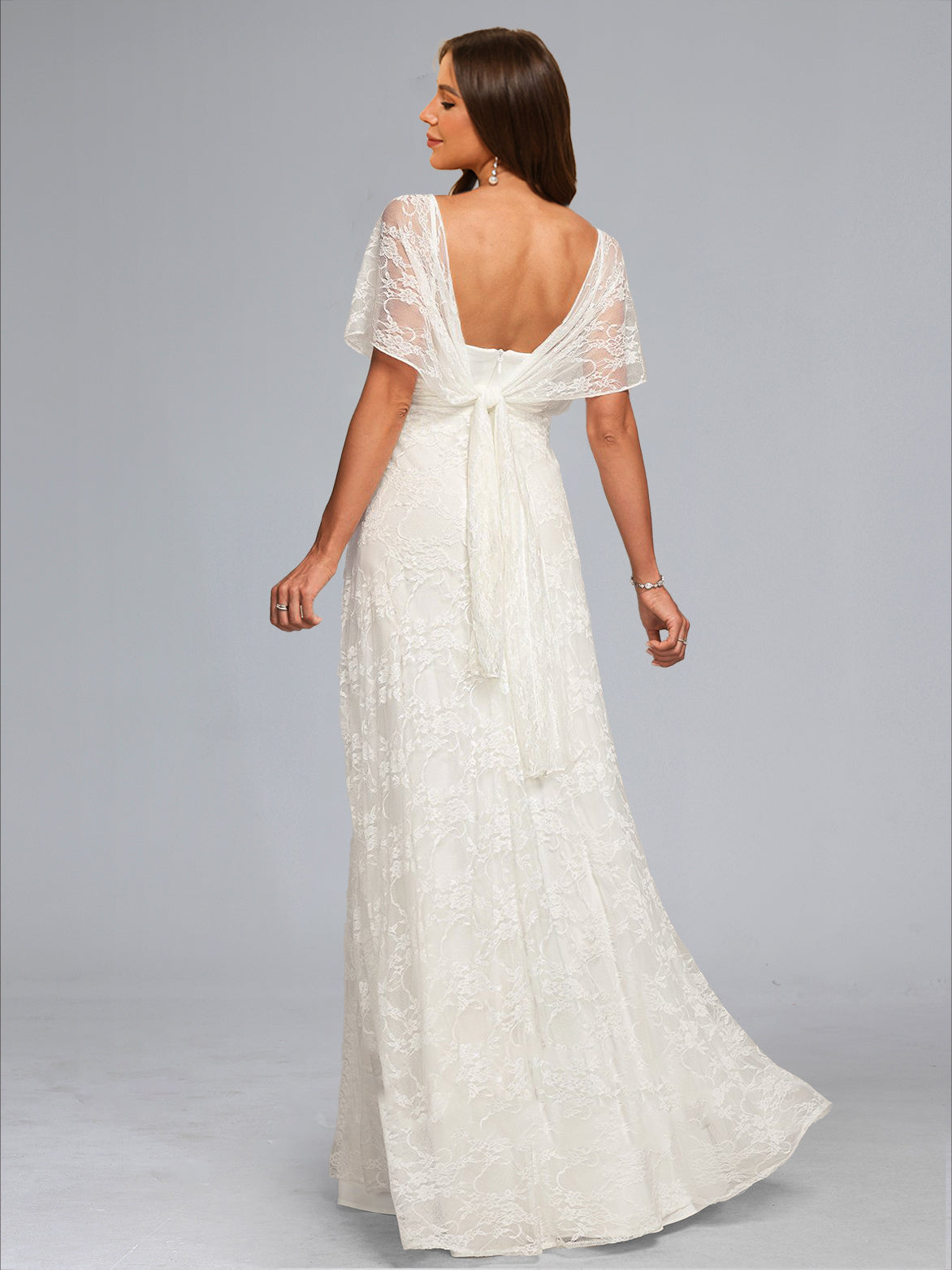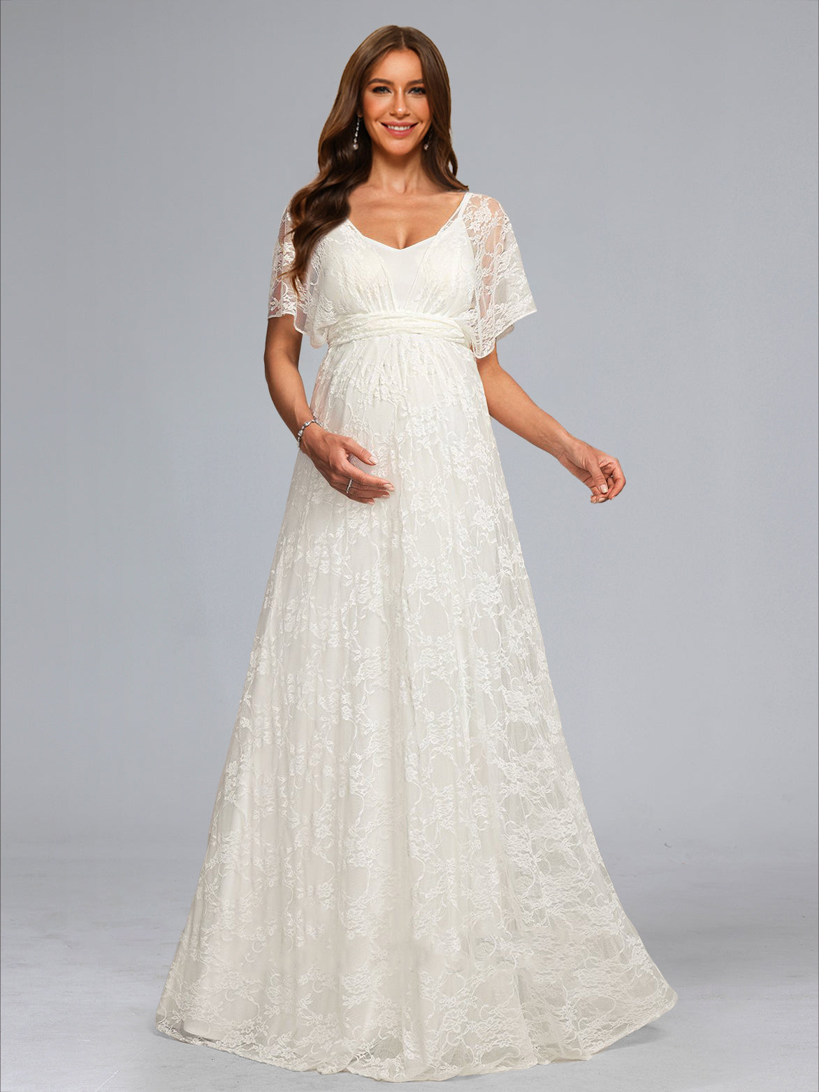 #Melville 9910118 A-Line/Princess V-Neck Floor-Length Short Sleeves Lace Baby Shower Wedding Dresses