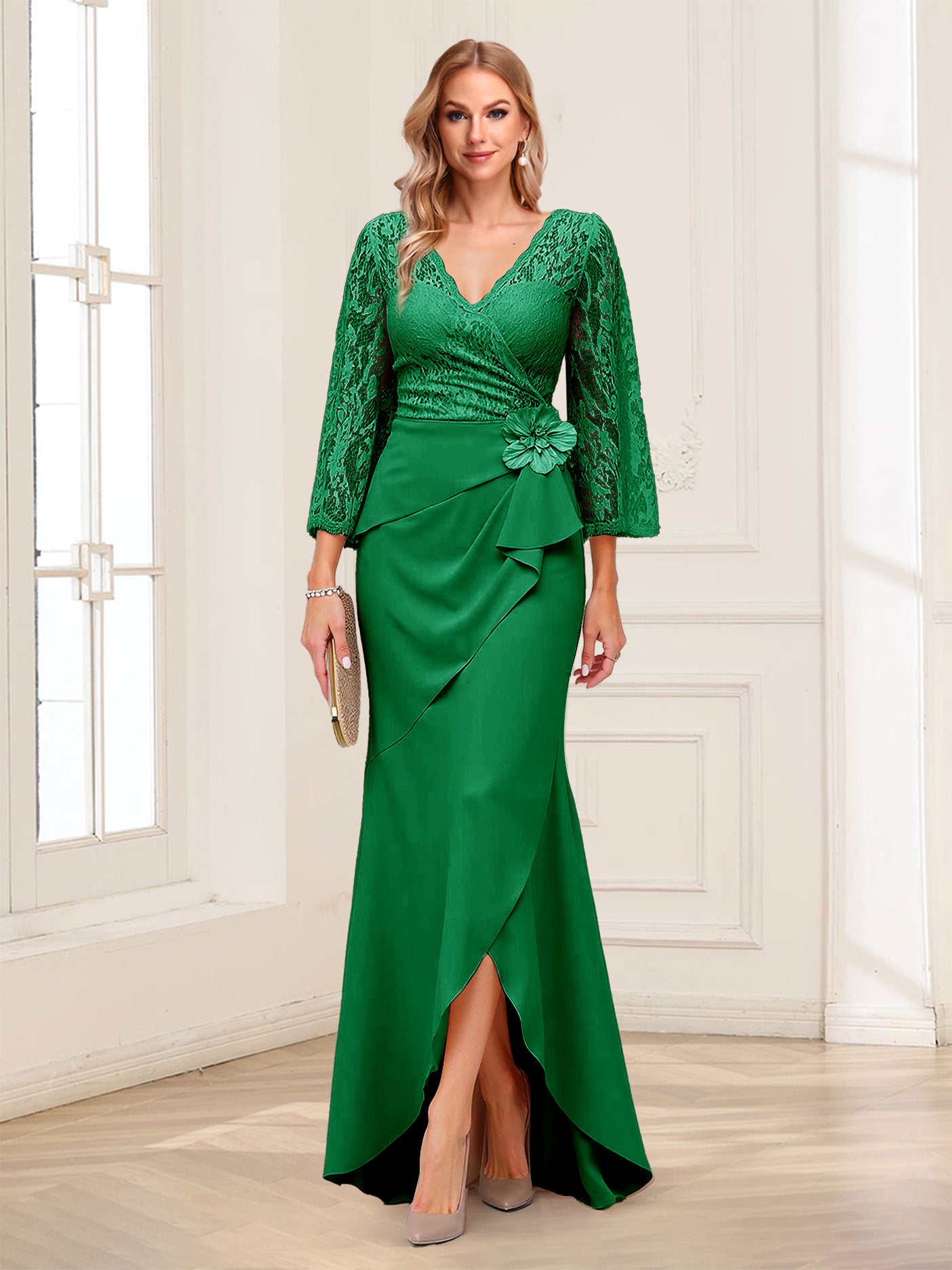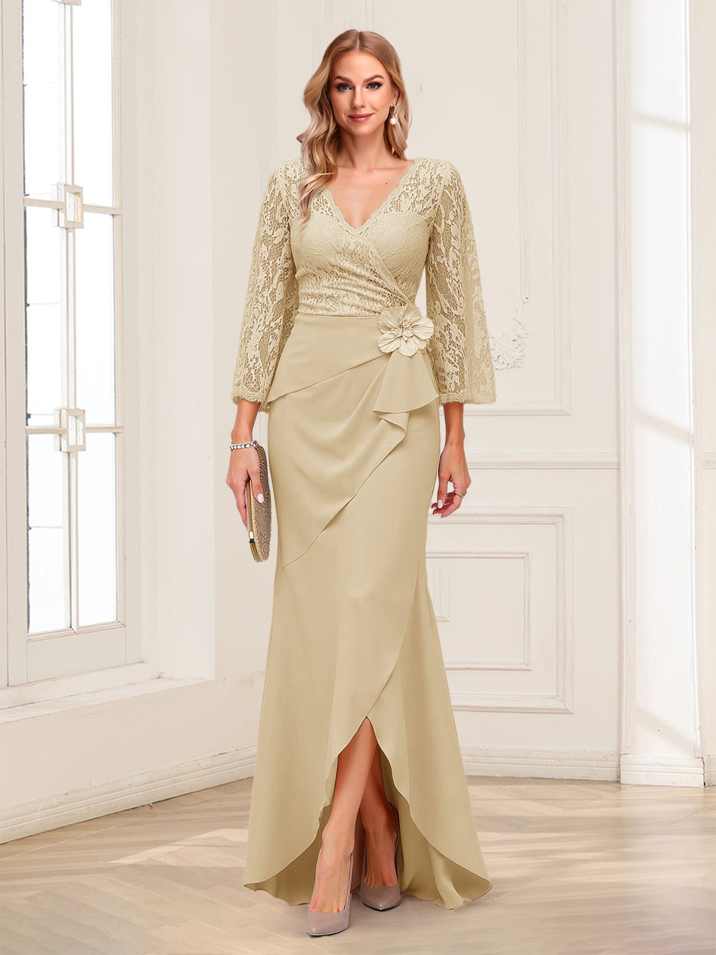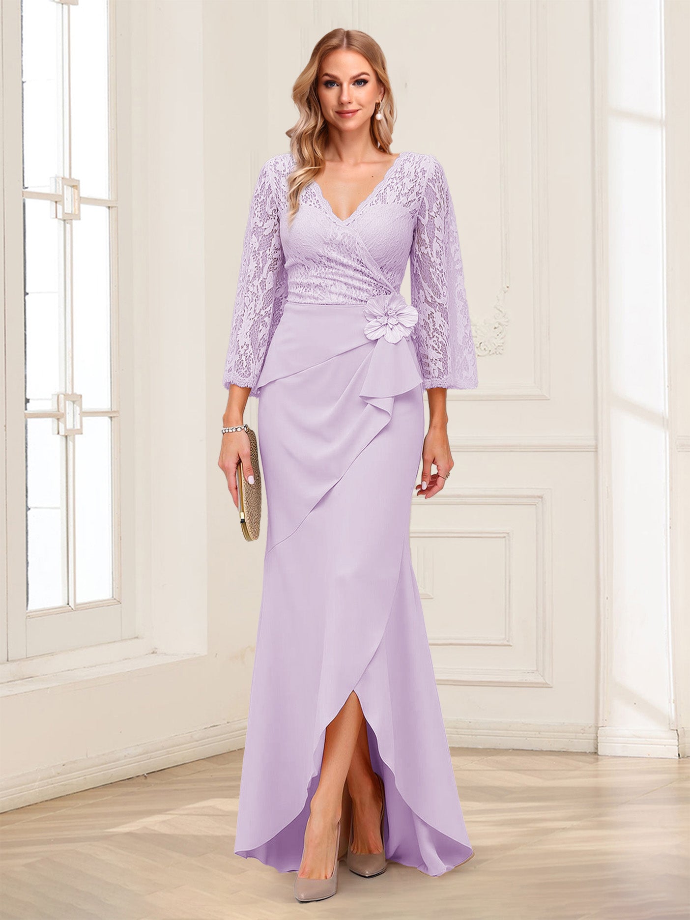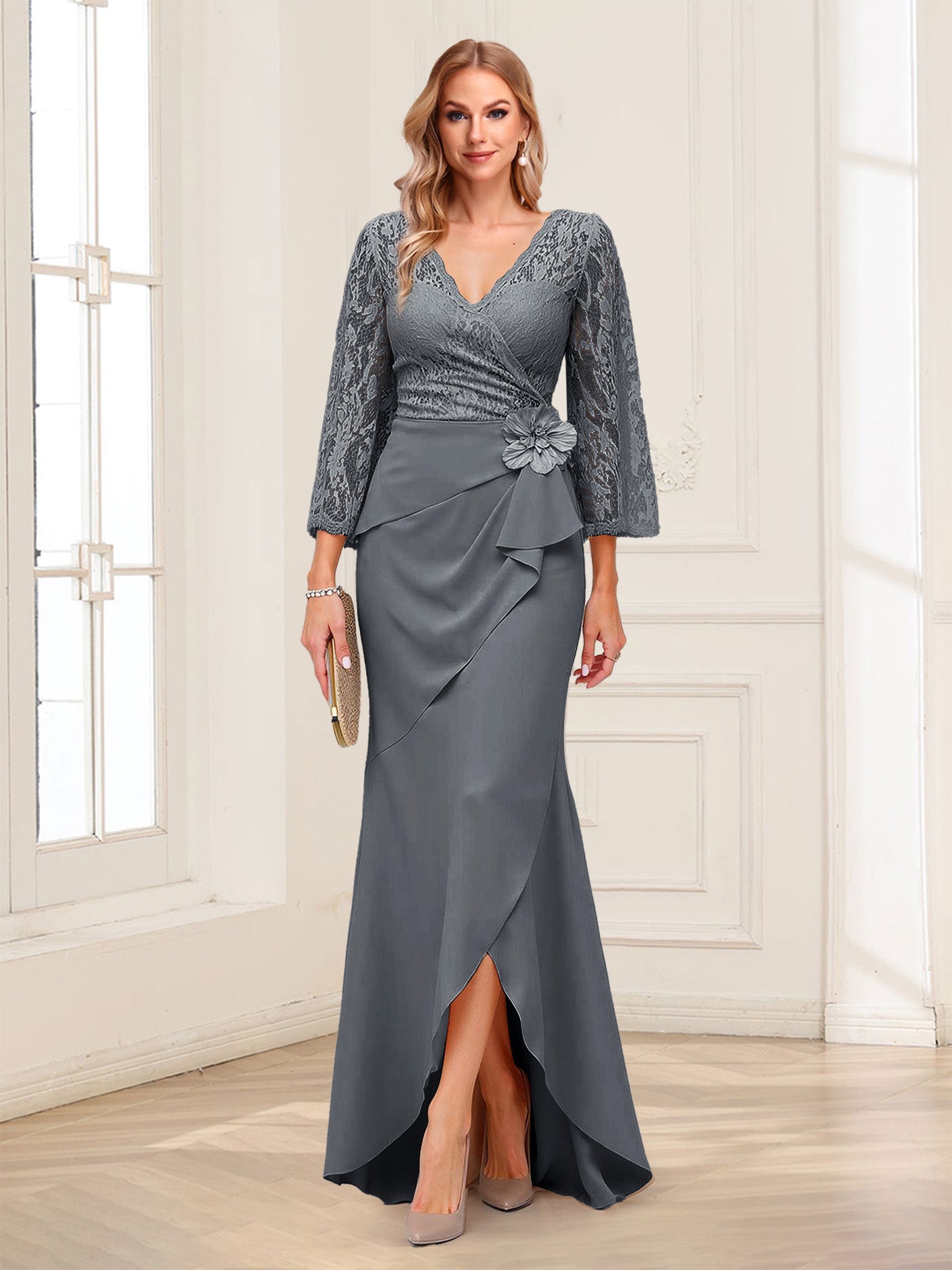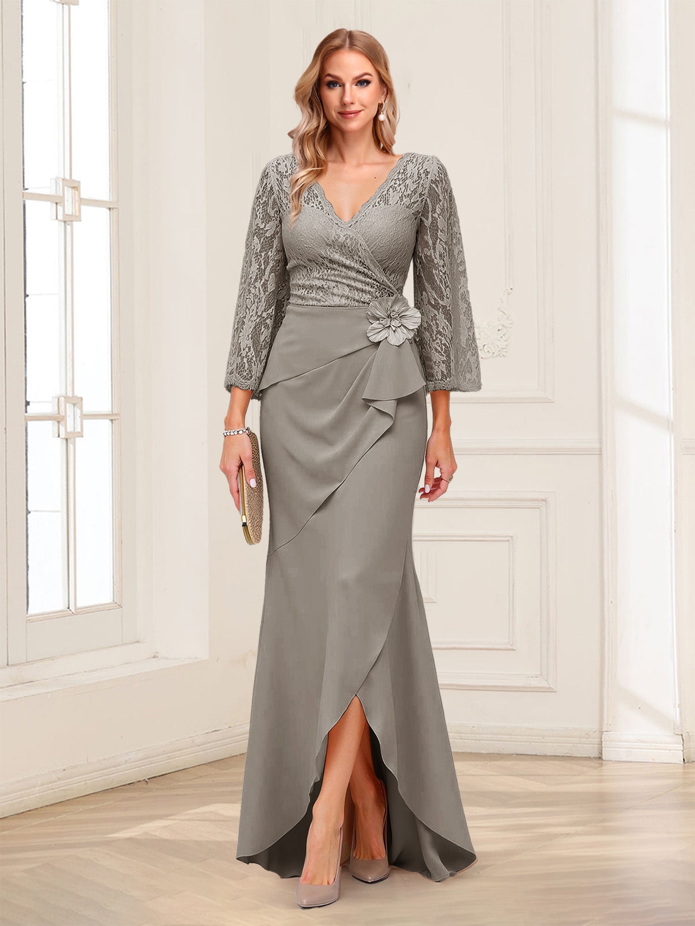 #Alfred 12011718 Sheath/Column V-Neck 3/4 Sleeves Mother of the Bride Dresses With Lace & 3D Floral