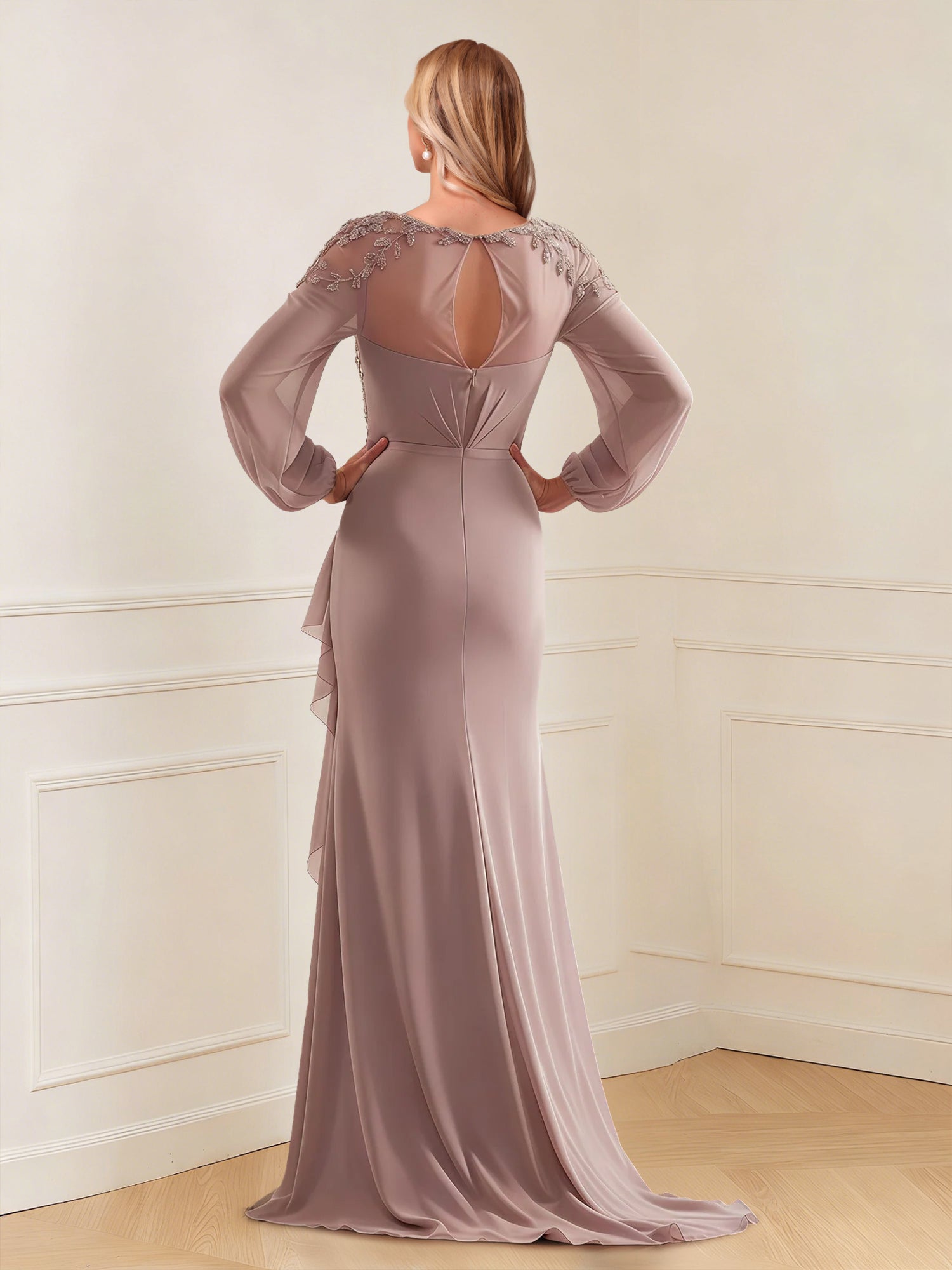 #Brenna 12011932 Sheath/Column V-Neck Long Sleeves Floor-Length Mother of the Bride Dresses with Lace & Applique